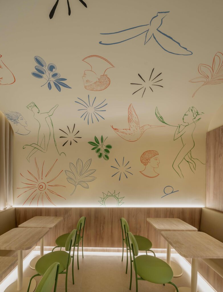 Dans un espace lumineux au design inspiré des oliveraies grecques, cette nouvelle adresse propose :