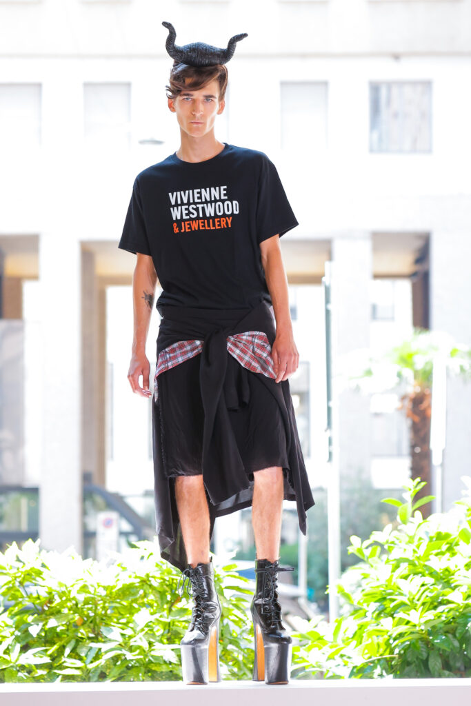 La collection masculine printemps-été 2026 de Vivienne Westwood marque un véritable retour aux présentations en solo — une première depuis 2017. Le défilé s’est tenu dans le mythique Bar Rivoli, situé à deux pas de San Babila, autrefois cœur battant de Fiorucci et aujourd’hui lieu de passage incontournable pour les Milanais amoureux de mode. Intitulée « Colazione da Andreas », la collection évoque l’élégance insouciante et la convivialité d’un petit-déjeuner estival à Milan.