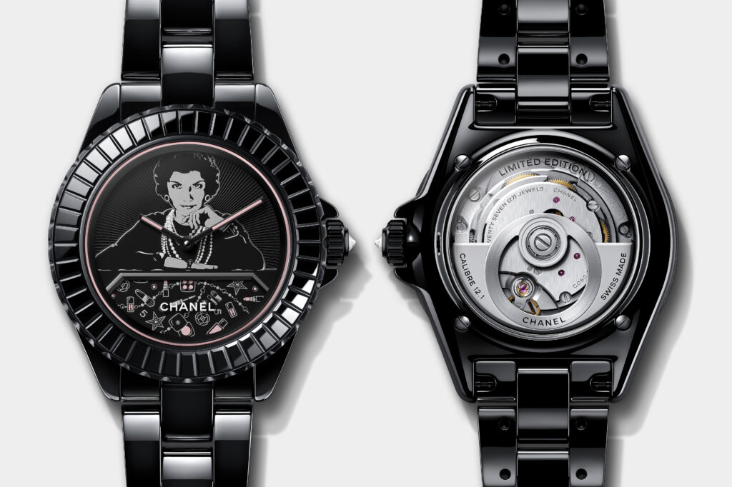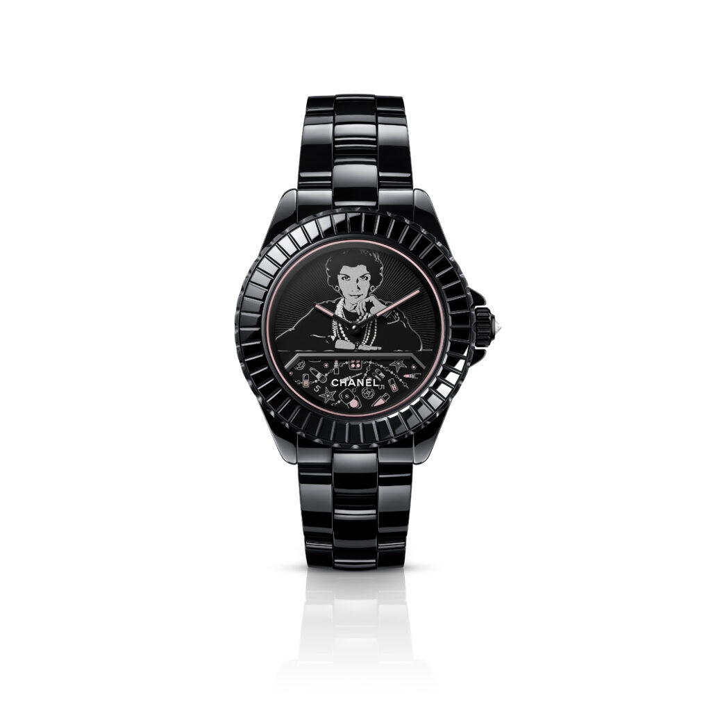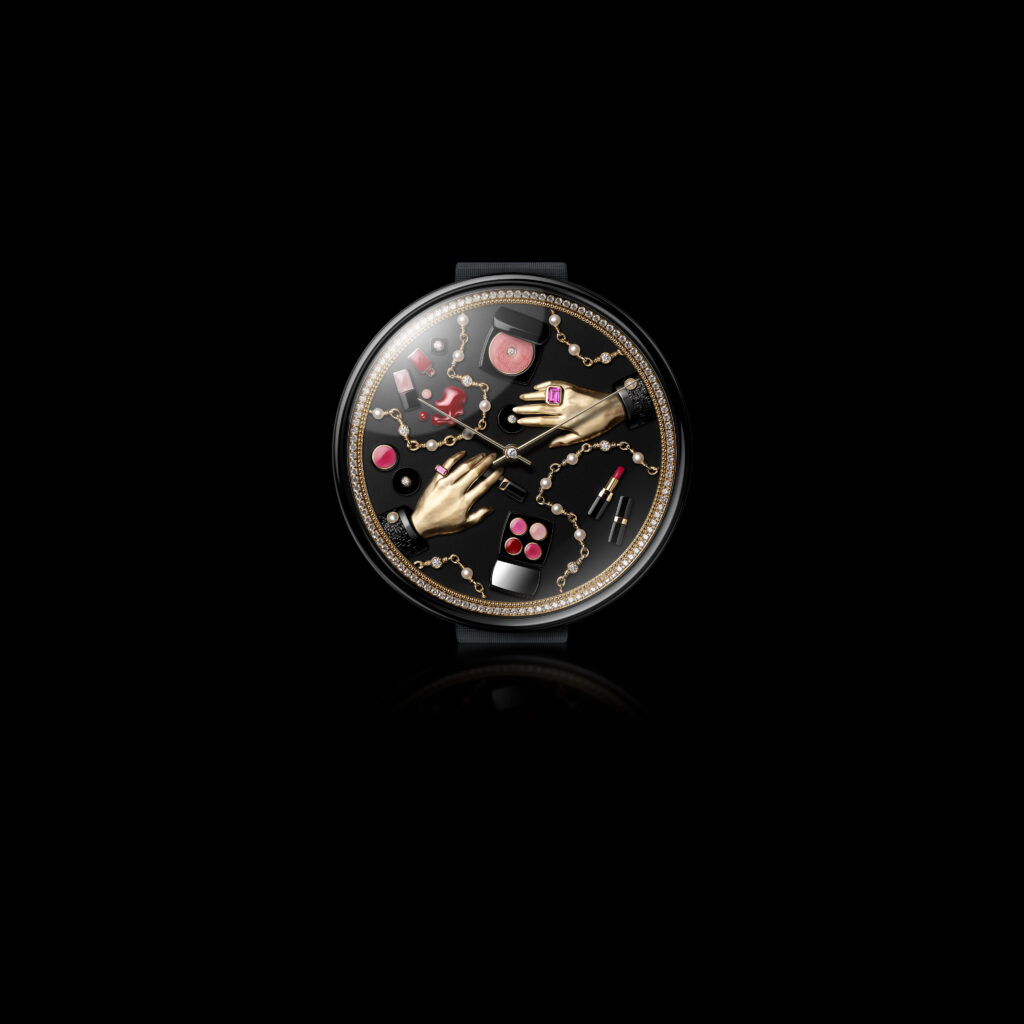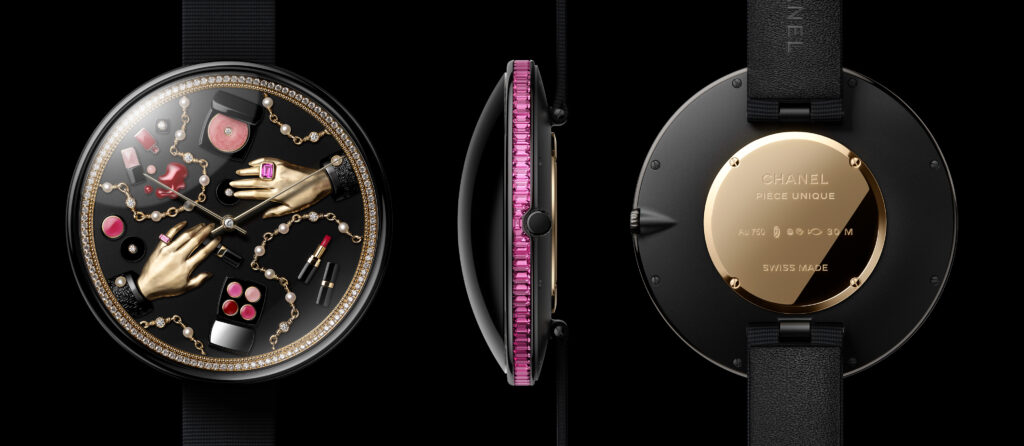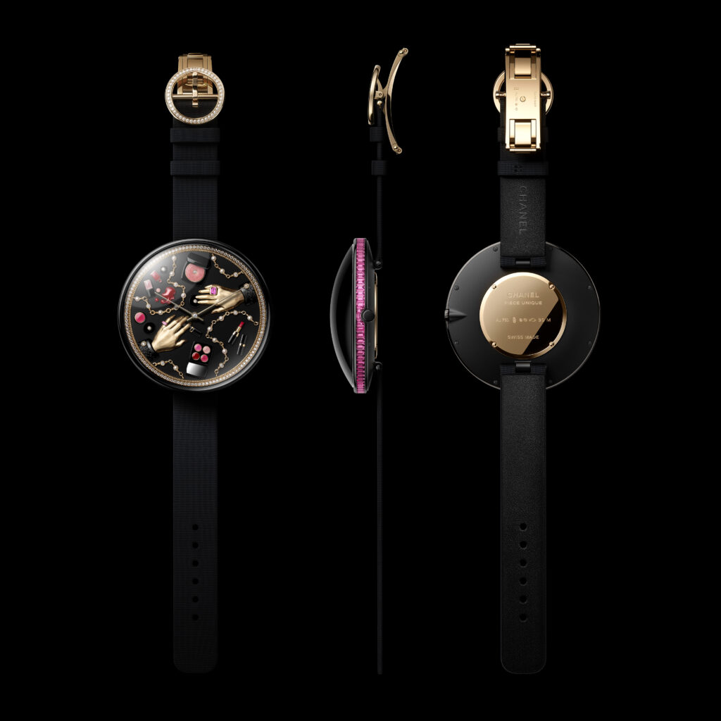 Gabrielle Chanel elle-même est mise en scène, en noir et blanc, face à sa coiffeuse. Un disque rotatif, parcourant un cycle de 5 minutes, anime un nécessaire de maquillage en tons poudrés et rosés. Cadran noir, lunette baguette, boîtier en céramique noire : tout concourt à faire de cette pièce un objet de désir graphique, animé par le Calibre 12.1 certifié COSC, produit par Kenissi.