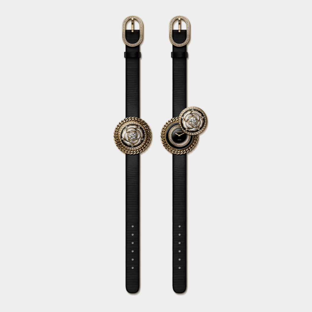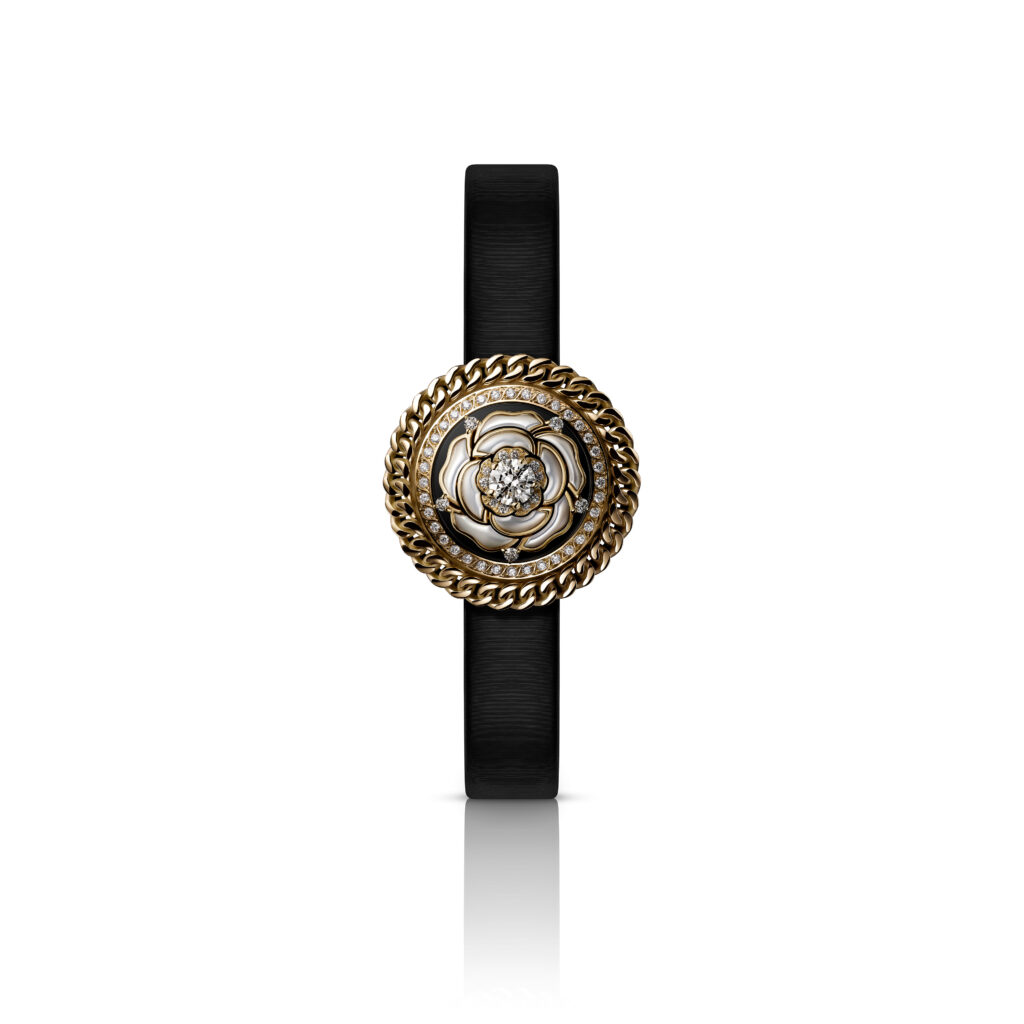 Dans ces deux déclinaisons – l’une bracelet, l’autre sautoir – le camélia iconique se décline en nacre sur onyx, enchâssé dans un bouton d’or jaune serti de diamants. Un diamant central (~0,50 carat) rehausse ce motif stylisé, subtilement relié au cadran noir laqué. Montée sur bracelet satin ou collier chaîne-pompon en or et onyx, la montre devient bijou haute couture.