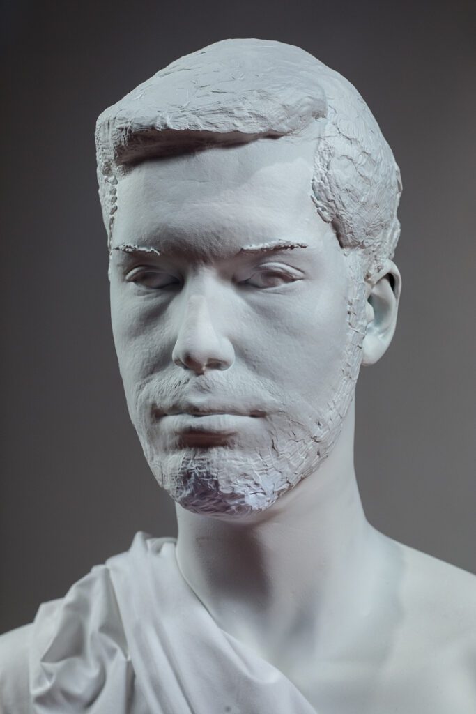 – Salle 1 & 2 : Jakub Flejšar et son beau-père Pavel Roučka illustrent la tension entre héritage artistique et autonomie individuelle à travers deux sculptures incarnant différentes étapes d’un même être, en interaction directe avec une série de toiles expressionnistes évoquant Pénélope, Ulysse et Télémaque