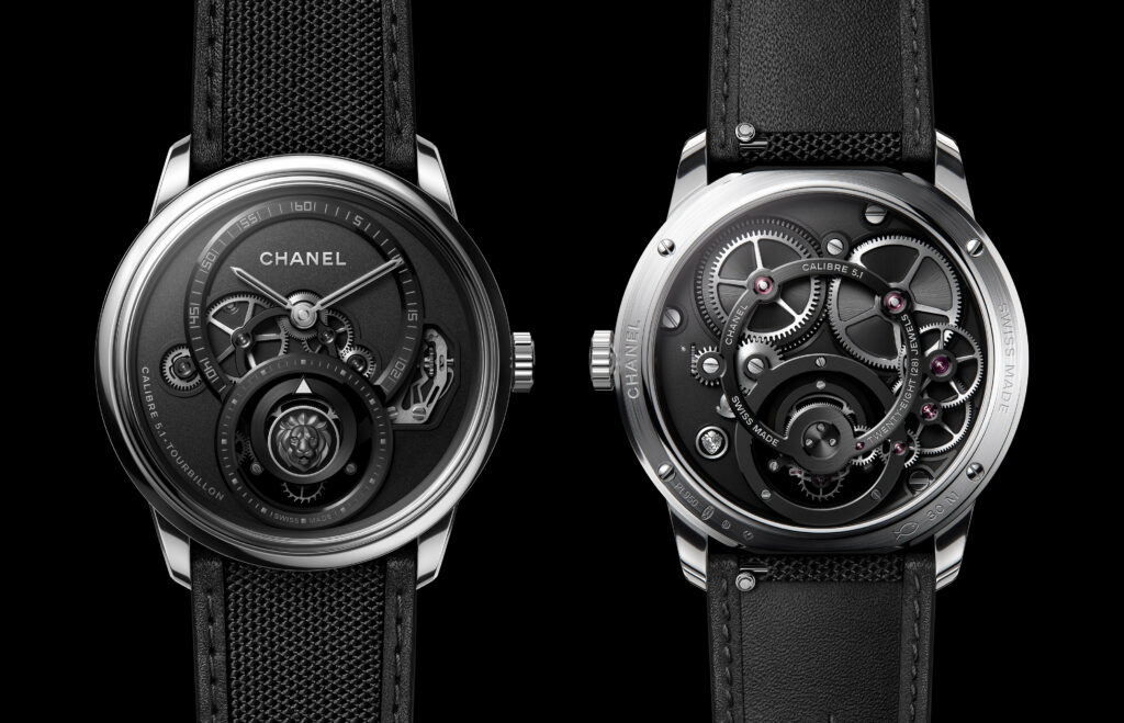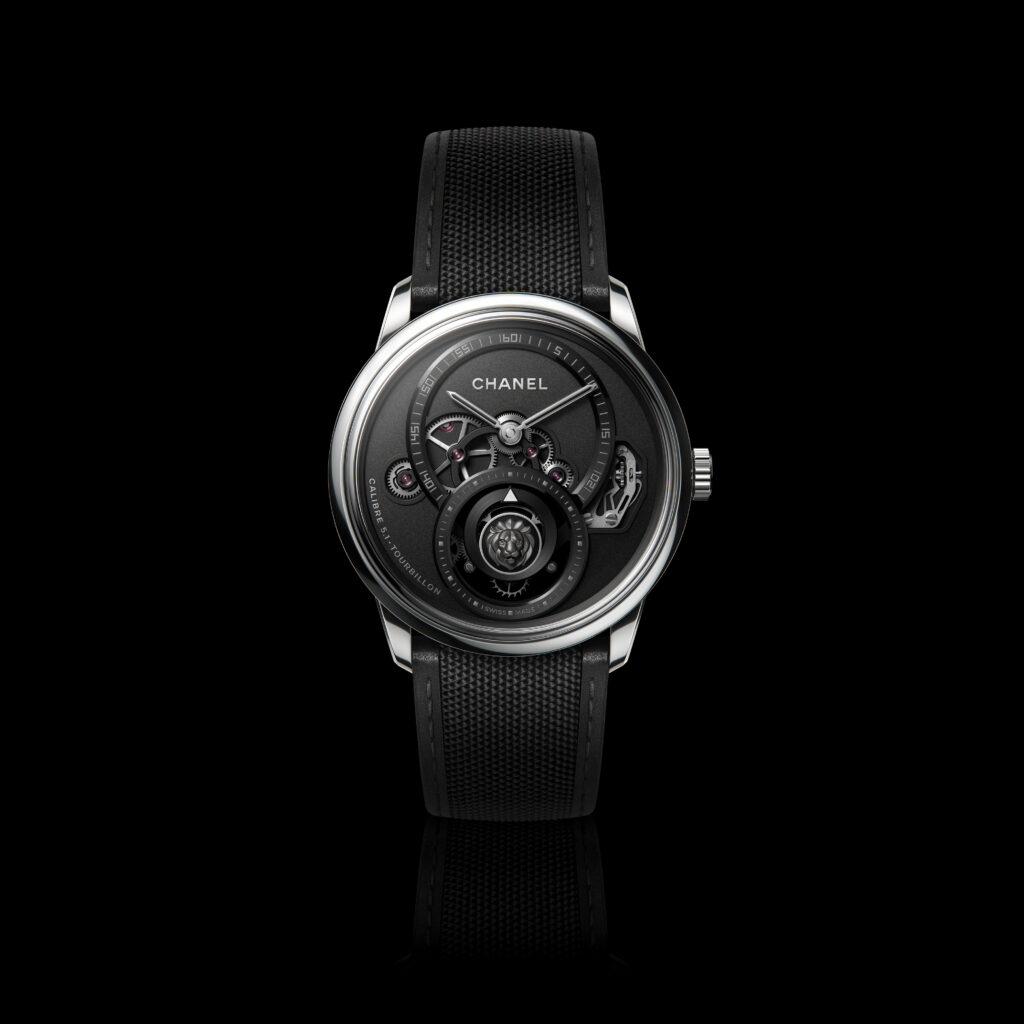 Au centre du cadran noir ajouré, suspendue dans la cage du tourbillon volant, surgit une tête de lion en titane gravé au laser. Flottant littéralement dans l’air, elle veille sur les 72 composants du mécanisme, signature visuelle du Calibre 5.1, conçu par le Studio de Création Horlogerie de CHANEL à Paris et assemblé dans la manufacture suisse.