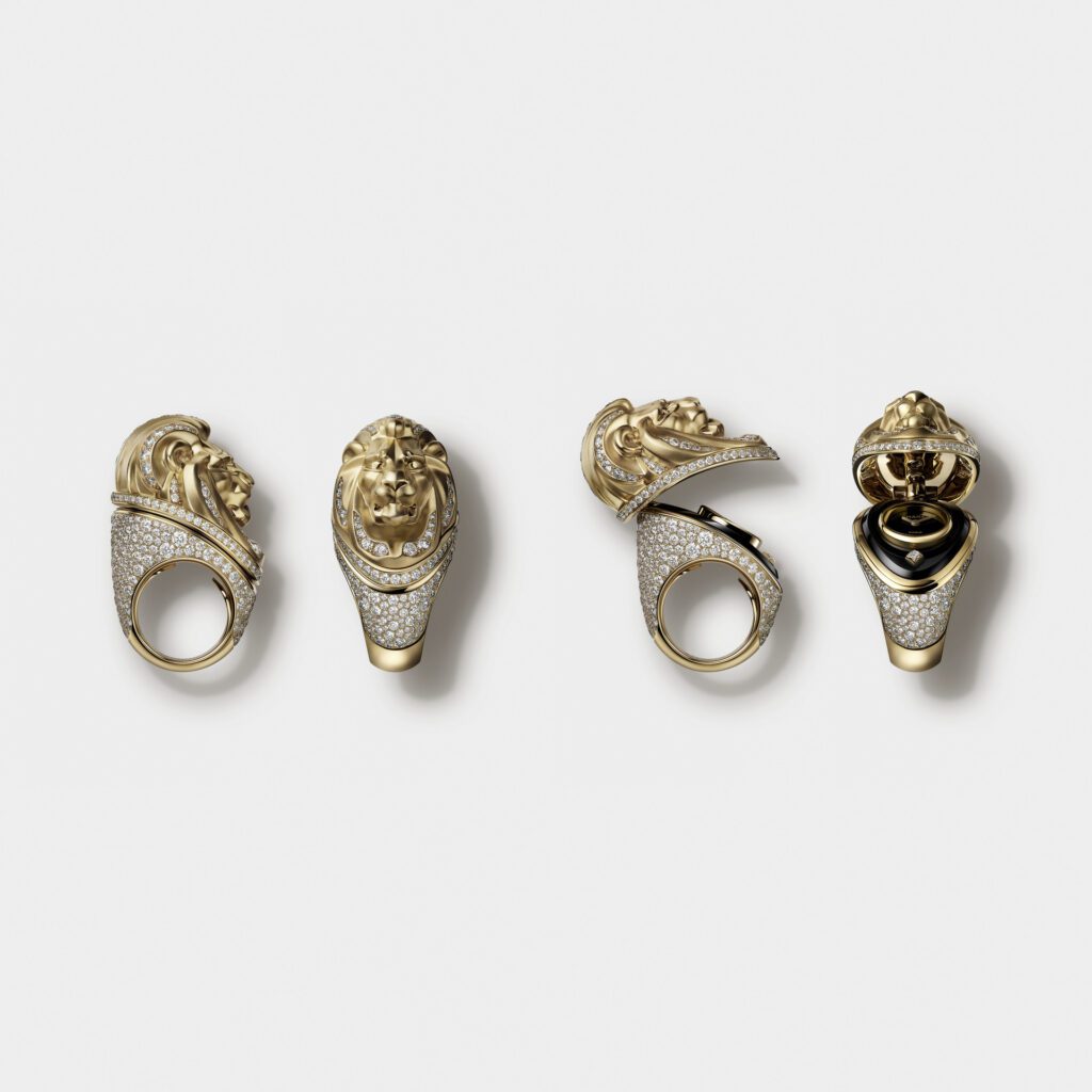 Éditée à seulement 5 exemplaires, cette pièce concentre à elle seule les codes de la haute joaillerie et de l’horlogerie secrète. Le corps de la bague, en or jaune 18 carats, est entièrement serti neige de 256 diamants taille brillant (~5,48 carats), tandis qu’une somptueuse tête de lion, sculpture précieuse sertie de 102 diamants (~3,04 carats), protège discrètement le cadran.