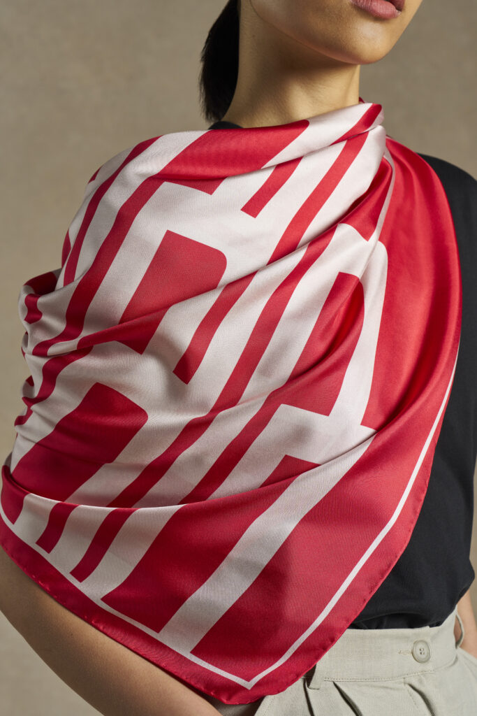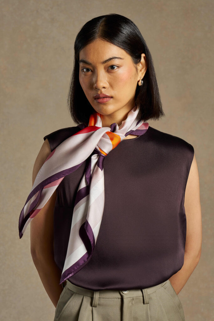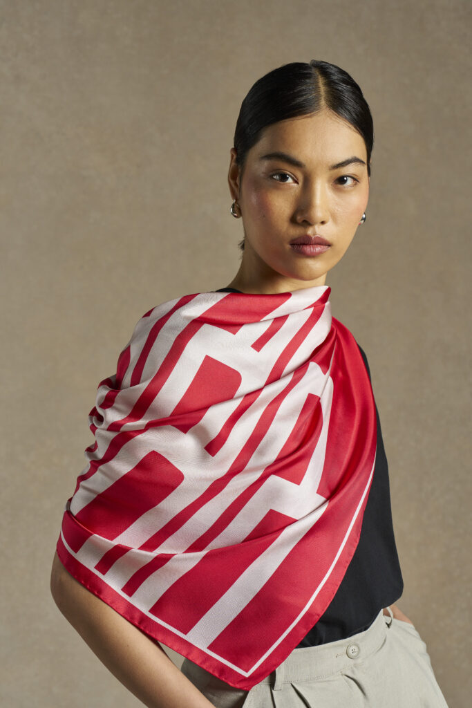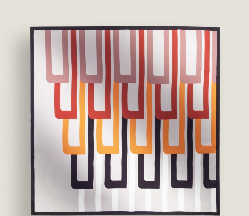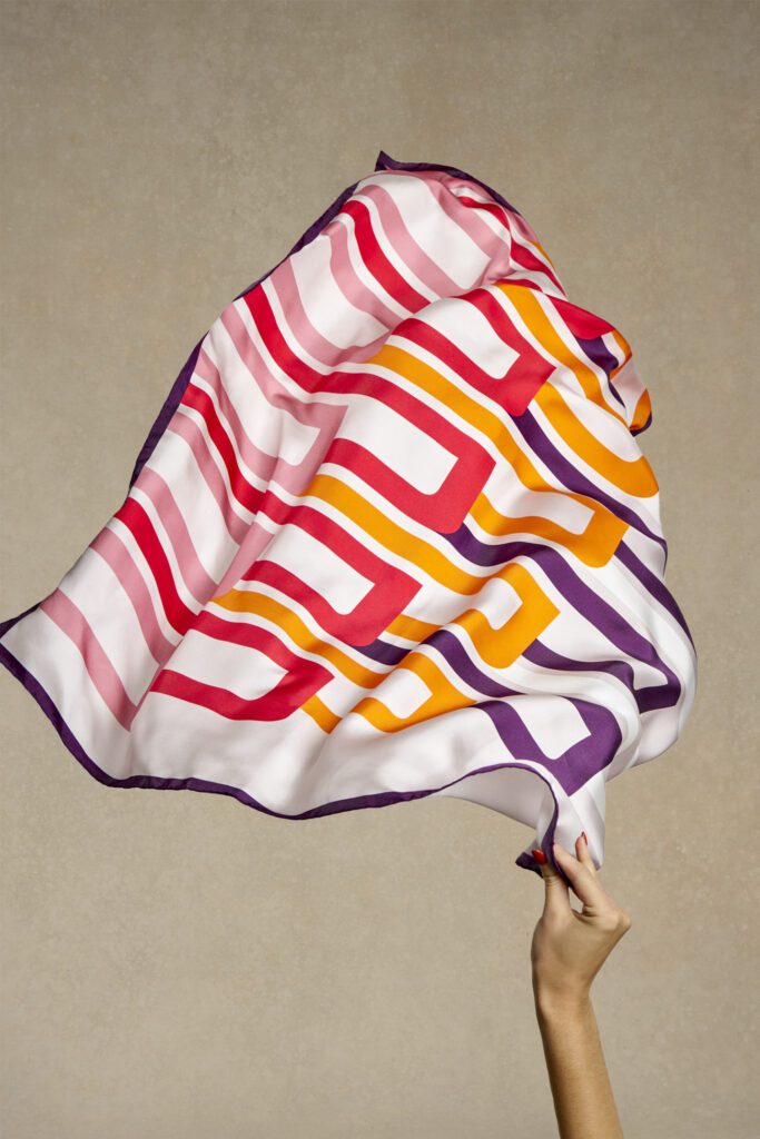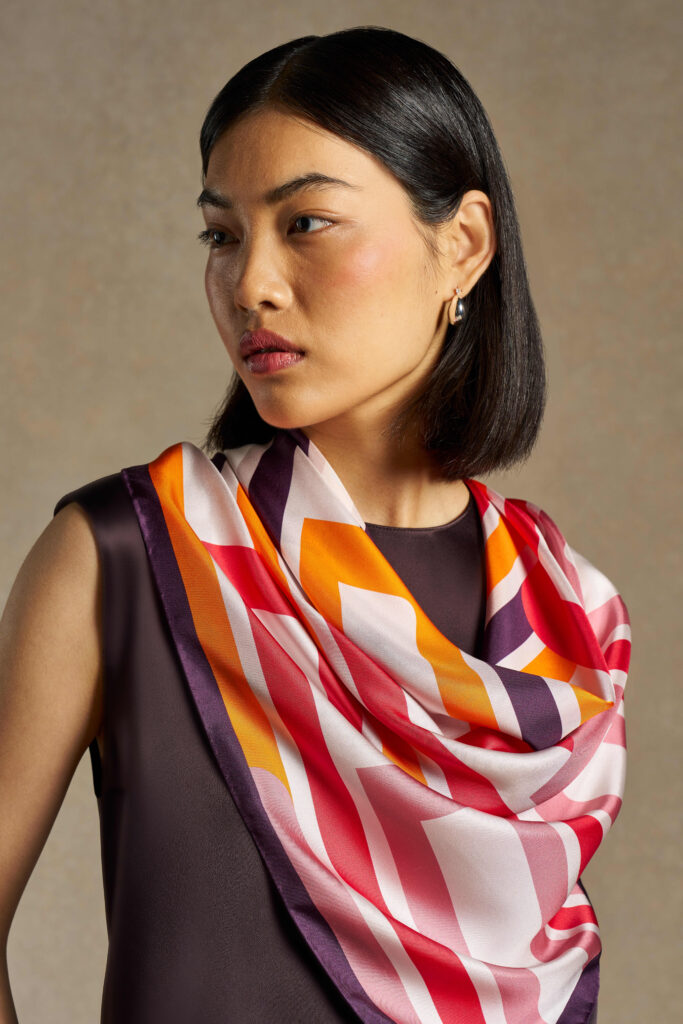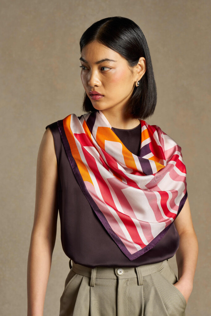 - Le foulard About Town, imprimé à Côme, et le Chelsea Blossom, produit à Macclesfield, célèbrent l’audace graphique avec des ourlets roulottés main.