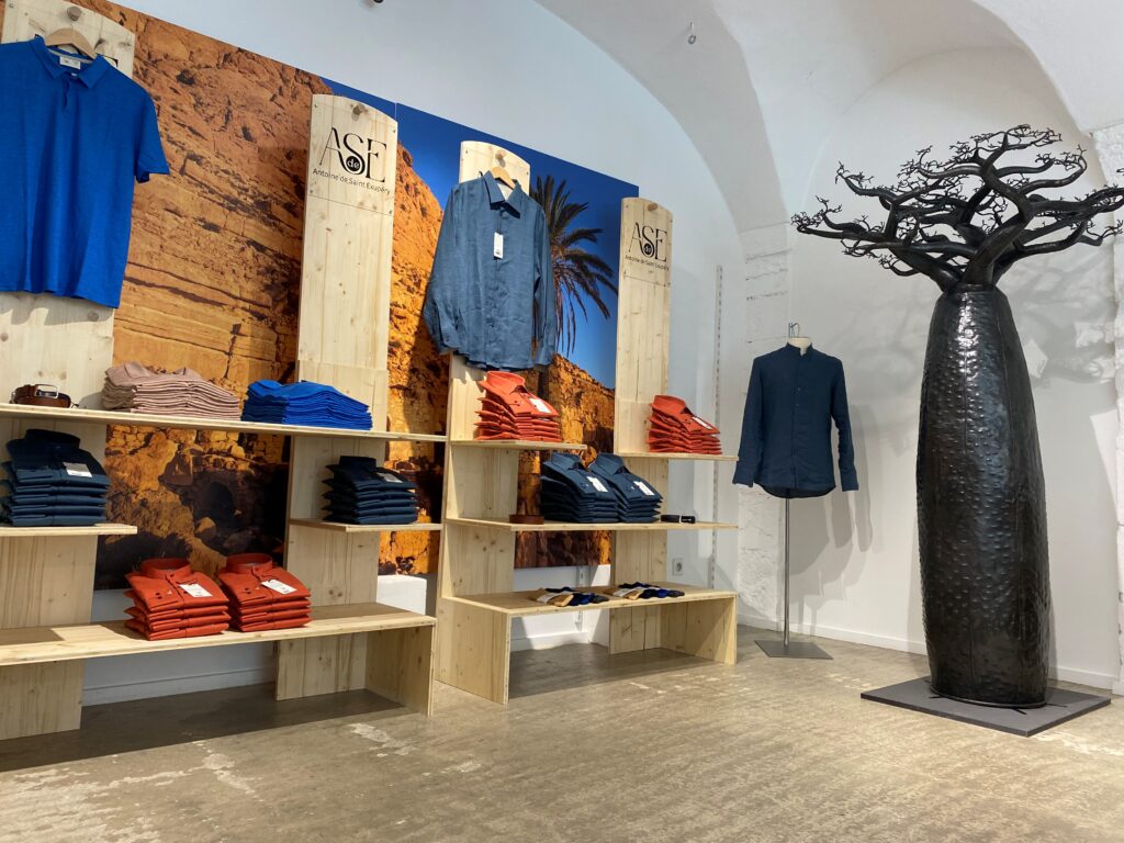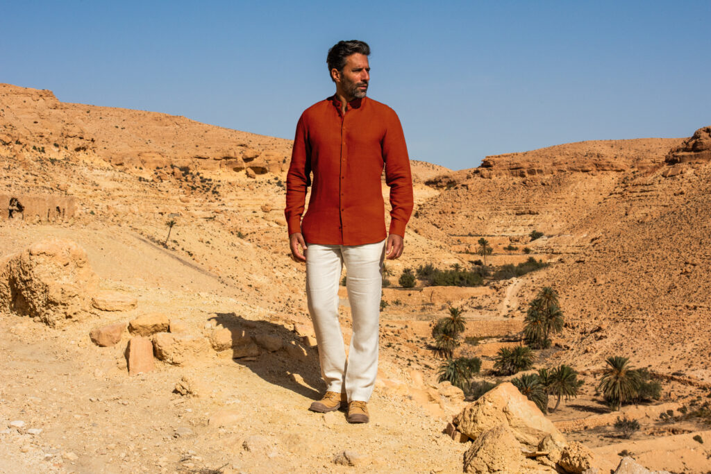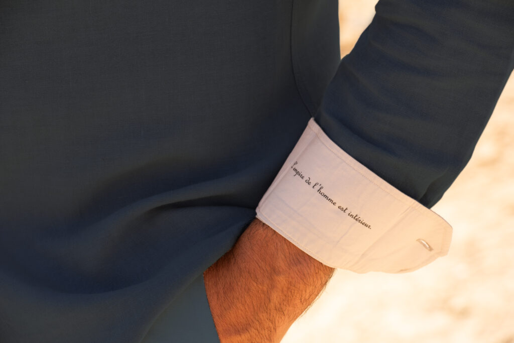 Avec ses teintes sableuses, ses bleus profonds et ses matières naturelles, le vestiaire A.de.S.E conjugue la beauté du geste à l’intemporalité du style. Pour les amateurs de signes intimes, chaque chemise peut accueillir à l’intérieur de sa manchette une citation d’Antoine de Saint Exupéry. Un fragment de littérature porté au quotidien.