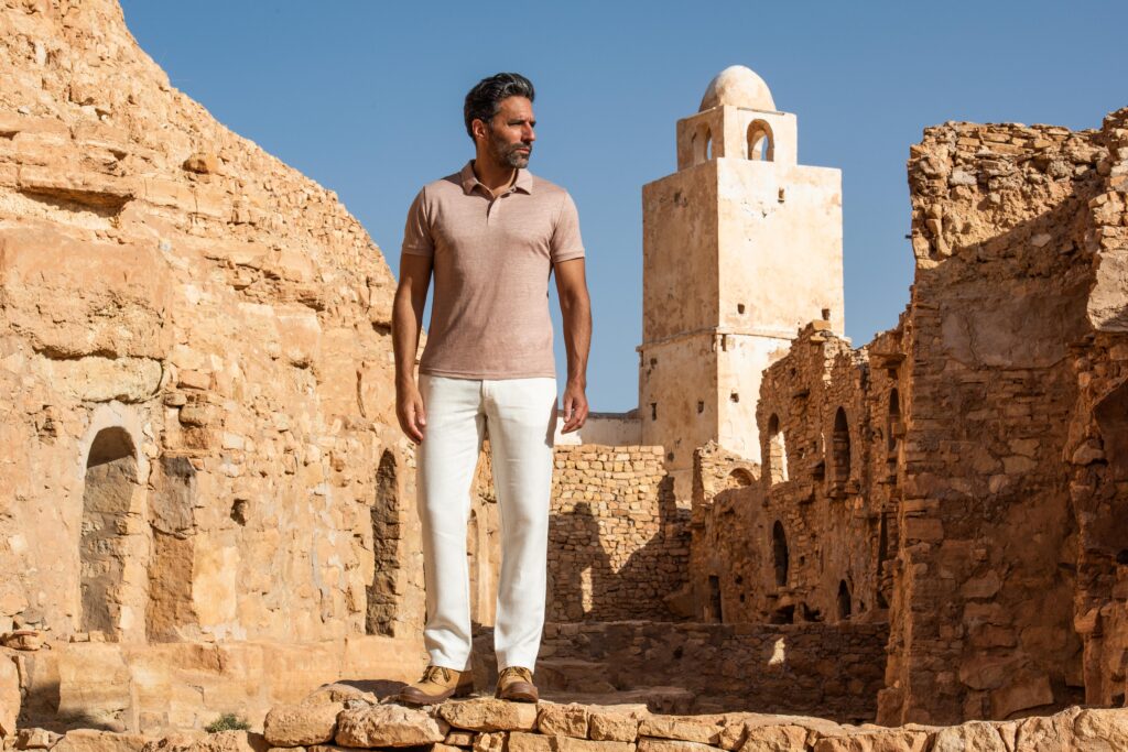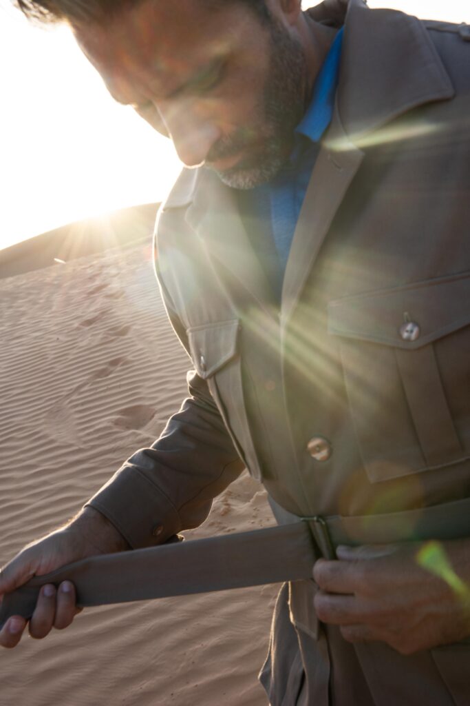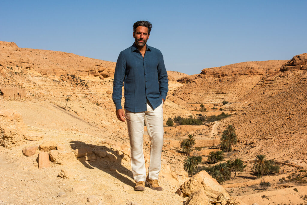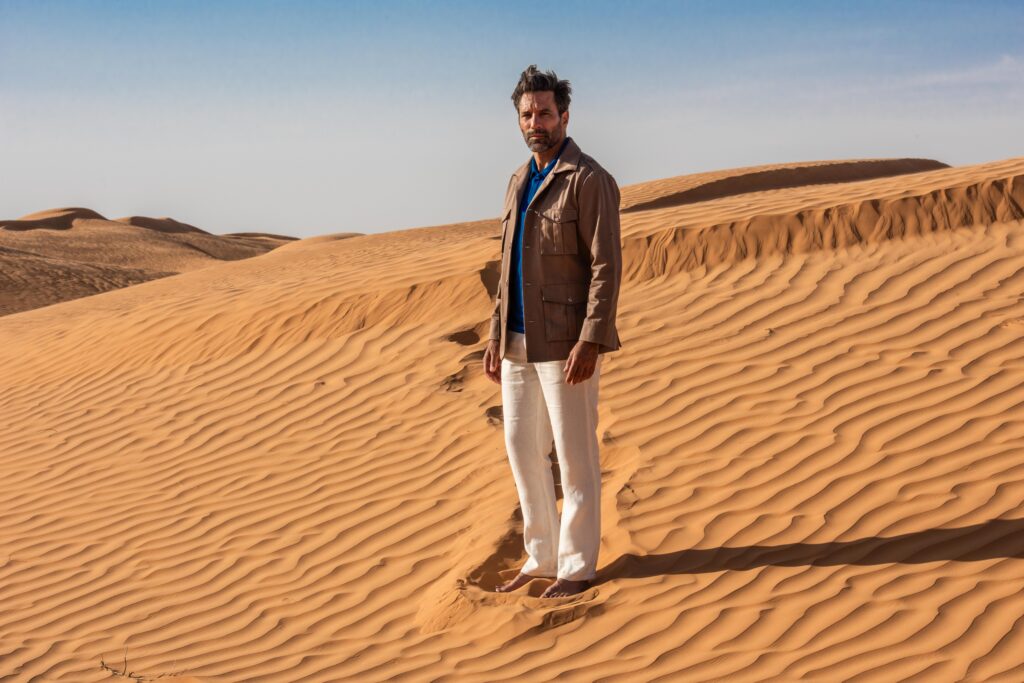 Portée par une licence exclusive du nom Antoine de Saint Exupéry, la marque propose une première collection Printemps-Été 2025 enracinée dans l’épisode mythique de l’écrivain-aviateur perdu dans le désert libyen. La saharienne Cap Juby, le polo Casablanca, les chemises en lin personnalisables, tout ici évoque la noblesse discrète de l’explorateur moderne — celui qui chemine avec conscience.
