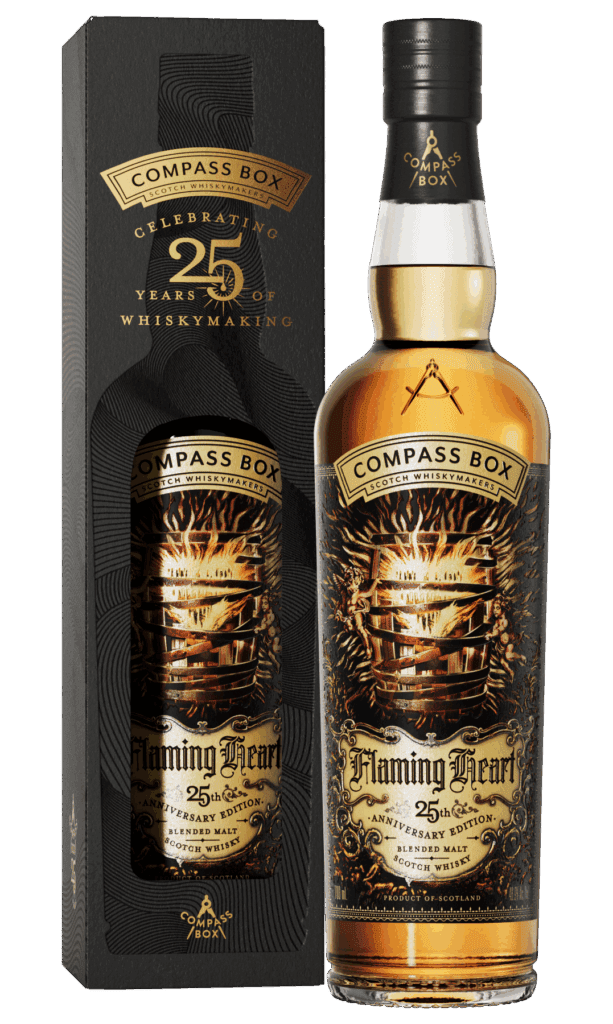 Déflagration sensorielle à l’occasion d’un anniversaire marquant : pour ses 25 ans, Compass Box revisite son whisky iconique Flaming Heart en une édition intégrale de feu et de finesse. Blended malt sans compromis, cette cuvée anniversaire exclut les malts non-tourbés, misant sur une orchestration audacieuse de distillats à forte personnalité.