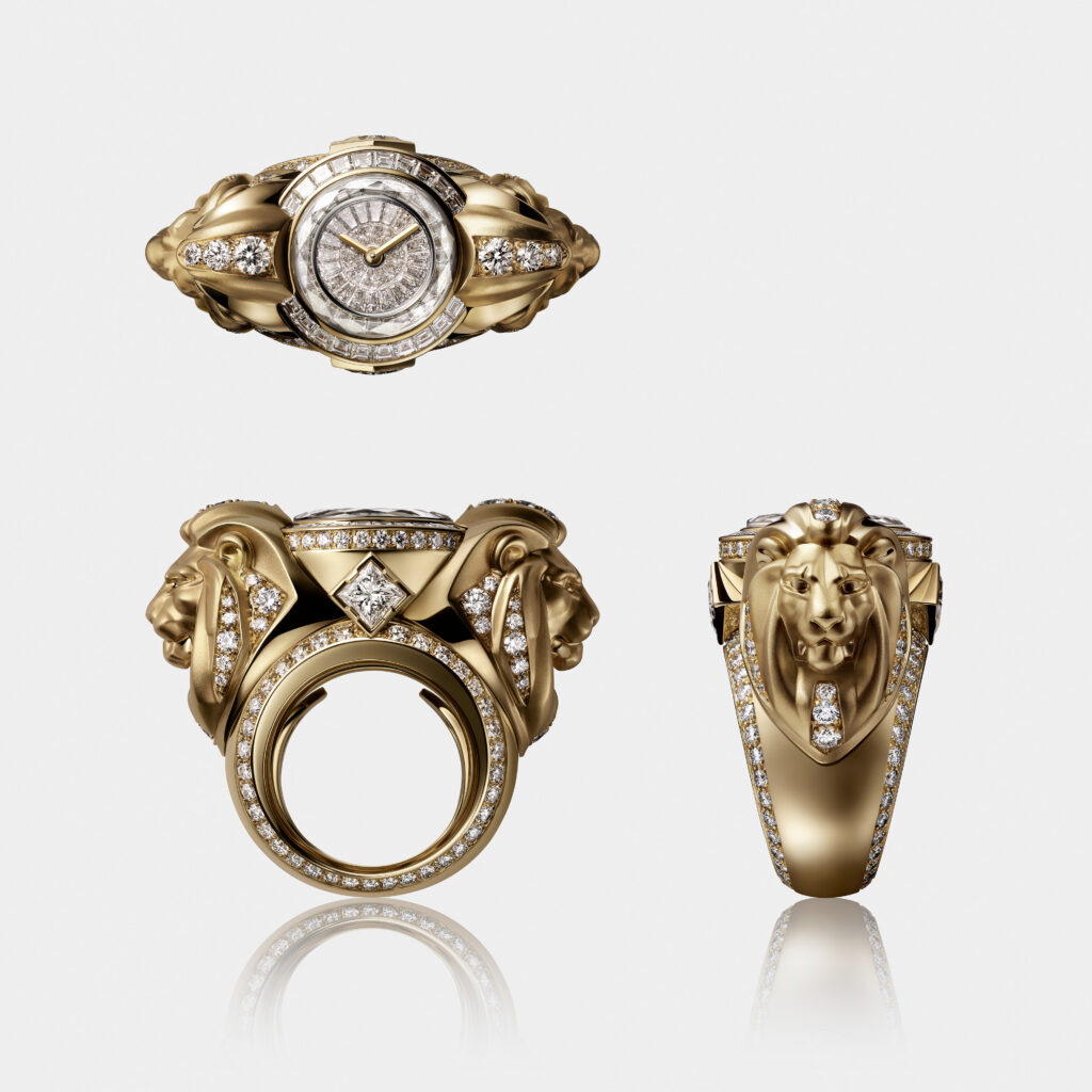 Deux lions en or jaune 18 carats, taillés comme des cariatides baroques, encadrent un cadran miniature serti de 57 diamants taille baguette (~0,89 carat), logé dans une lunette elle-même pavée de 20 baguettes supplémentaires (~0,60 carat). En dessous, deux diamants taille princesse de 0,42 carat chacun, posés en vis-à-vis, ajoutent à la tension graphique de cette pièce unique.