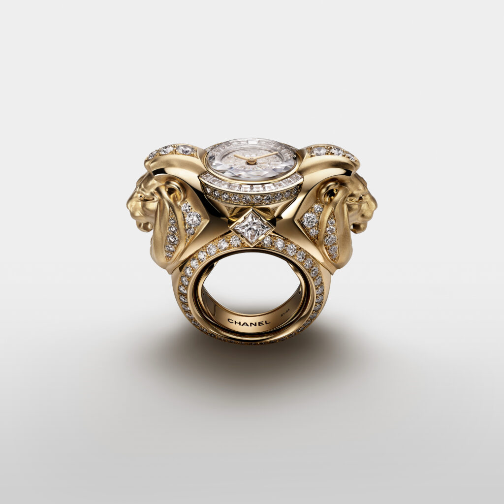 Inspirée des lions jumeaux qui veillaient sur l’univers intime de Gabrielle Chanel, la BAGUE MONTRE TOI & MOI « LE LION DE MADEMOISELLE » incarne un double hommage : à l’animal-totem de Mademoiselle et à l’histoire de la joaillerie sentimentale. Éditée à seulement cinq exemplaires, cette bague exceptionnelle conjugue architecture sculpturale et secret horloger.