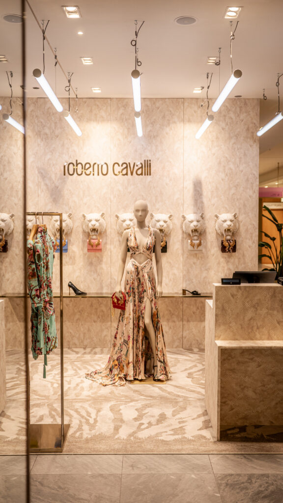 Le merchandising joue la pluralité sensorielle : miroir-logo Snake encadrant les solaires, table ronde métal-marbre pour les fragrances, shelving doré pour les accessoires, le tout rythmé par un plafond végétal discret qui ancre la « jungle Cavalli » dans le réel. L’expérience se prolonge online via robertocavalli.com, où un module AR permet d’essayer virtuellement la Roar Bag en cinq imprimés.
