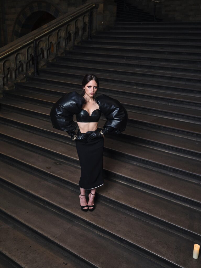 Look 32 du défilé, cette silhouette distille une rigueur couture et une tension dramatique parfaitement maîtrisée. Jenna Ortega portait un soutien-gorge en cuir noir structuré, accompagné de manches gants rembourrées en cuir, combinées à une jupe crayon en crêpe de laine noire, aux finitions brutes et fendues. Aux poignets, les bracelets « Chain Link » accentuaient une allure guerrière et sophistiquée, mêlant provocation mesurée et puissance féminine.