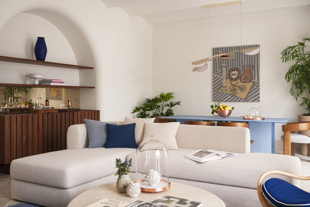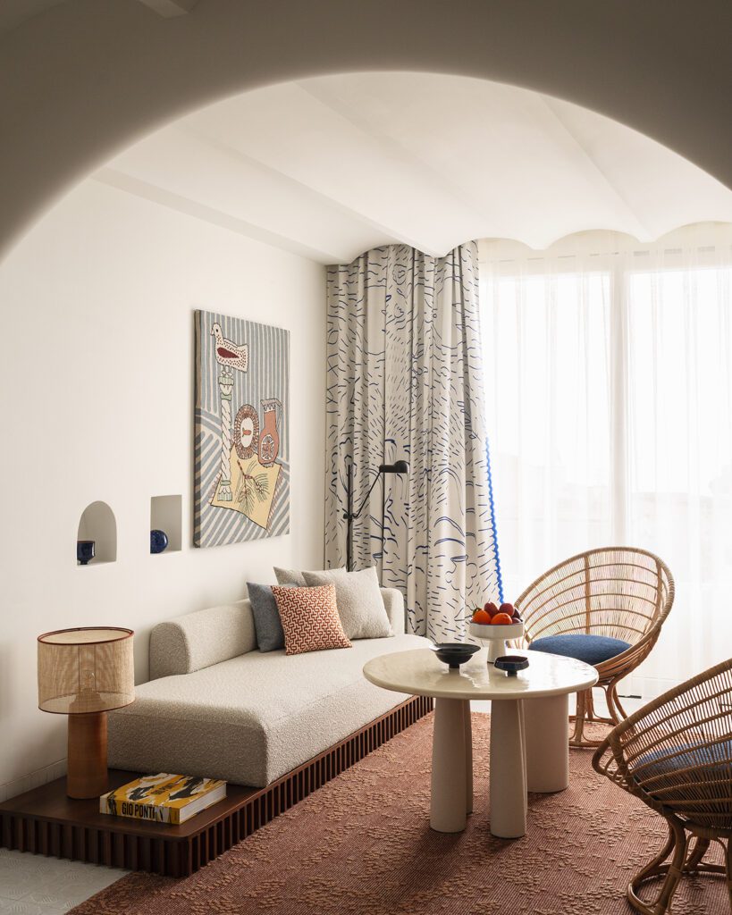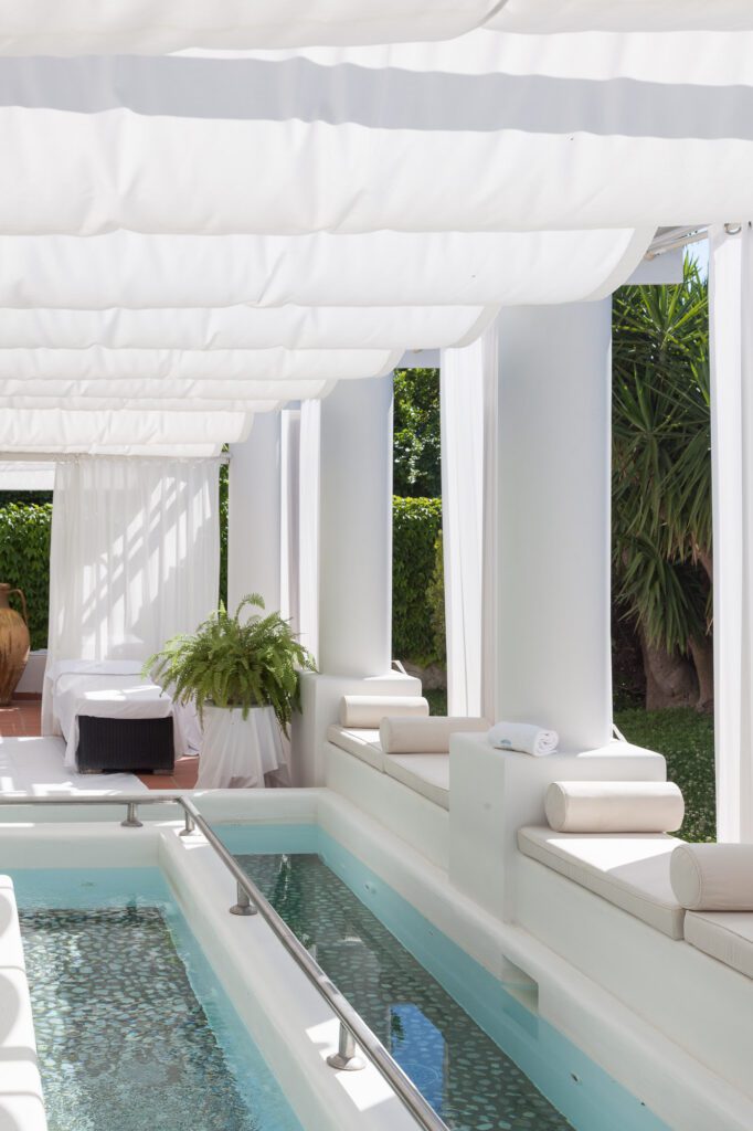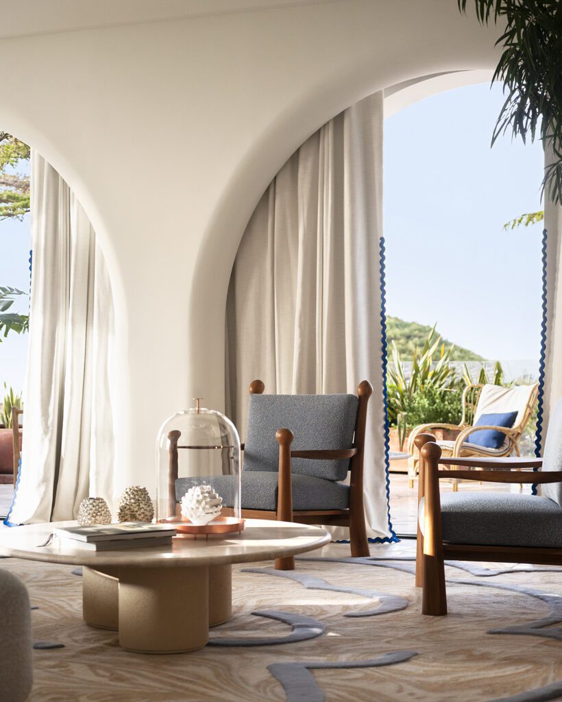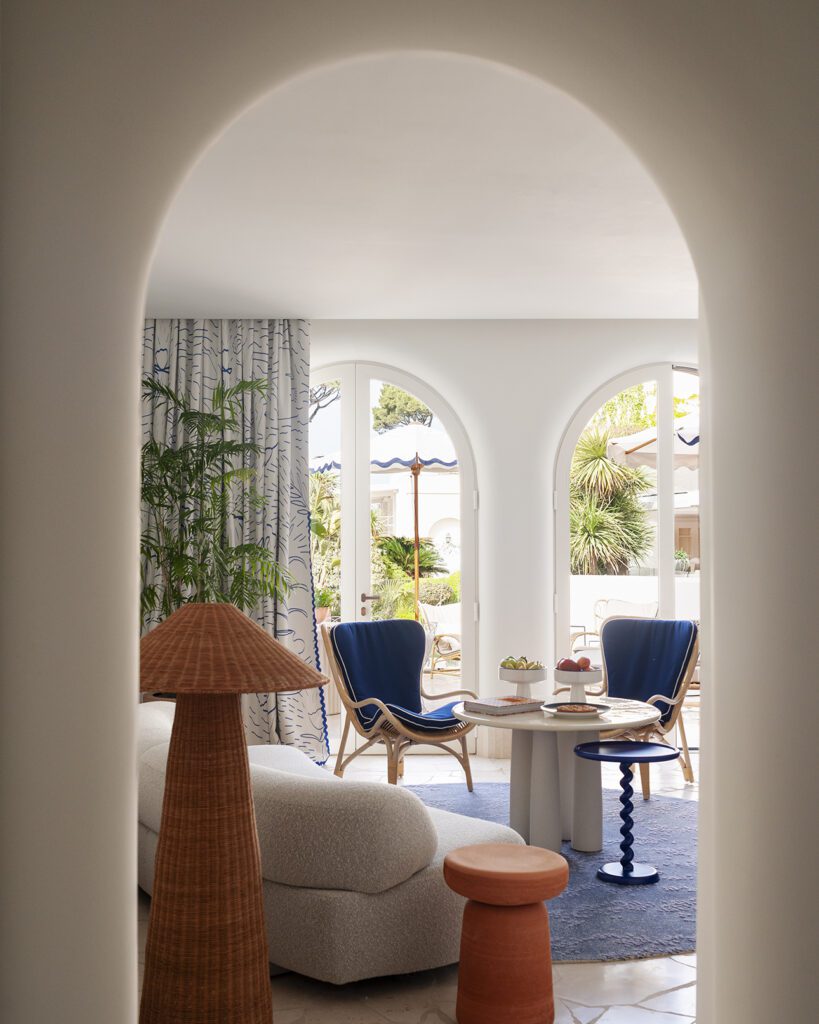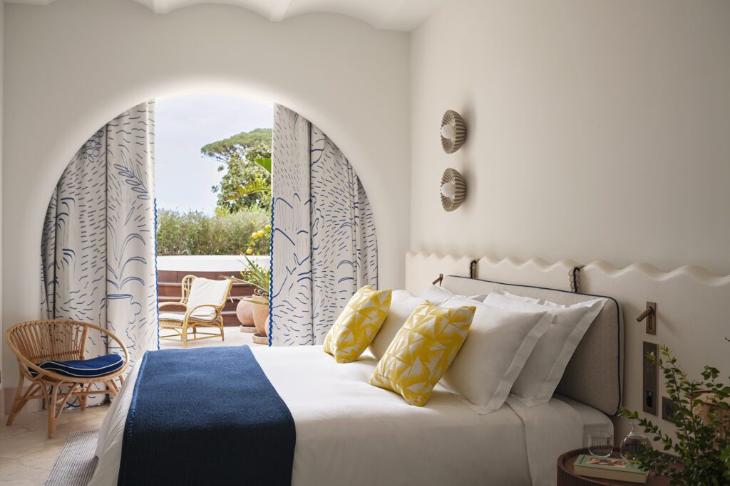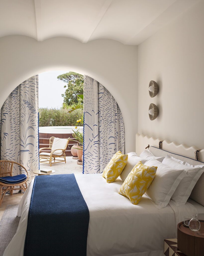La créatrice espagnole injecte son langage formel dans ce contexte chargé d’histoire. Ses interventions, alliant rigueur fonctionnelle et sensualité italienne, revisitent les codes esthétiques capriotes : marbres lumineux, lignes épurées, palettes pastel et clins d’œil à la Méditerranée antique. Le résultat : une atmosphère de villégiature raffinée, entre discrétion monacale et opulence solaire. Mention spéciale à la Suite Paltrow, temple de lumière prolongé d’une piscine privative à débordement, ou encore à la Suite Callas, qui sublime le silence et le clair-obscur dans un hommage théâtral à la diva.