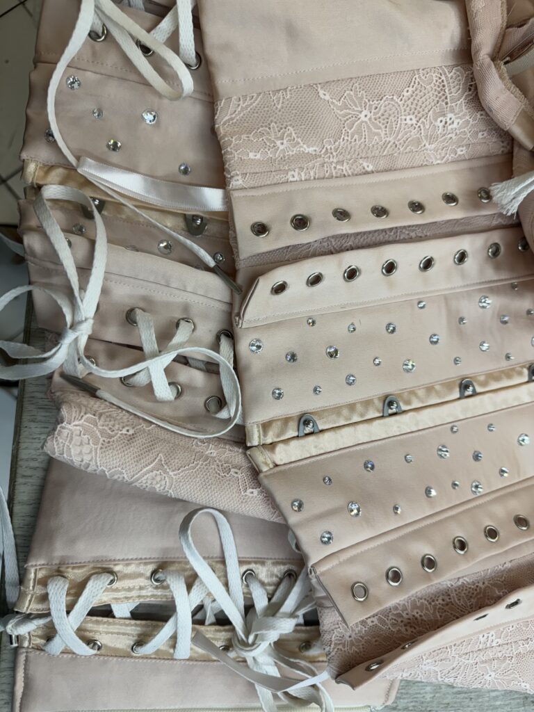 Les danseuses prolongent la narration dans des ensembles lingerie-couture – brassières en tulle brodé, micro-shorts constellés, porte-jarretelles iridescents – quand les danseurs, eux, opposent baggies noirs et corsets-ceintures satin/dentelle. Ce twist androgyne rappelle la dialectique chère à On Aura Tout Vu : faire dialoguer puissance et vulnérabilité, armure et sensualité. Le résultat est un défilé cinétique où chaque pas de salsa devient coup de ciseau, chaque drop de beat résonne comme un coup de marteau-tailleur.