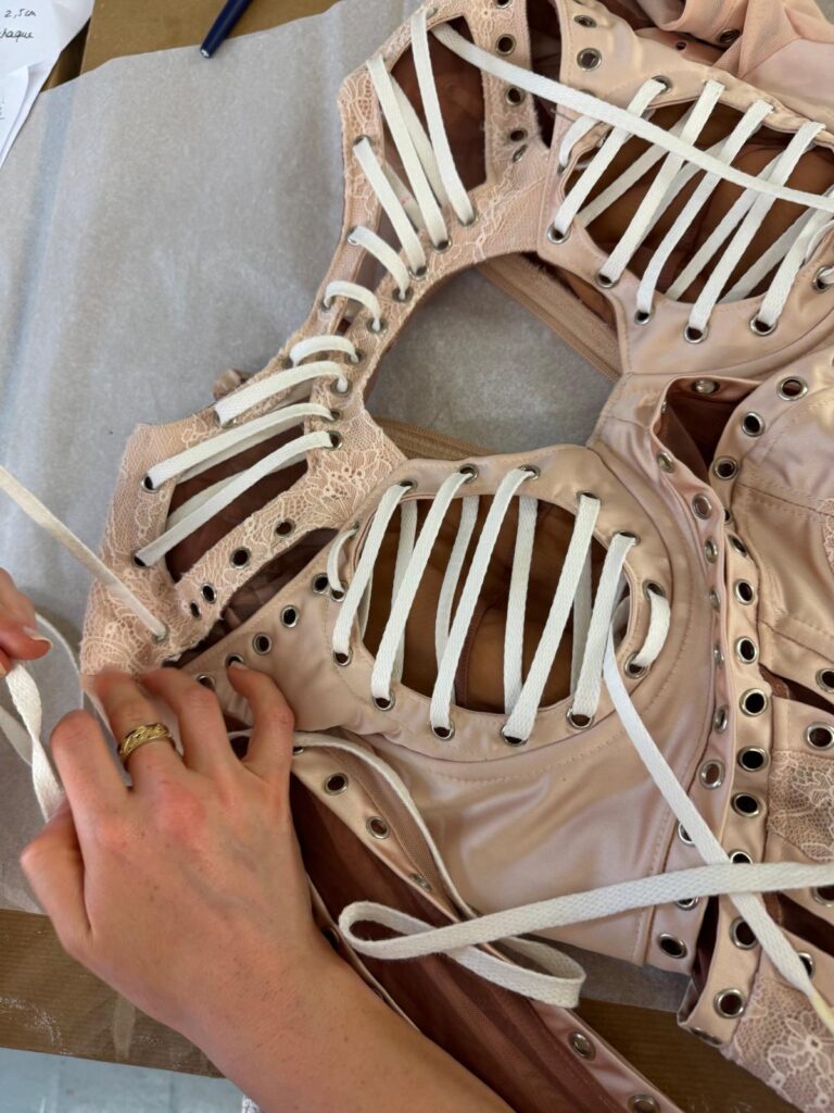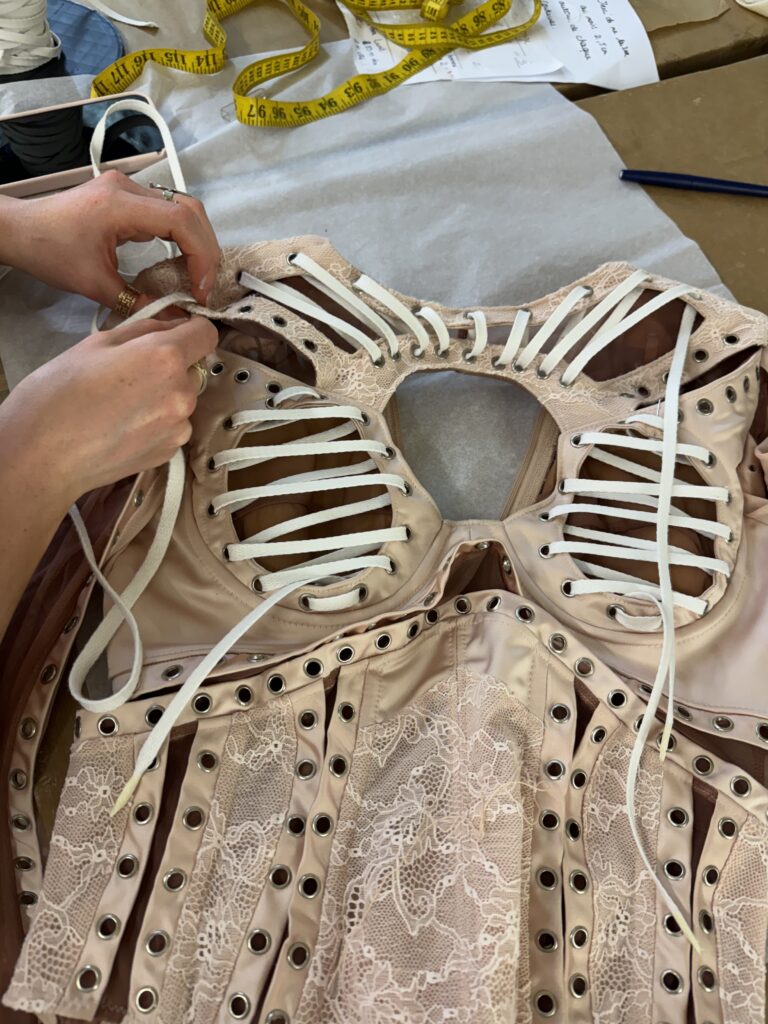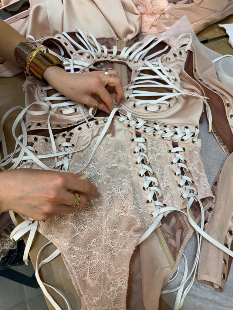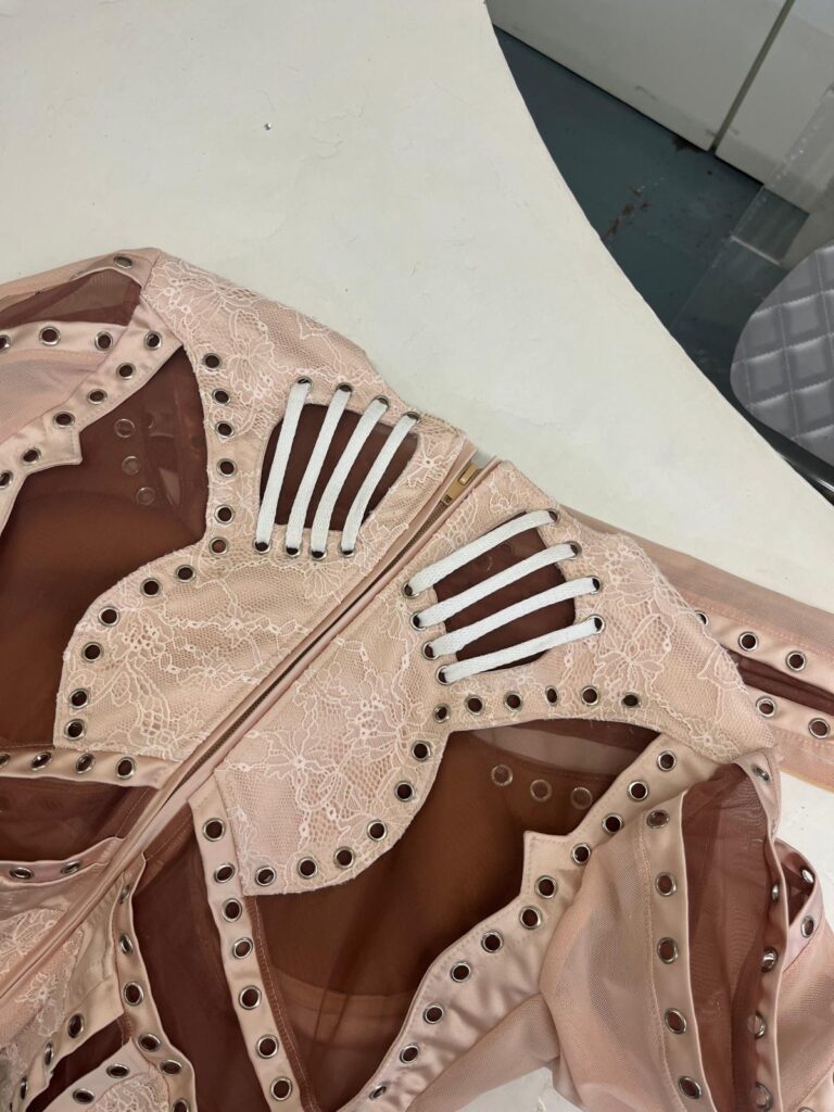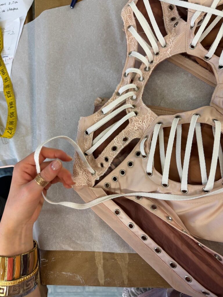 Le body a nécessité plus de 250 heures d’atelier : patronage 3D sur scan corporel, tissage de réseaux micro-élastiques invisibles pour supporter les grands écarts chorégraphiques, doublure respirante en satin stretch couleur peau pour évacuer la chaleur des quatre chandelles pyrotechniques qui encadrent le numéro « Birthday ». À l’intérieur, un QR-code brodé au fil d’argent authentifie la pièce et renvoie, backstage oblige, à une vidéo immersive du processus de création.