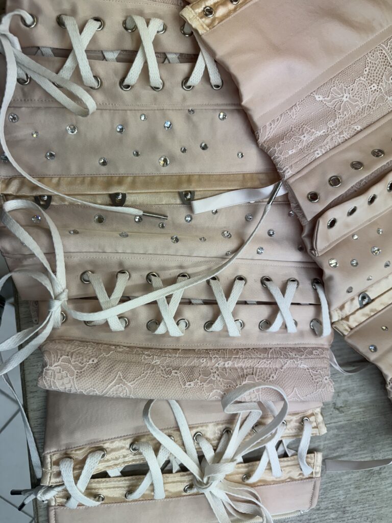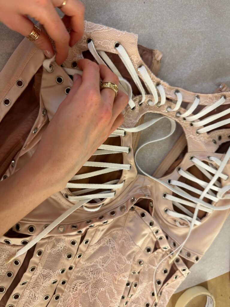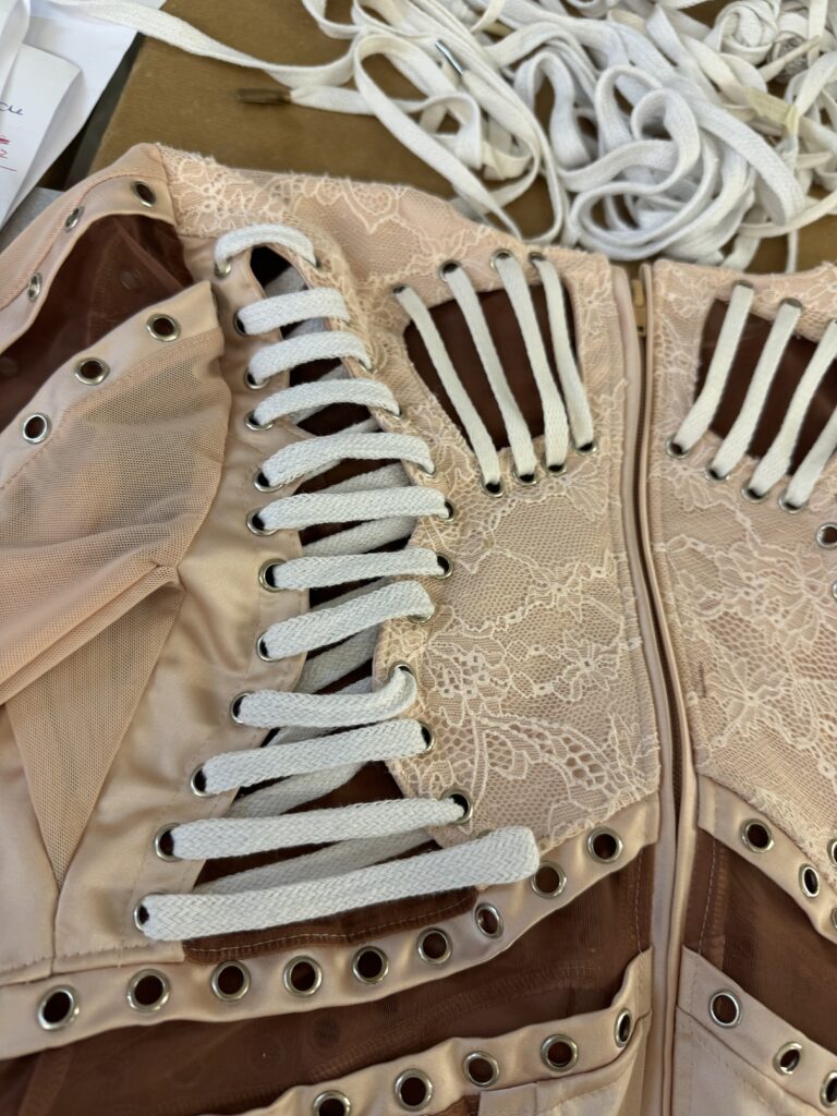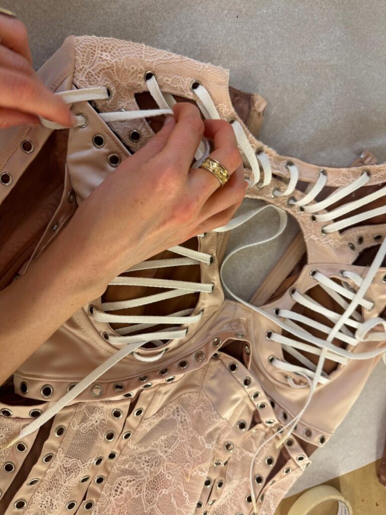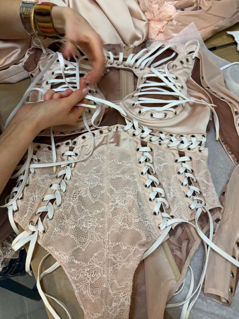 Le body a nécessité plus de 250 heures d’atelier : patronage 3D sur scan corporel, tissage de réseaux micro-élastiques invisibles pour supporter les grands écarts chorégraphiques, doublure respirante en satin stretch couleur peau pour évacuer la chaleur des quatre chandelles pyrotechniques qui encadrent le numéro « Birthday ». À l’intérieur, un QR-code brodé au fil d’argent authentifie la pièce et renvoie, backstage oblige, à une vidéo immersive du processus de création.