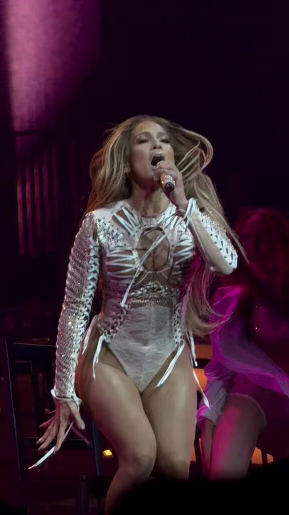 Un faisceau stroboscopique, un riff latin, puis un éclair rose vieux : Jennifer Lopez surgit, sculpturale, dans un body corseté au millimètre, constellé de dentelle brodée et de cristaux qui renvoient chaque photon comme un feu d’artifice. Ce 24 juillet, soir d’anniversaire dans l’amphithéâtre romain de Lucca, l’icône américaine a choisi la maison parisienne On Aura Tout Vu pour incendier le tableau « Birthday » de sa cinquième tournée mondiale.