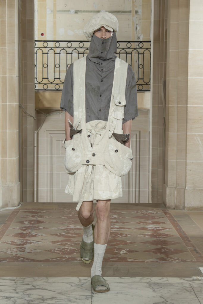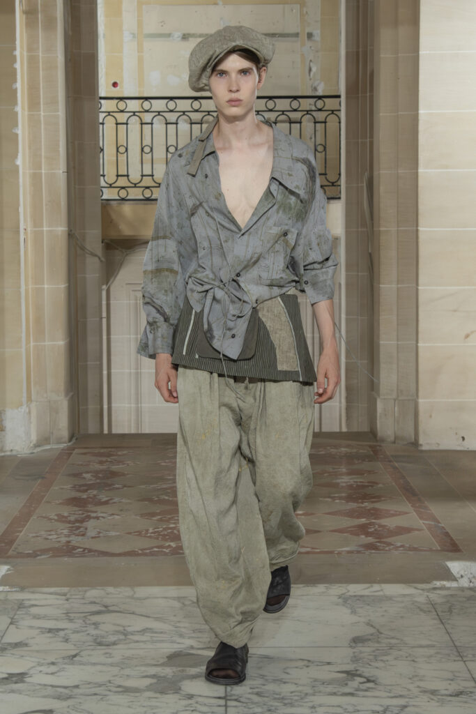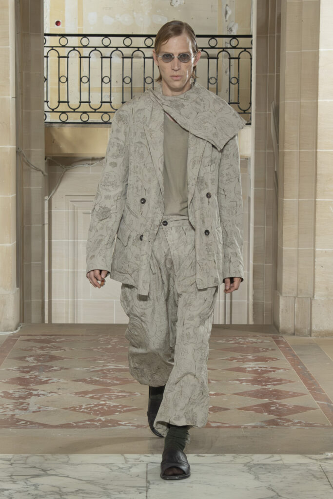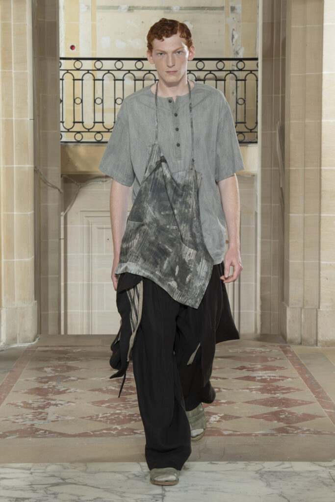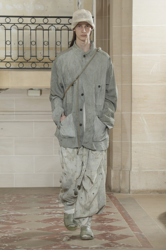 Dans l’univers silencieusement radical de Ziggy Chen, chaque saison est un rite. Pour le printemps-été 2026, le créateur basé à Shanghai dévoile PRITRIKE, contraction poétique de « Primal » et « Strike », telle une collision de forces premières et d’élans instinctifs domestiqués par la main humaine. Présentée le 28 juin dernier à Paris dans le cadre de la Fashion Week Homme, la collection résonne comme une offrande méditative à la nature, à la matière et au temps.