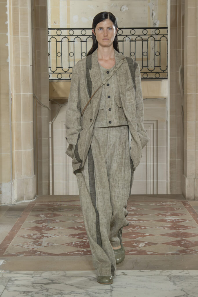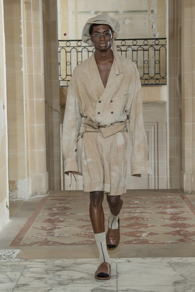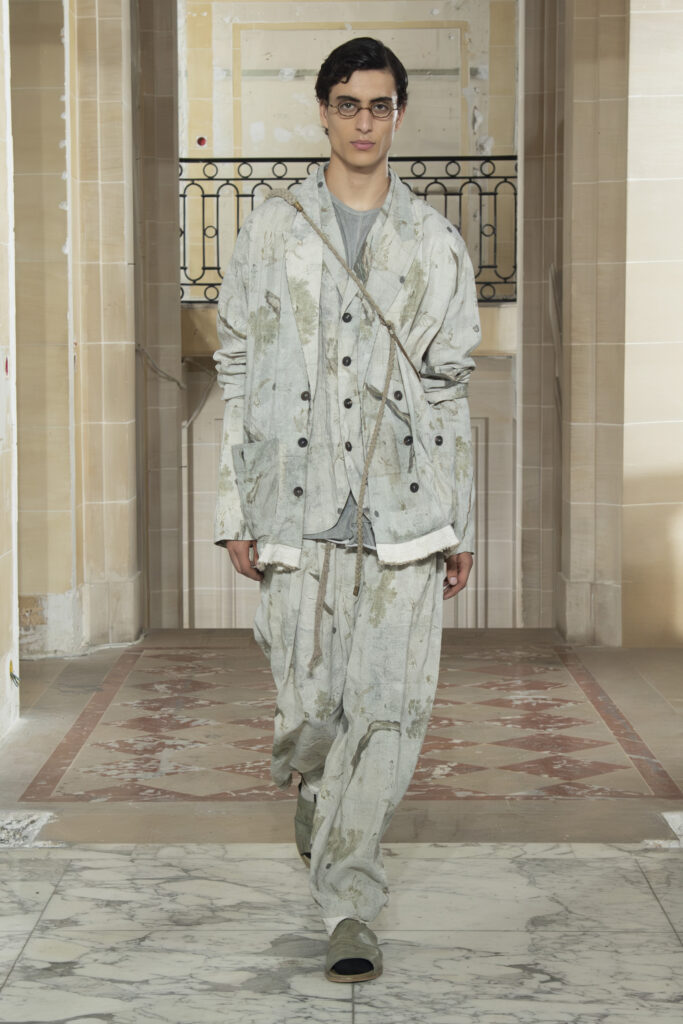 Les vêtements, aux coupes généreuses et spontanées, suggèrent un abandon maîtrisé. Ils évoquent la pluie estivale de Jiangnan — persistante, douce, vivifiante — qui semble s’être infiltrée jusque dans les fibres. Coton, soie, lin, chanvre : les matières organiques sont enrichies de traitements singuliers comme la teinture artisanale ou la superposition de feuilles d’or, conférant aux surfaces un éclat patiné. Une rugosité première, rendue tactilement luxueuse.
