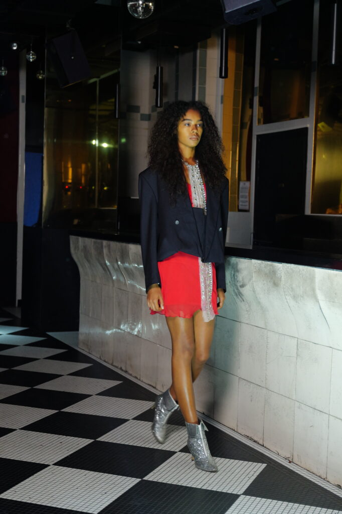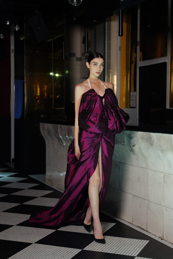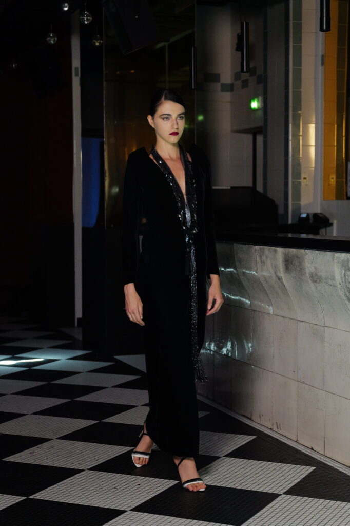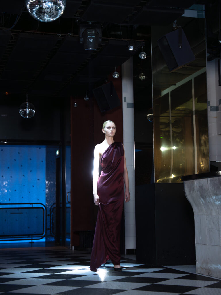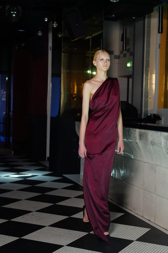Le défilé, présenté dans le club mythique Les Bains, s’ouvre avec un bijou-robe fluide, où le satin rouge sang est équilibré sur l’épaule par des broderies de cristaux et chaînes dorées. Suit un bustier-rose en velours de soie sabré signé Prelle, monté sur une jupe de tulle organique, alternative précieuse à la fourrure.