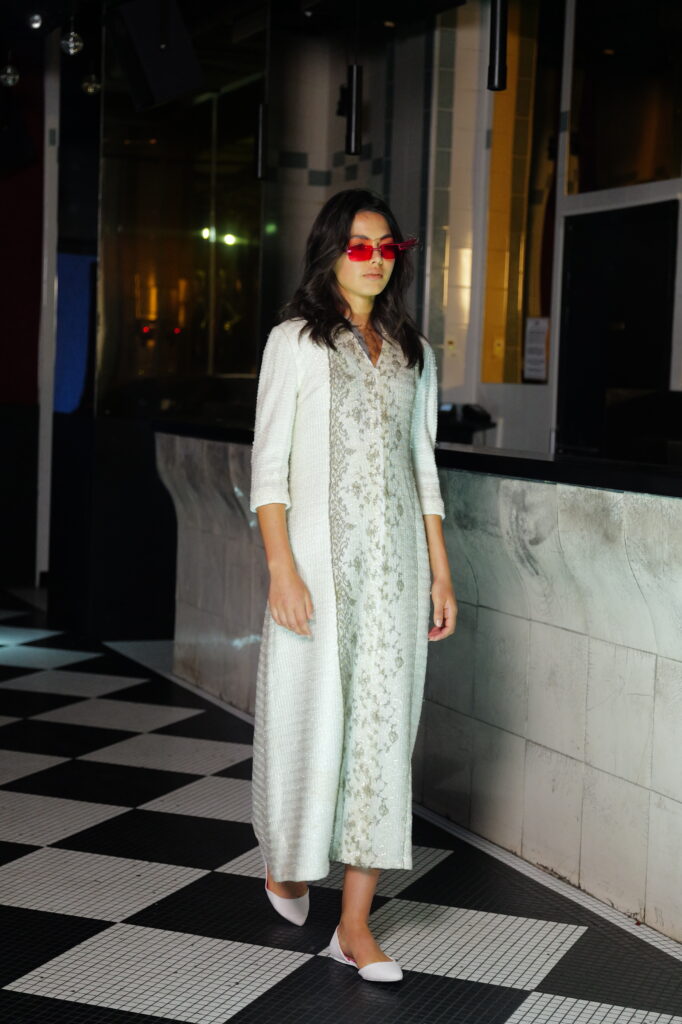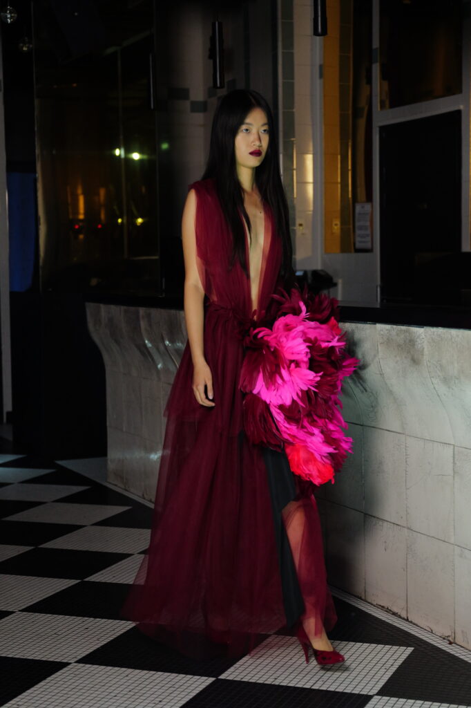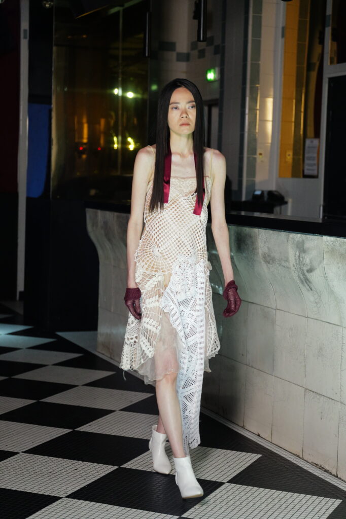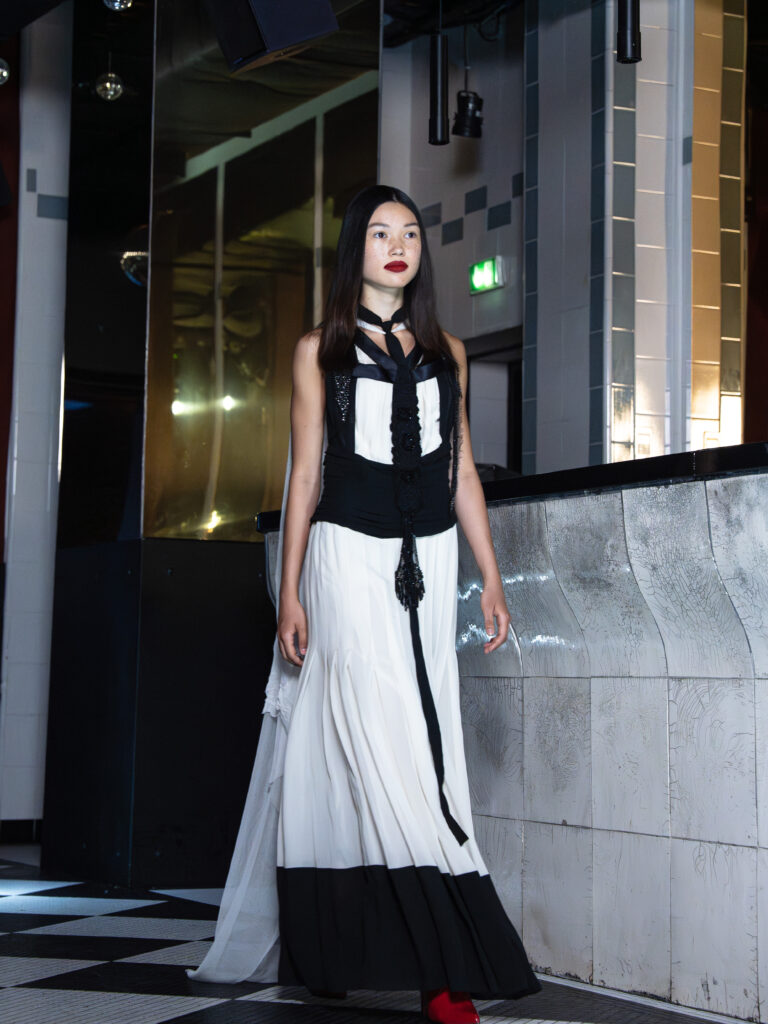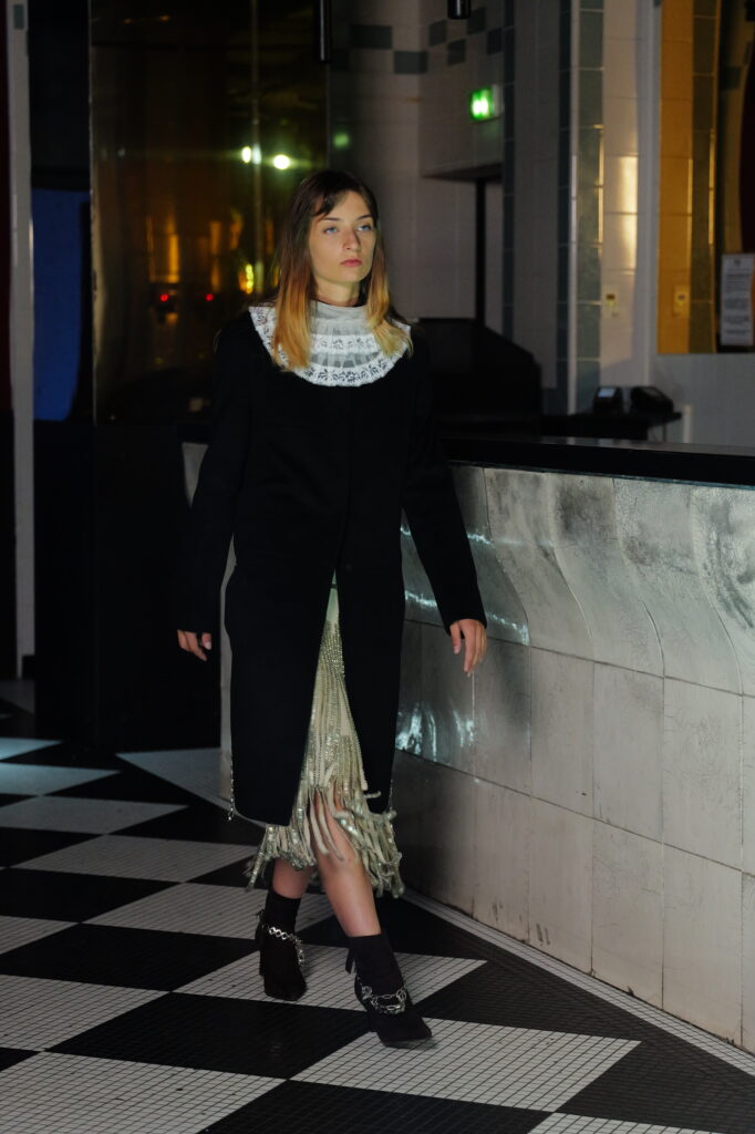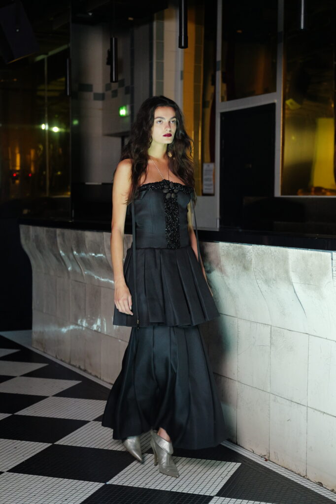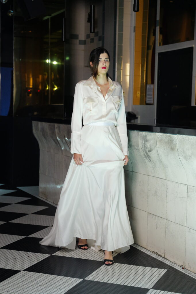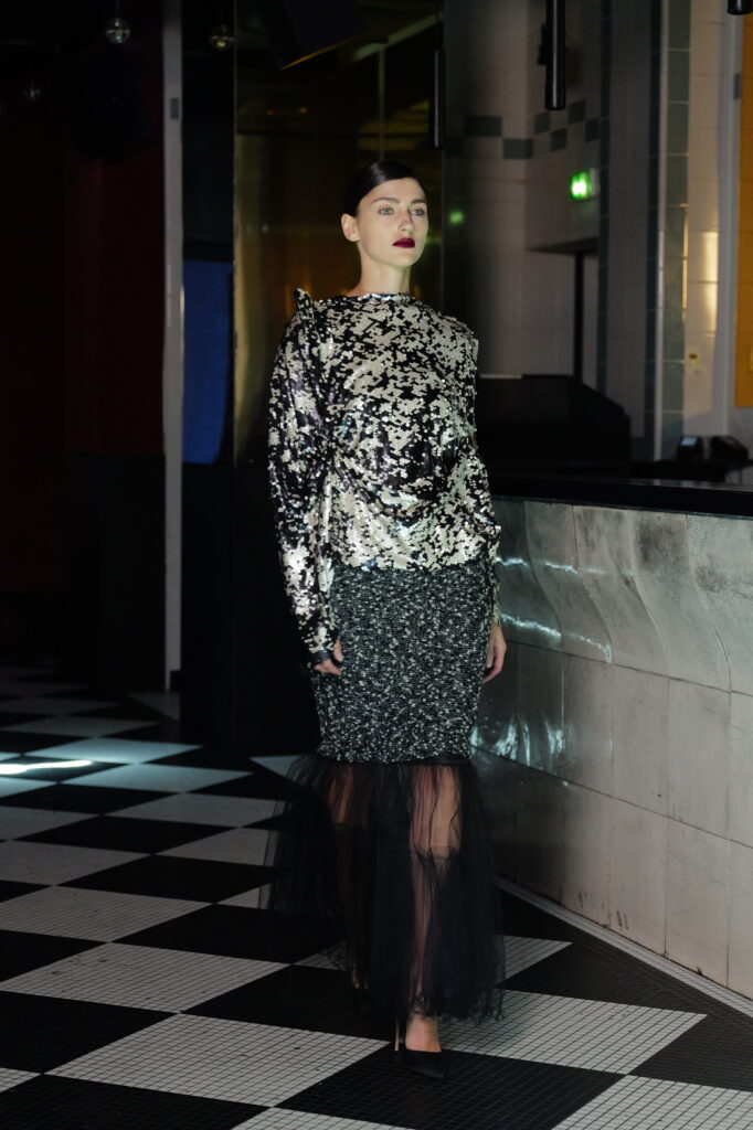 Une collaboration avec Christine introduit une pièce-sculpture en tulle upcyclé translucide, tenue par des lacets et cordons métalliques couleur platine. Une esthétique suspendue, cristalline, presque sacrée, amplifiée par la lumière changeante des couches textiles. Ici, l’amitié devient matière.
