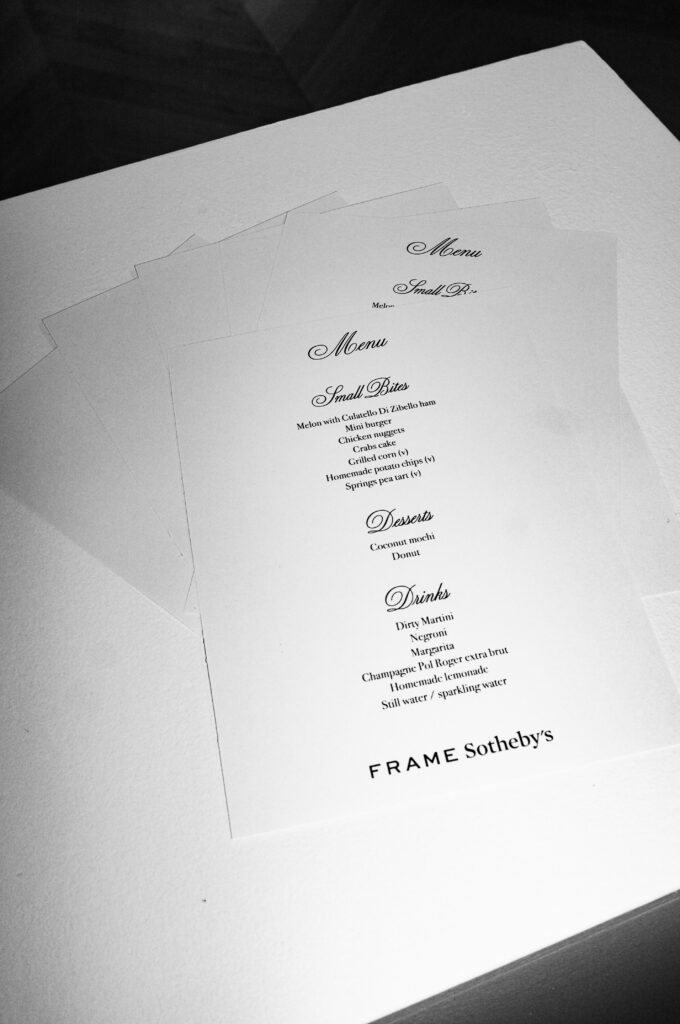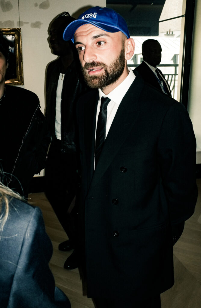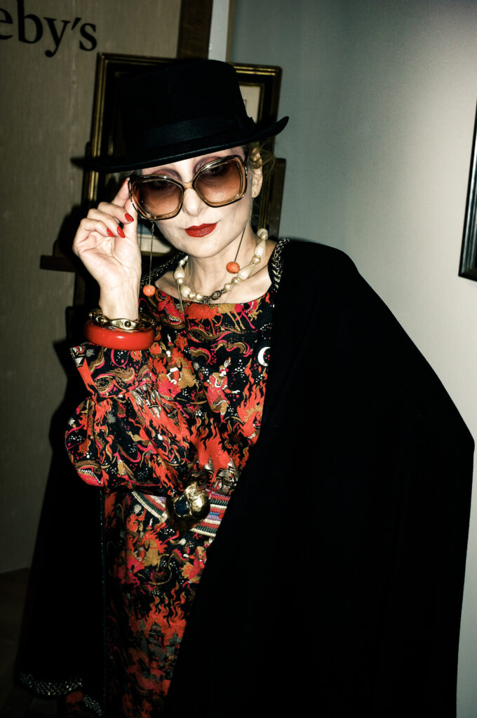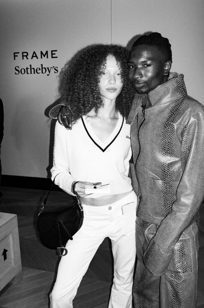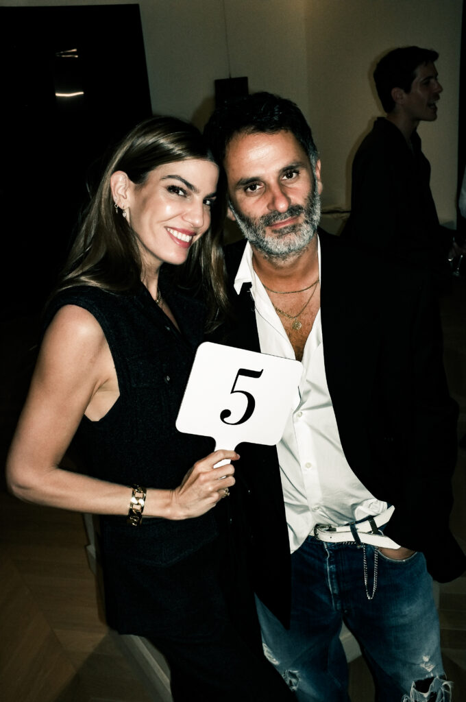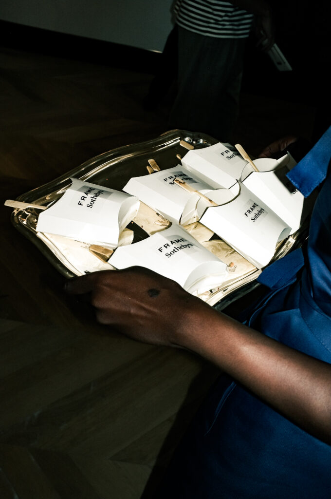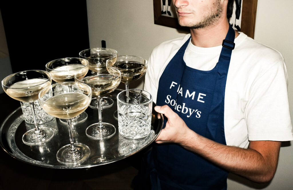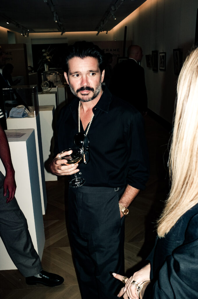 Dans le hall néoclassique, les murs se parent de clichés signés Sean Thomas ; les serveurs portent des tabliers façon manutentionnaires d’œuvres d’art, plateau d’épi de maïs grillé à la main (clin d’œil au nanny-state snacking des previews new-yorkaises). Les invités – de Bianca Brandolini à Derek Blasberg – reçoivent une palette d’enchères numérotée : lot à décrocher via tombola, de la caisse Bollinger à la visite privée des réserves Sotheby’s, un vêtement de la capsule greffé à chaque gain.