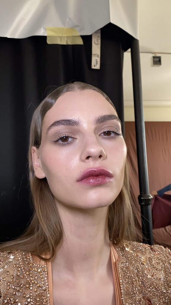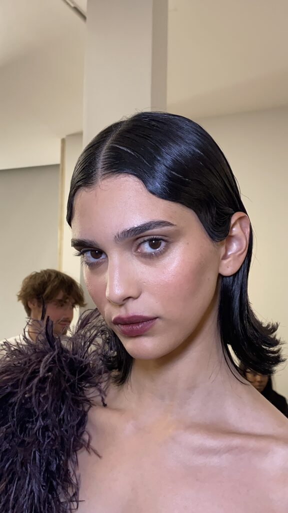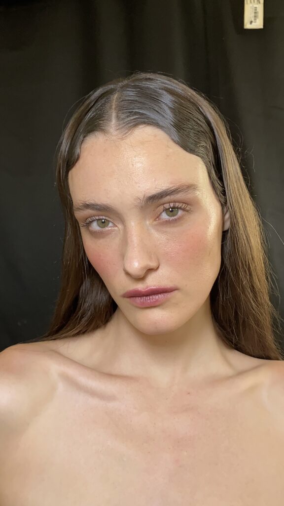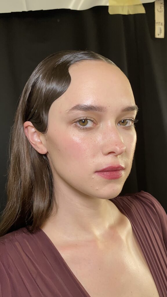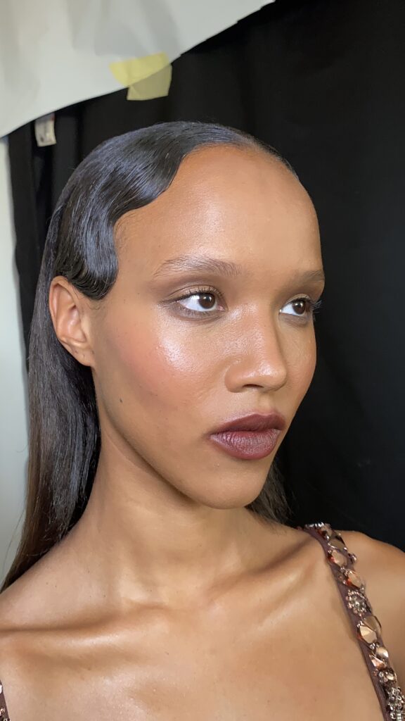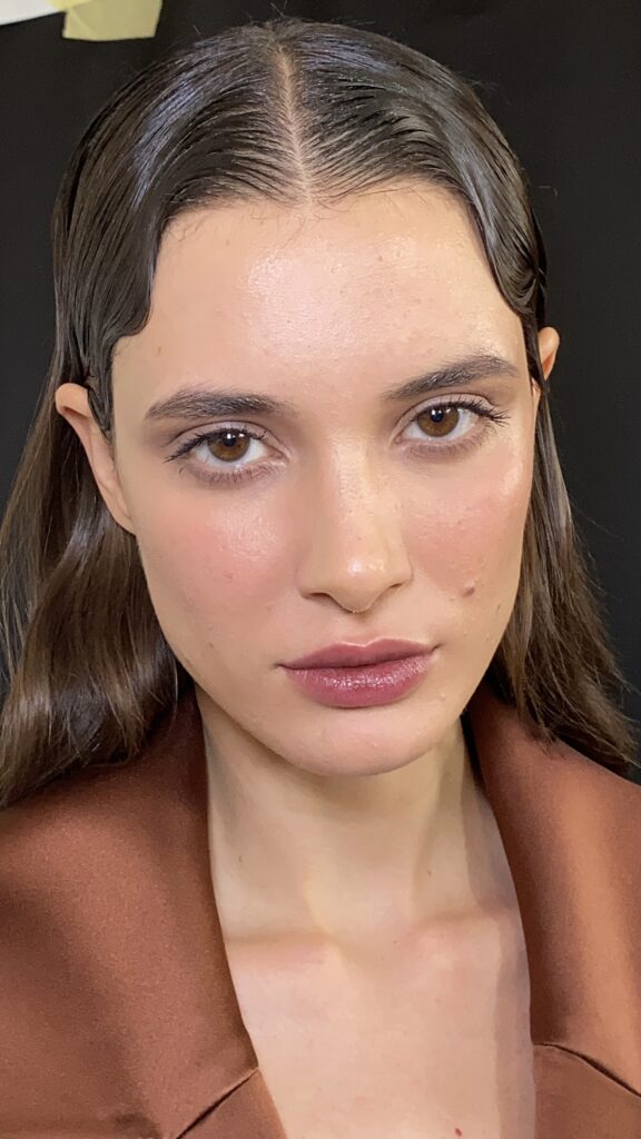 La bouche devient enfin point de tension : Lip Glazer “Nightmoth” et Macximal Matte “Antique Velvet” s’unissent pour créer une teinte prune floutée, appliquée au doigt, comme un fruit rouge effleuré. L’effet est mordant, spontané, sensuel – une touche d’indiscipline chic dans cet équilibre peau-glamour.