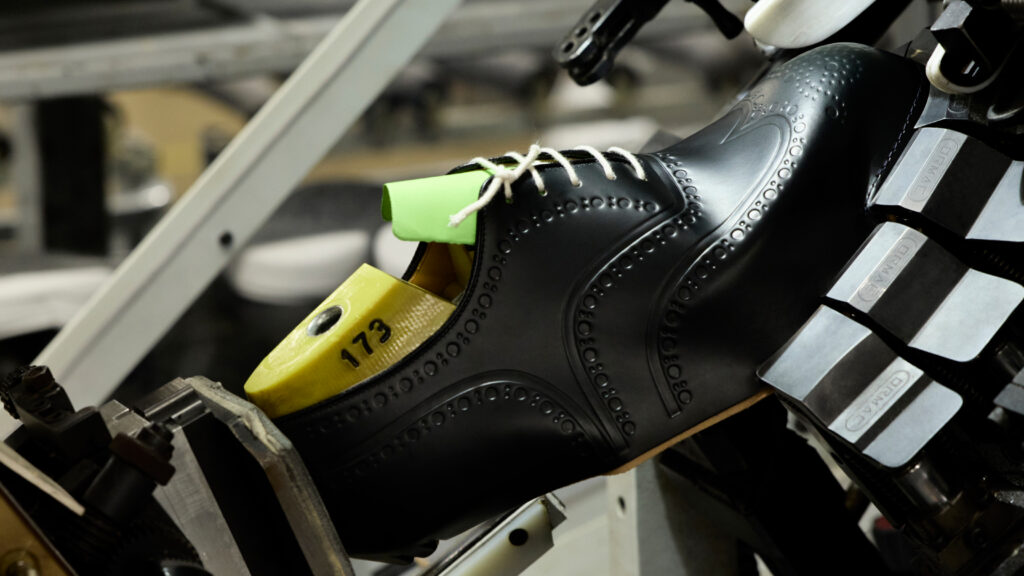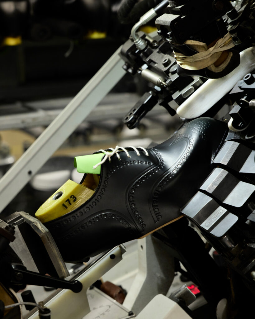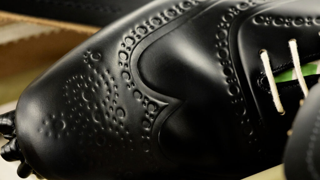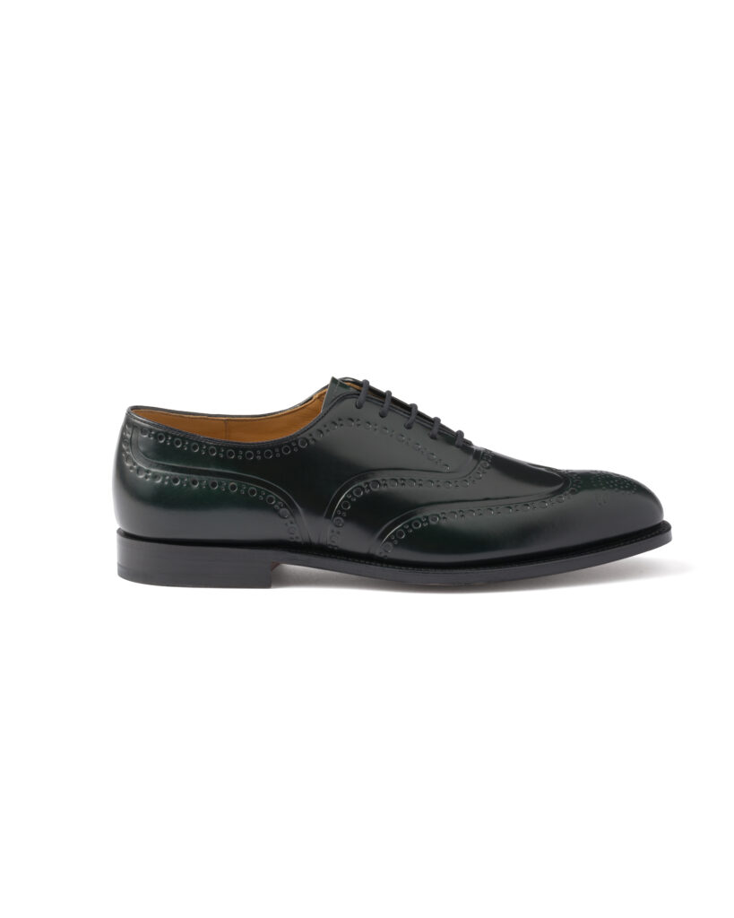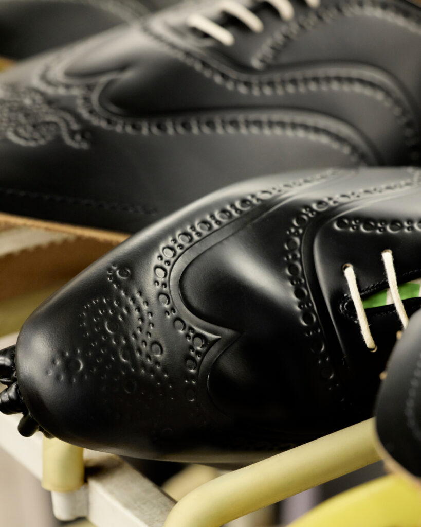 Chaque paire, disponible en cuir brossé noir, bleu marine ou vert bois, rend hommage à la précision anglaise. La gravure numérique, qui redessine le bout fleuri emblématique sans altérer la souplesse du cuir, illustre une volonté claire : honorer le passé tout en embrassant le futur. Ce design innovant sublime la tige sans en compromettre la structure ni les propriétés fonctionnelles.