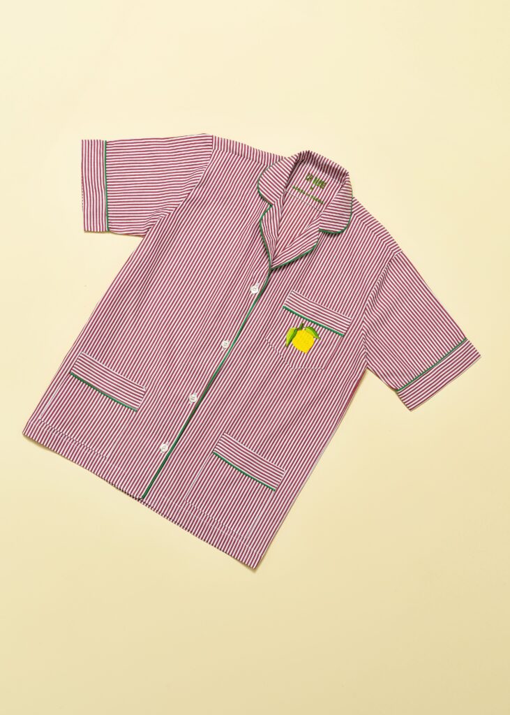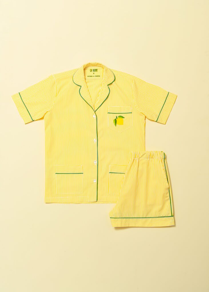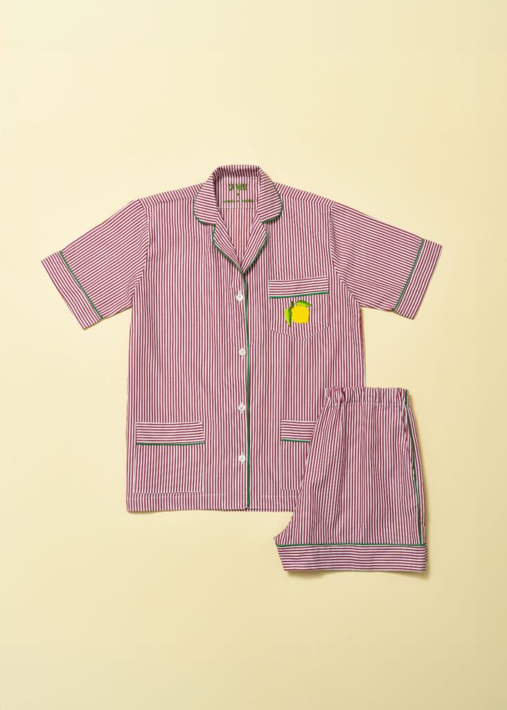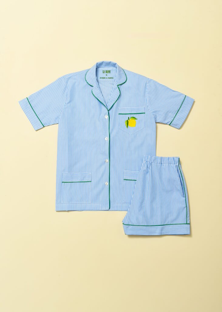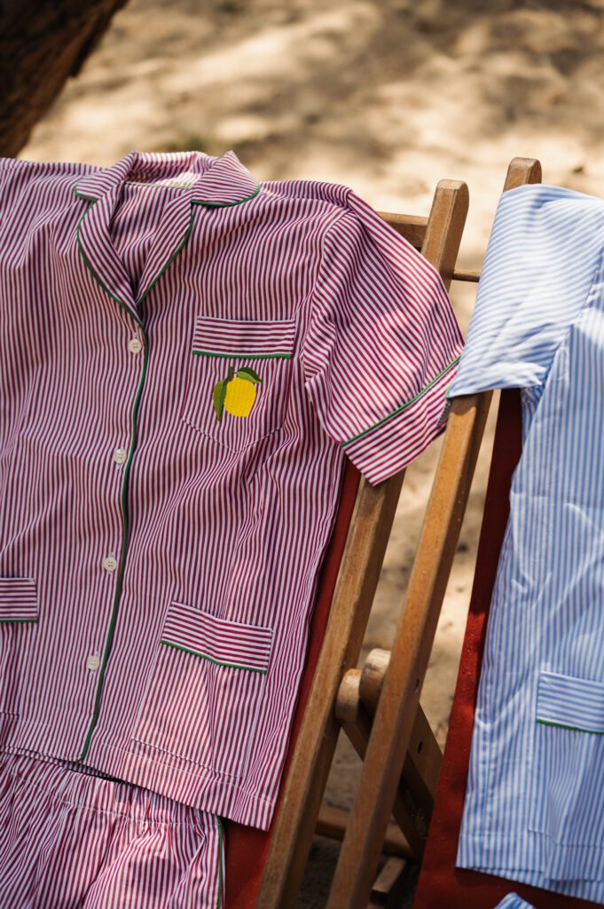 Trois modèles de pyjamas en coton léger, à la coupe volontairement décontractée, reprennent les rayures iconiques de la Maison — jaune citron, bleu Riviera, rouge vermillon — chaque pièce étant subtilement brodée d’un citron espiègle, clin d’œil graphique aux agrumes chers à la marque. Ces pyjamas convoquent l’imaginaire des vacances italiennes, entre bord de mer, apéritifs sur les balcons ensoleillés et escapades élégantes.