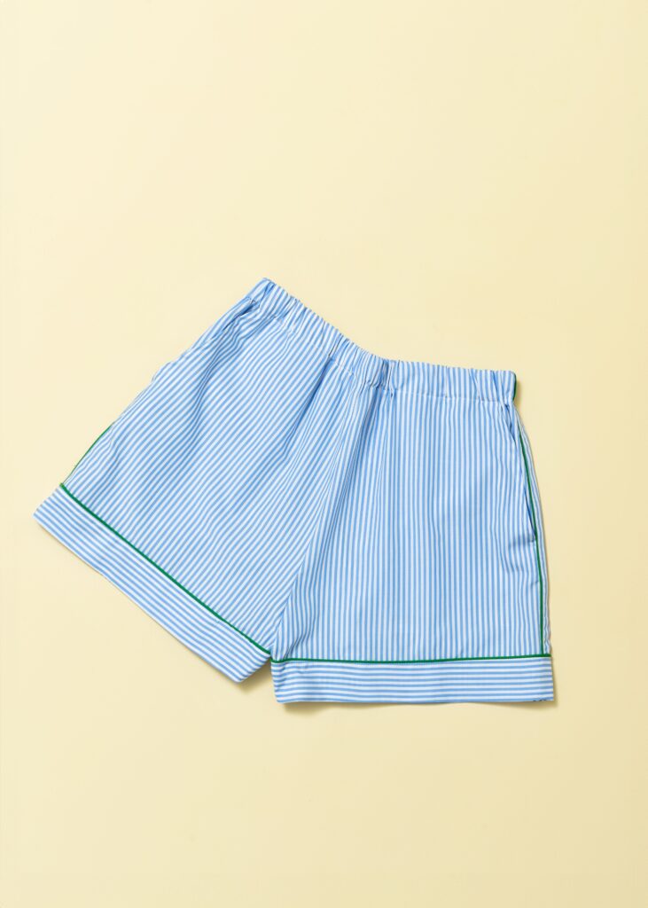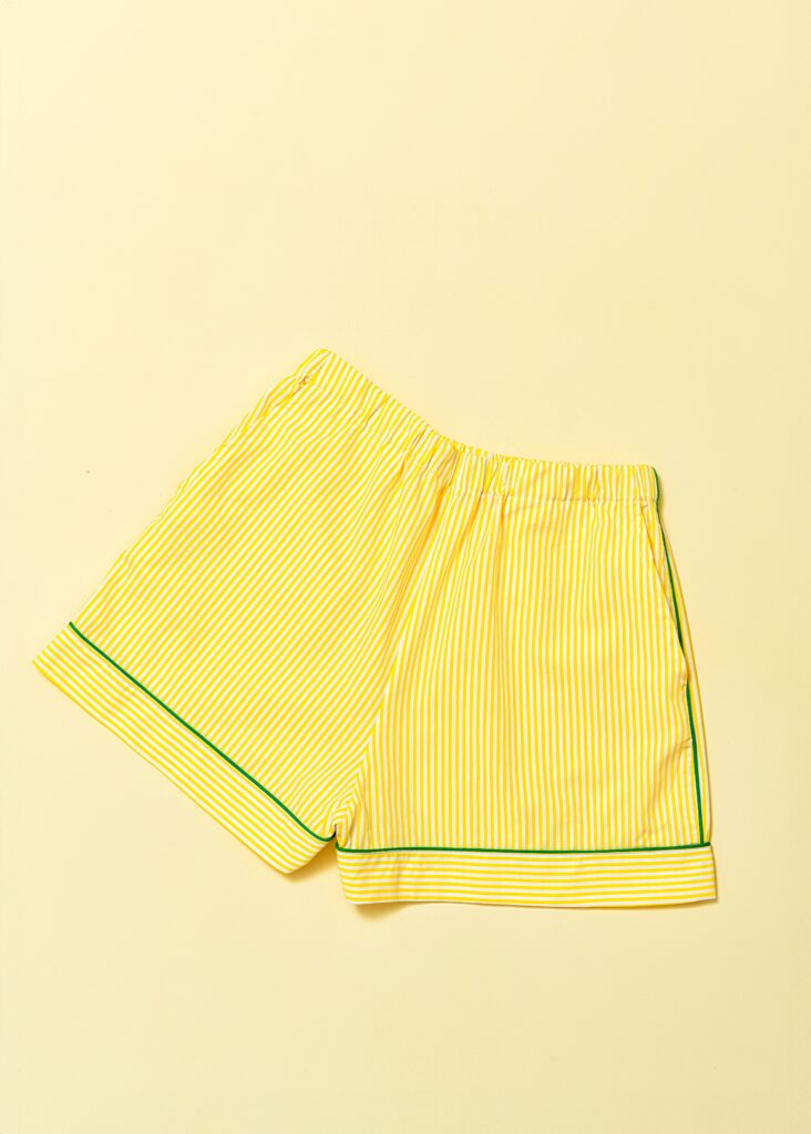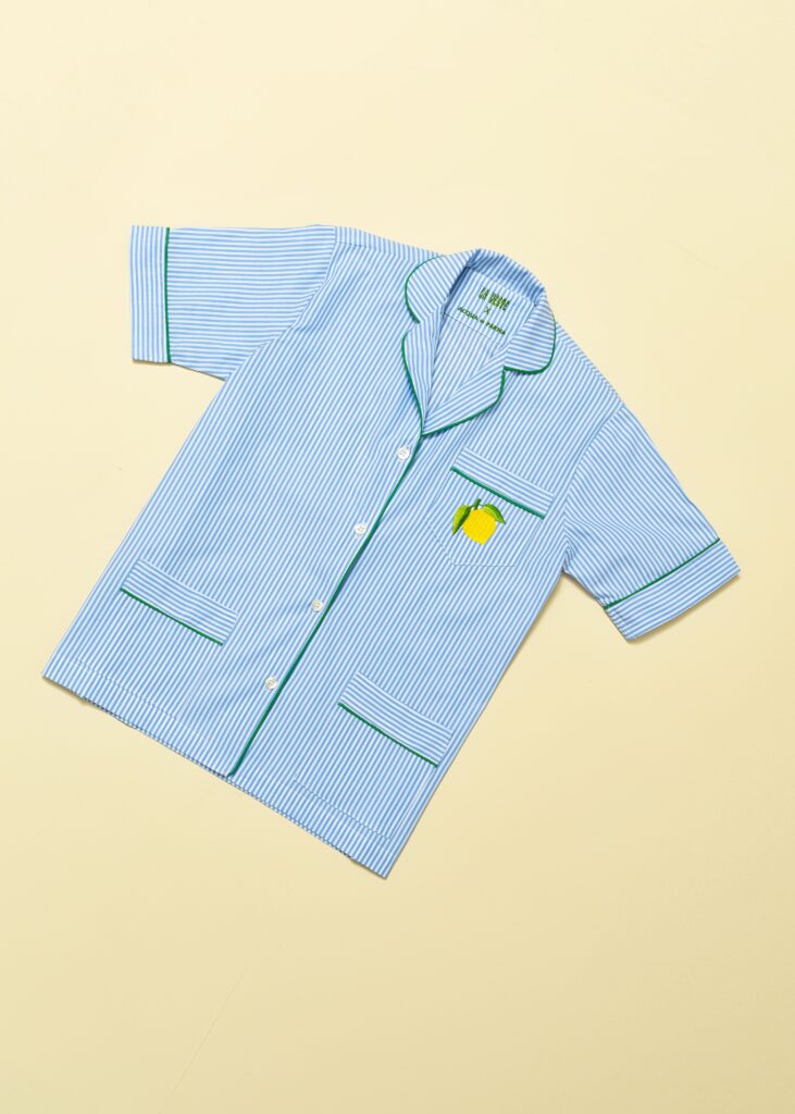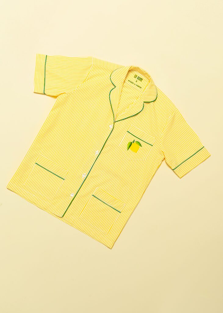 Trois modèles de pyjamas en coton léger, à la coupe volontairement décontractée, reprennent les rayures iconiques de la Maison — jaune citron, bleu Riviera, rouge vermillon — chaque pièce étant subtilement brodée d’un citron espiègle, clin d’œil graphique aux agrumes chers à la marque. Ces pyjamas convoquent l’imaginaire des vacances italiennes, entre bord de mer, apéritifs sur les balcons ensoleillés et escapades élégantes.