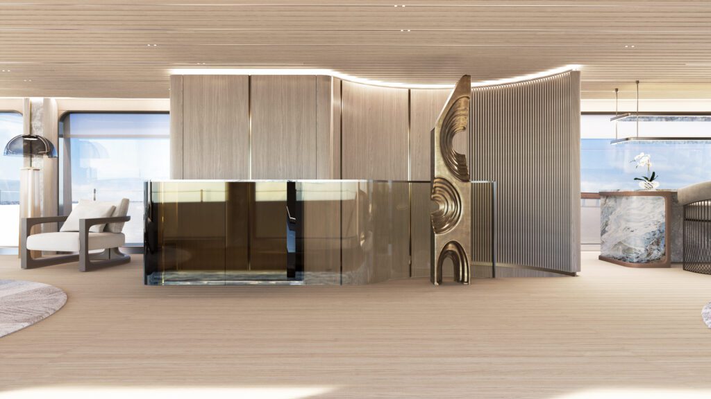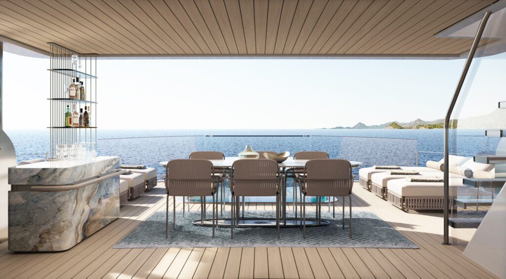 Le plan général rompt avec les conventions : les suites invités quittent le pont inférieur pour s’aligner, pleine vue mer, sur le pont principal aux côtés d’une master full-beam baignée de lumière. Libéré, l’entrepont devient domaine technique, tandis que le pont supérieur se transforme en loft panoramique entièrement ouvrable — dedans et dehors fusionnent dans une transparence inédite . Tout en haut, un sun-deck de 80 m² offre un observatoire privé sur quatre niveaux de vie .