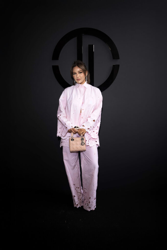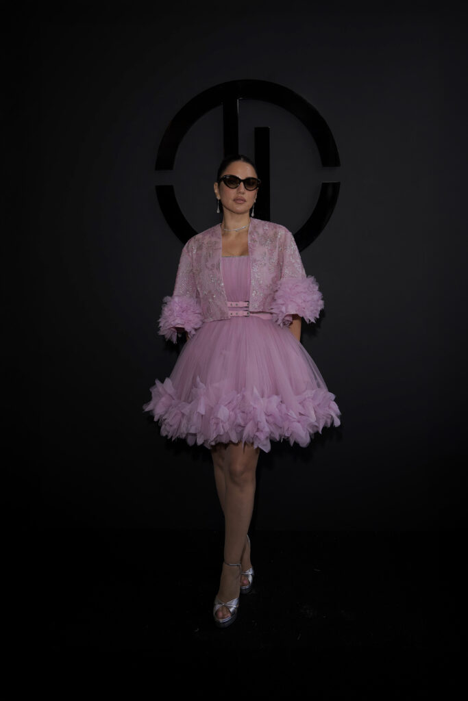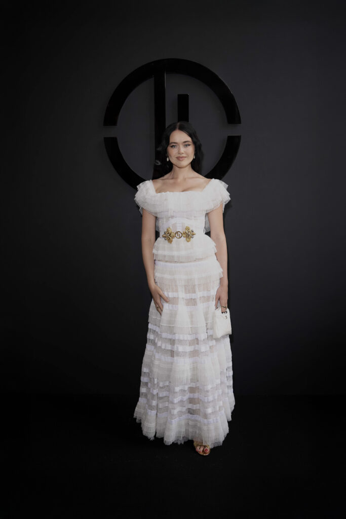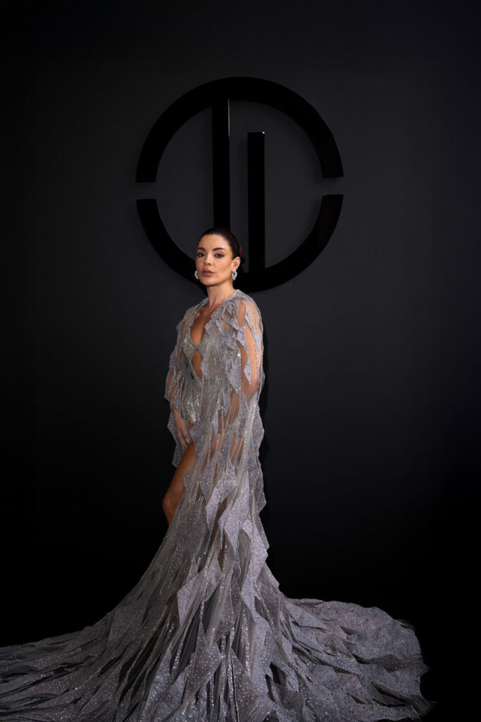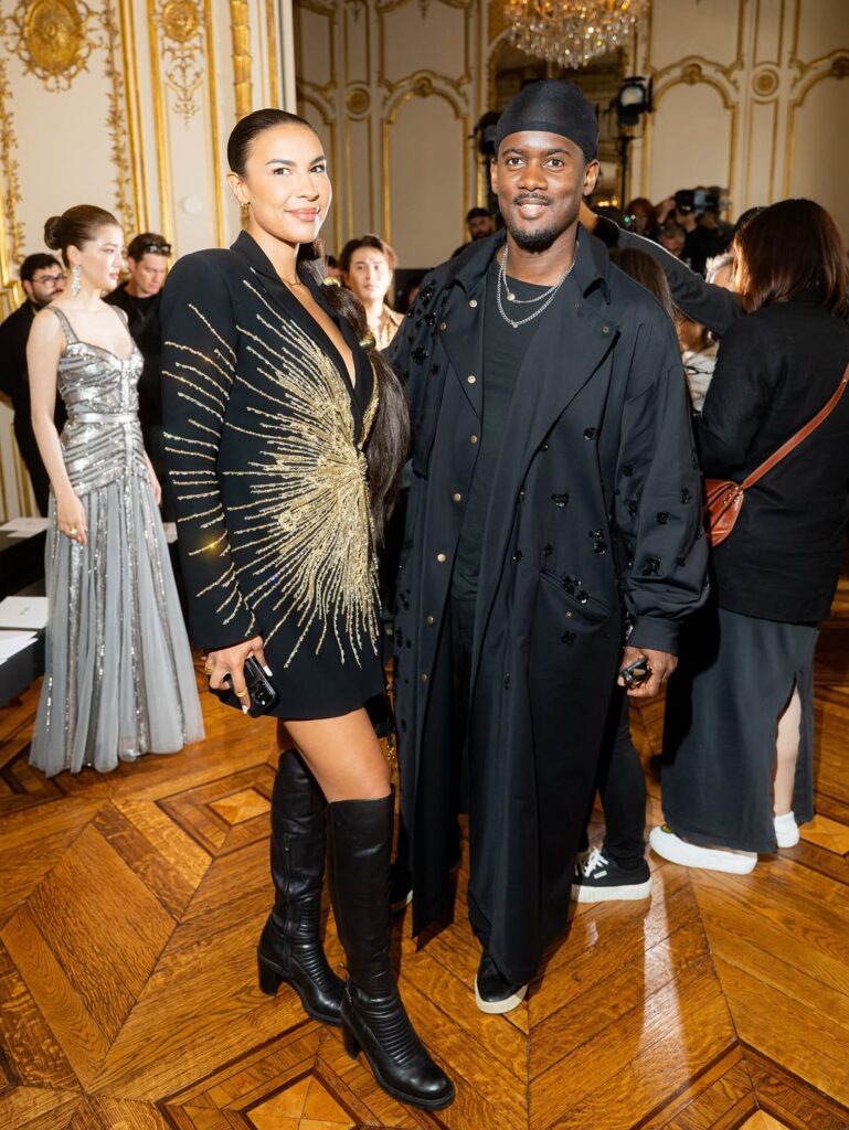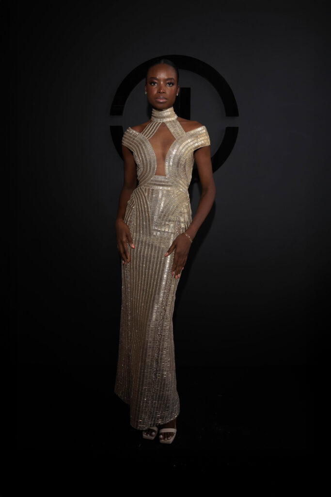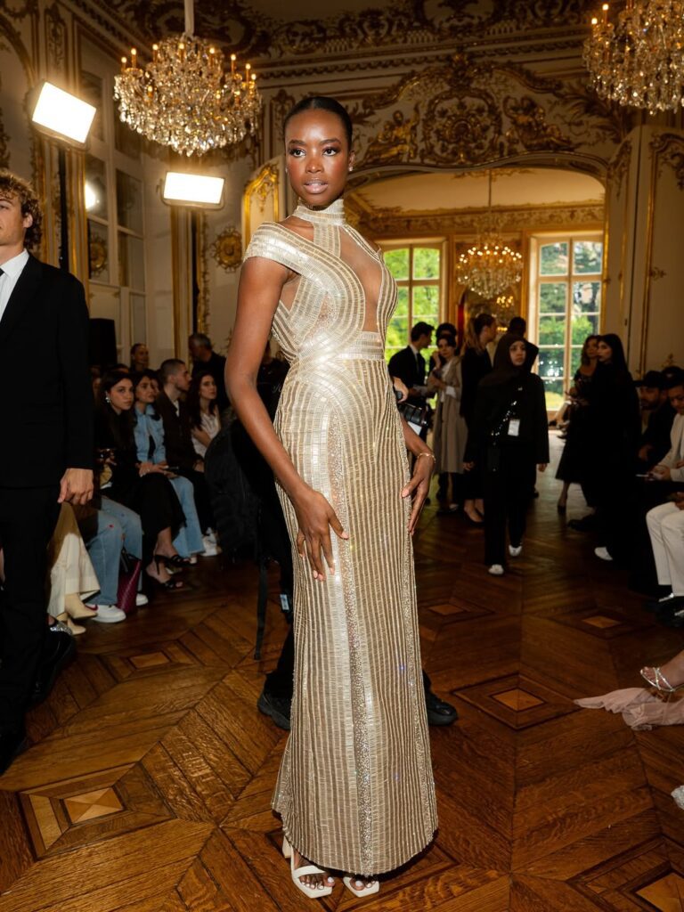 La beauté, elle aussi, se veut sculpturale : peau lumineuse, pommettes dessinées comme des bas-reliefs, regards fardés de bronze chaud et chevelures effet mouillé. Chaque mannequin — parmi lesquelles Didi Stone, Maria Borges, Esha Gupta ou encore Afiya Bennett — devient un personnage, une énigme en mouvement, emportée par la cadence dramatique d’un show à la lisière du rituel.