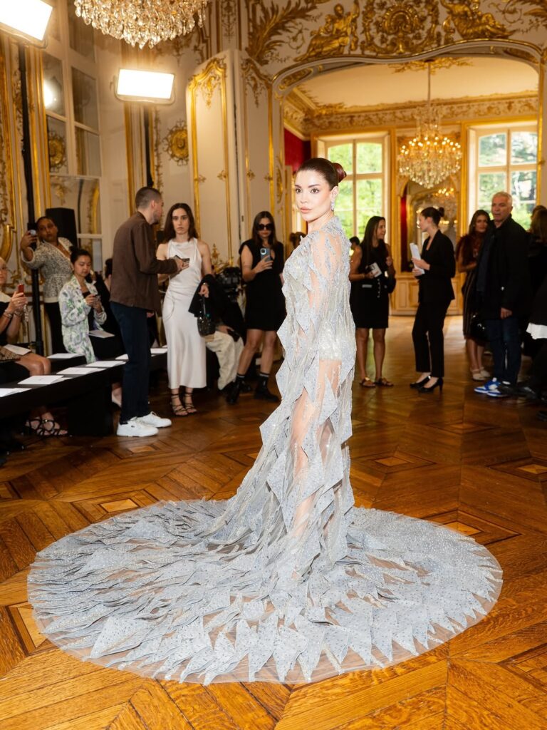 La palette, volontairement contrastée, oscille entre tons célestes et terrestres, rouges profonds et reflets fondus de métaux. L’ensemble évoque une alchimie stylistique où chaque pièce semble figée entre deux époques : la féerie baroque d’un Versailles déstructuré et la rigueur dystopique d’un futur opalescent. Certaines robes, véritables totems artisanaux, requièrent jusqu’à 700 heures de travail minutieux — affirmation d’un savoir-faire qui refuse la précipitation.