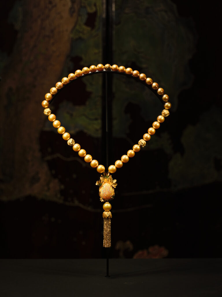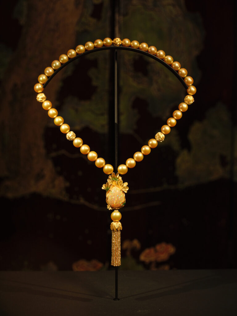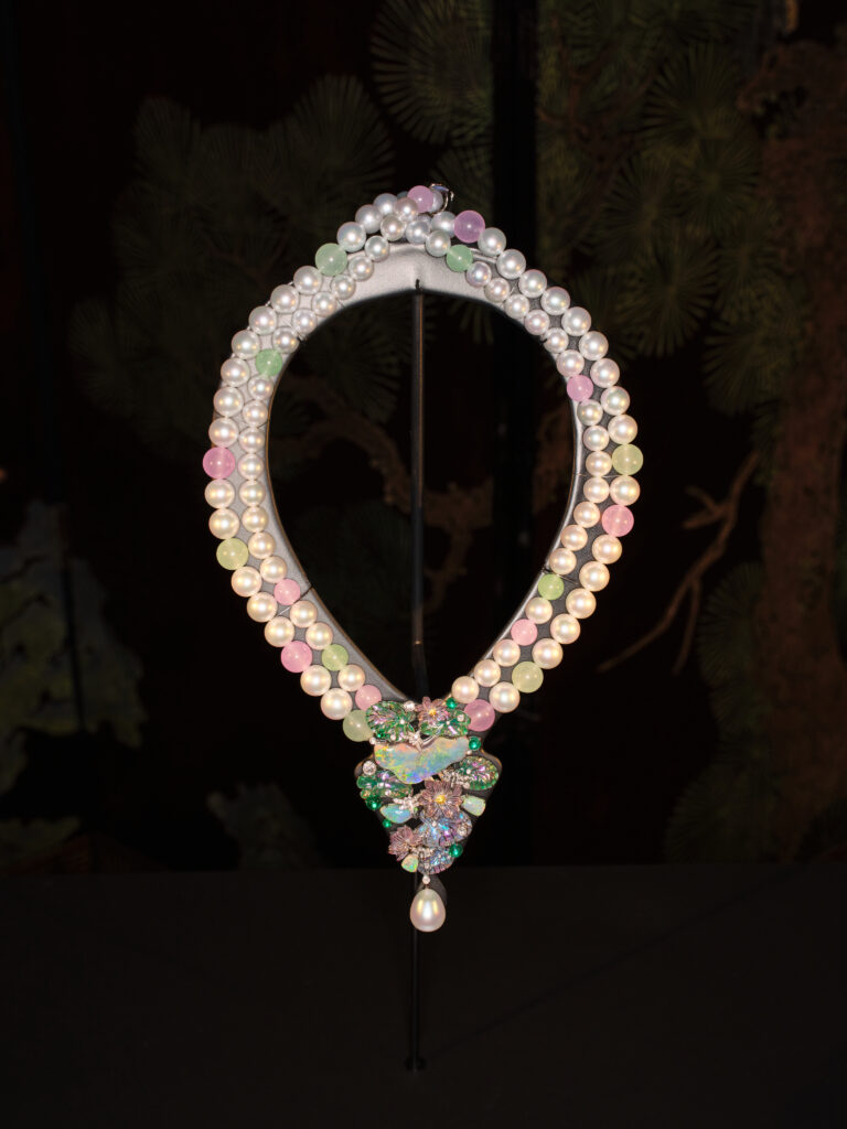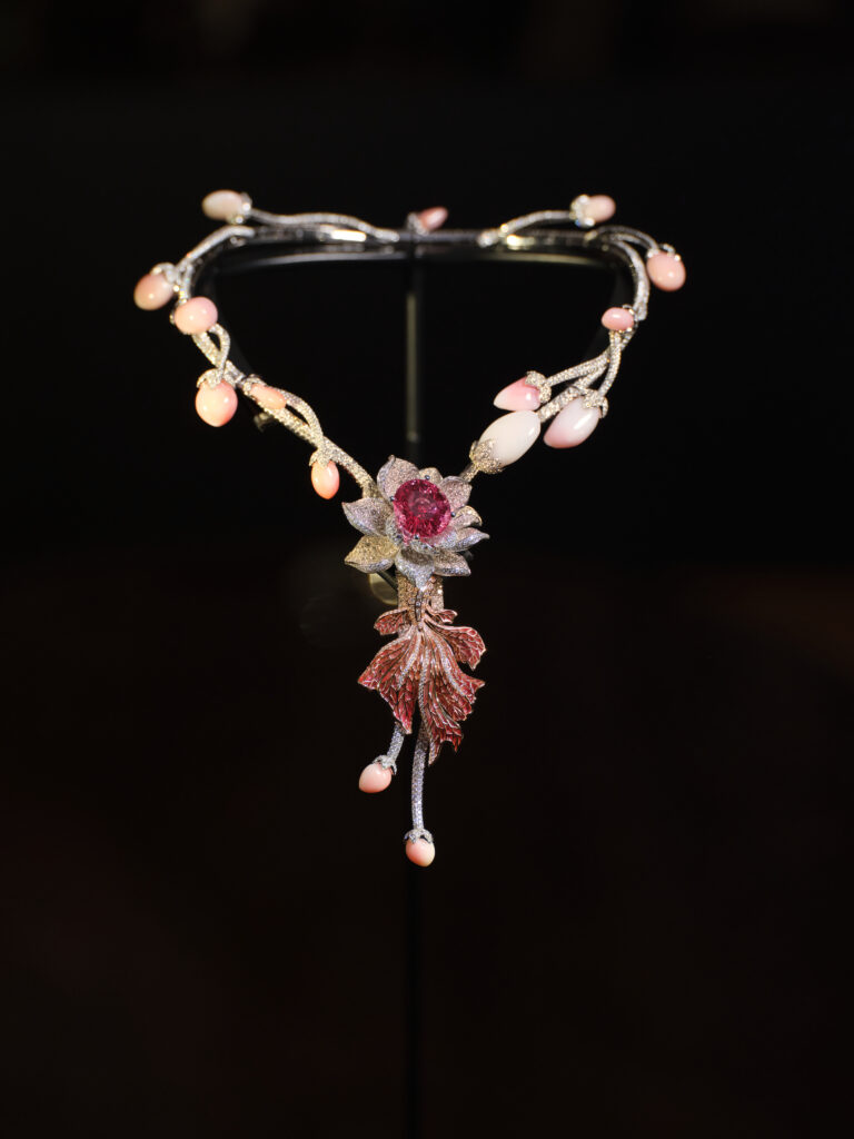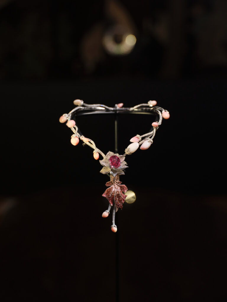 Pièce manifeste, le collier Nymphéa Levant fait trôner un saphir Padparadscha de 22,61 ct, ourlé de perles de conque et d’un poisson émaillé plique-à-jour – clin d’œil à la poésie orientale que cultive Christine Chen . La pierre, parmi les plus rares certifiées au monde, irradie comme un lotus à l’aurore, reliant instantanément Giverny à Shanghaï.