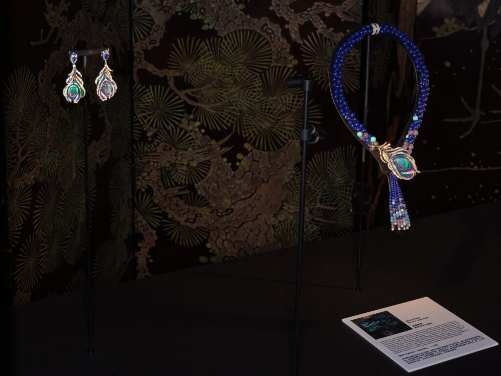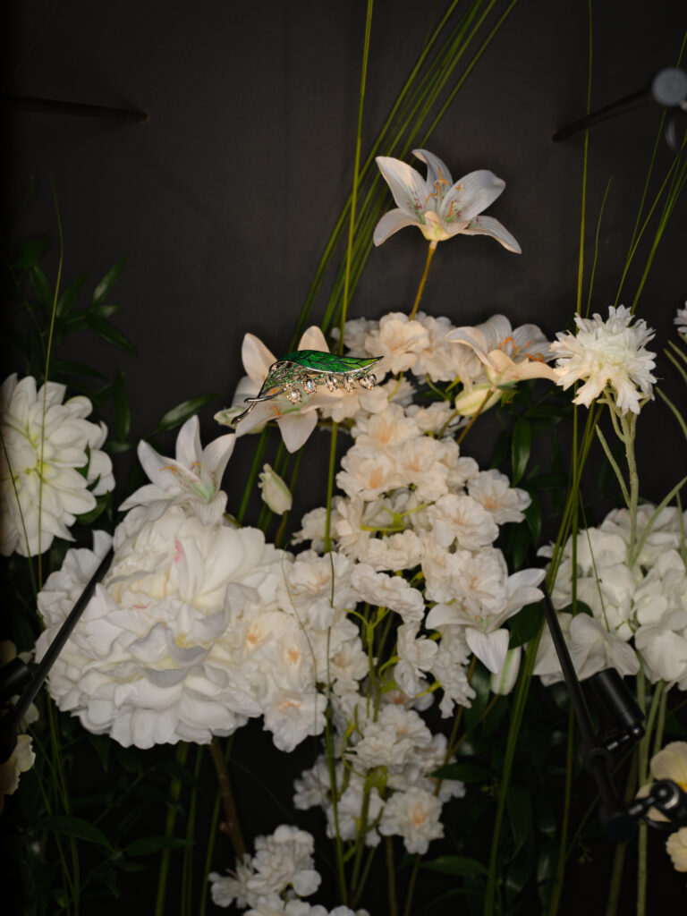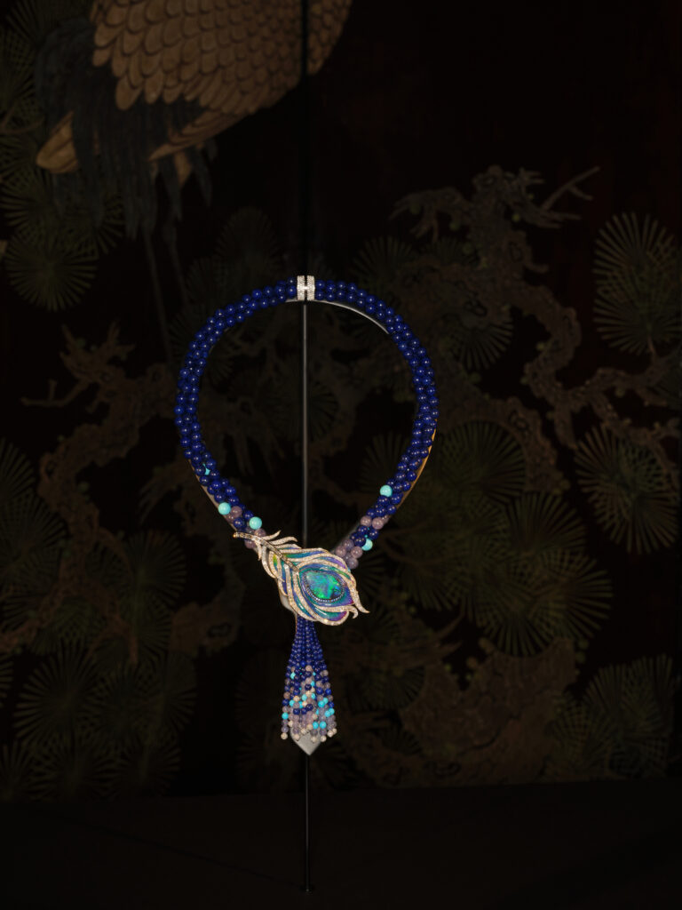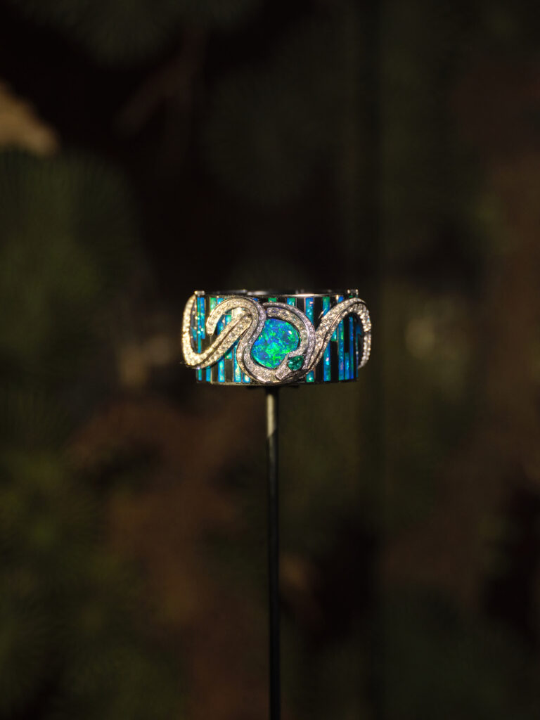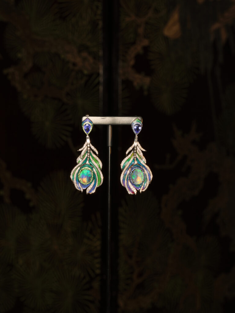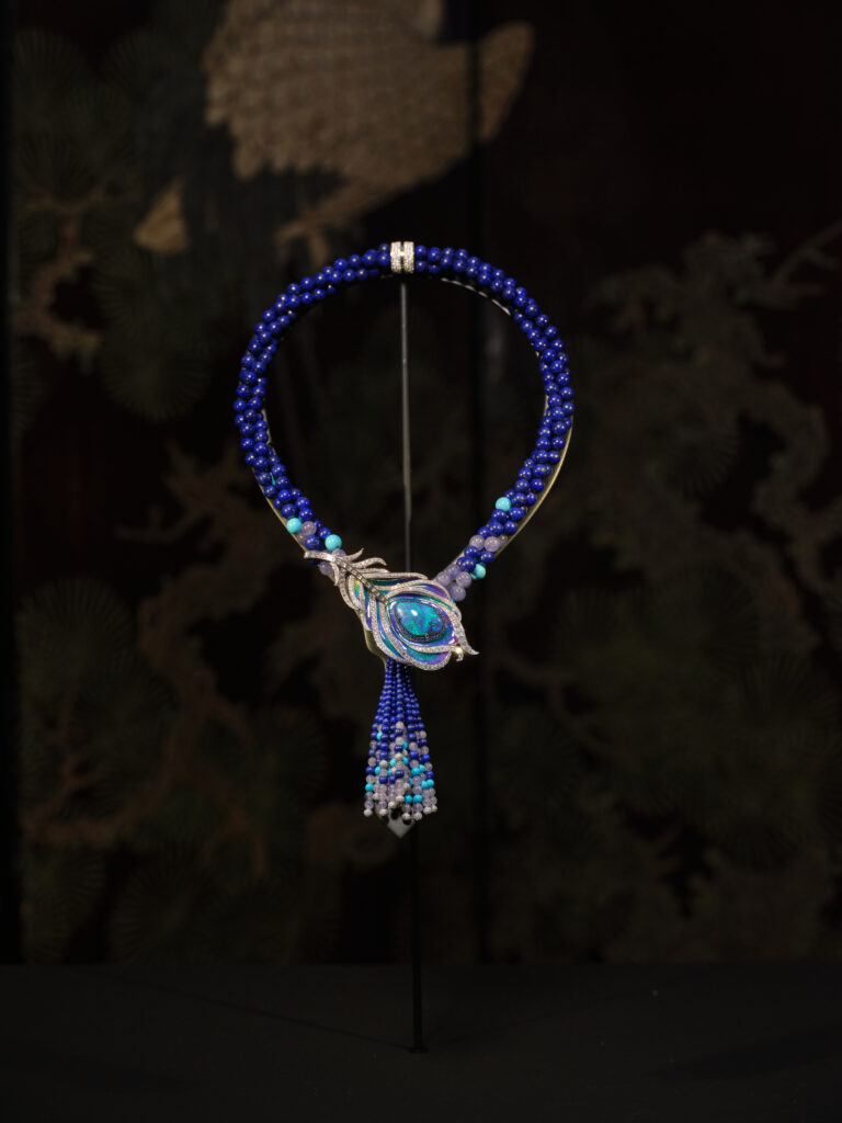 De la dentelle titane incrustée de saphirs taille rose (Secret de Jardin) à la gravure « flux veiné » qui satine l’or sur le collier Rêve du Gingko, la technique épouse le récit : 3 000 heures de travail pour le collier Rêve d’Iris et plus de 1 000 composants invisibles dans le bijou trembleuse Rêve de Nymphéa. Chaque pierre – qu’il s’agisse d’opale noire australienne de 16,38 ct ou de tanzanite lavande – est sélectionnée pour son aura, non pour sa seule carat-métrie.