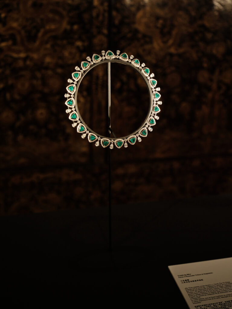 - Trinité du Rêve – 22 émeraudes de Colombie taillées en trillion flottent sur cristal de roche, hommage au principe Ciel-Terre-Homme du taoïsme .