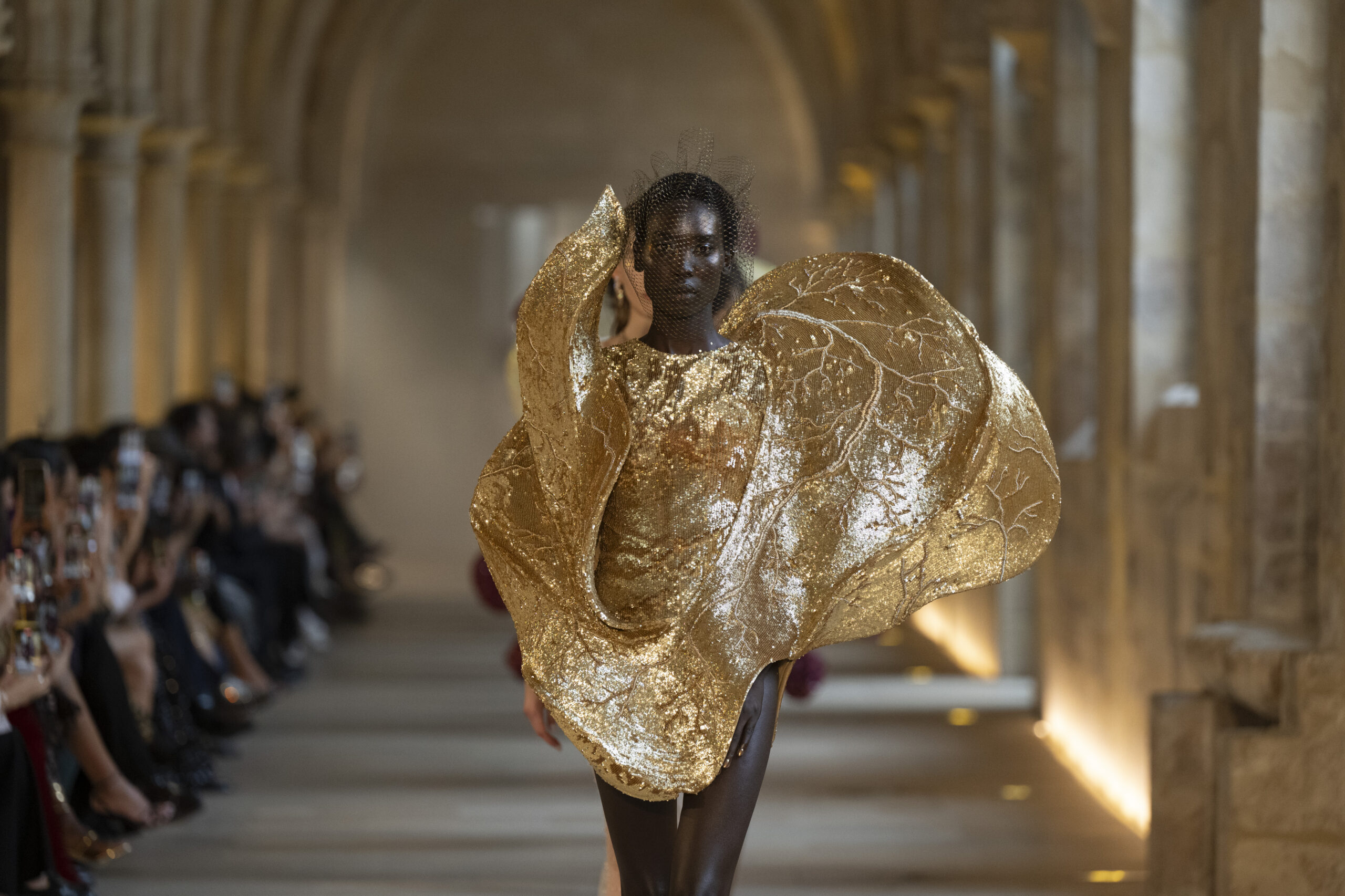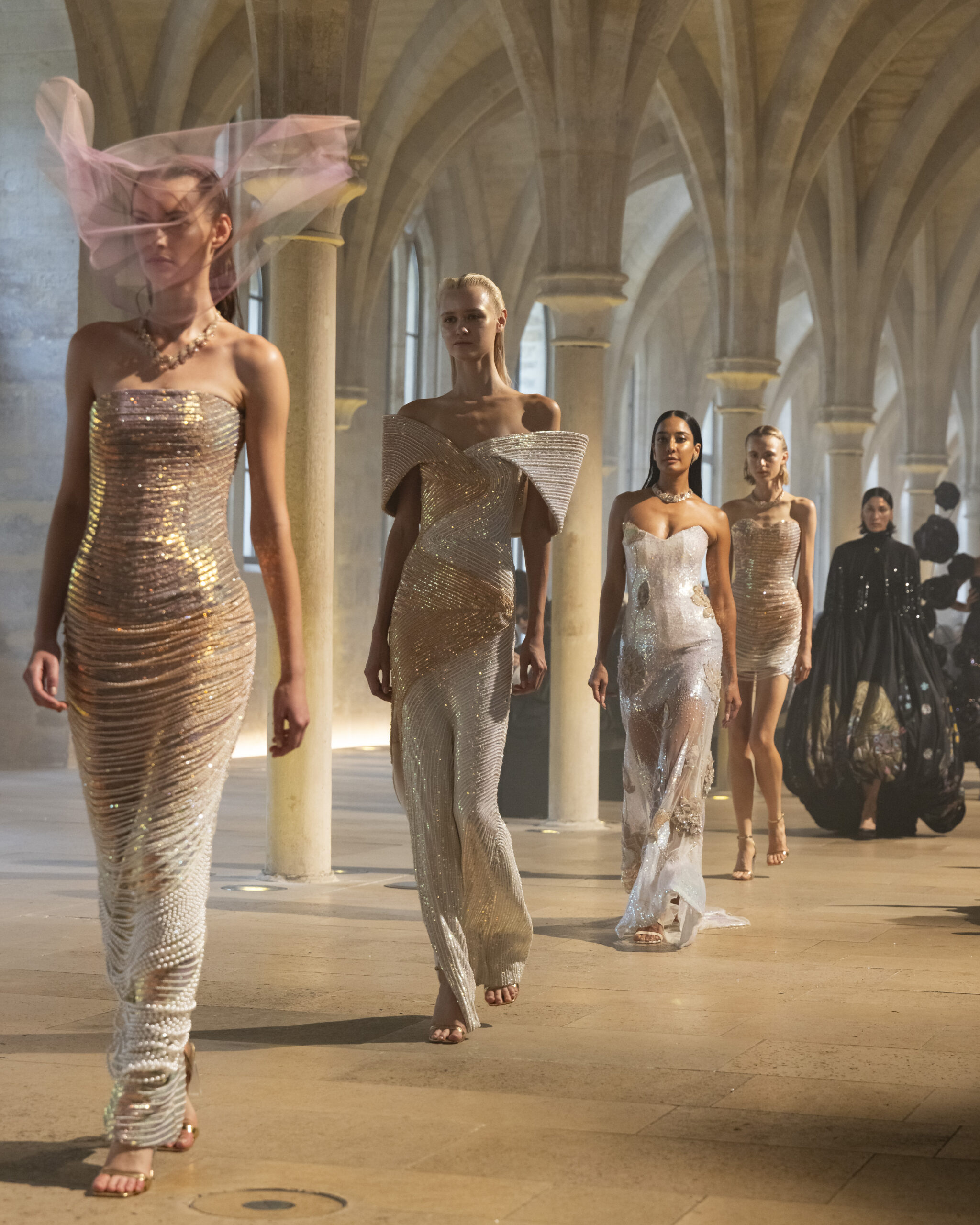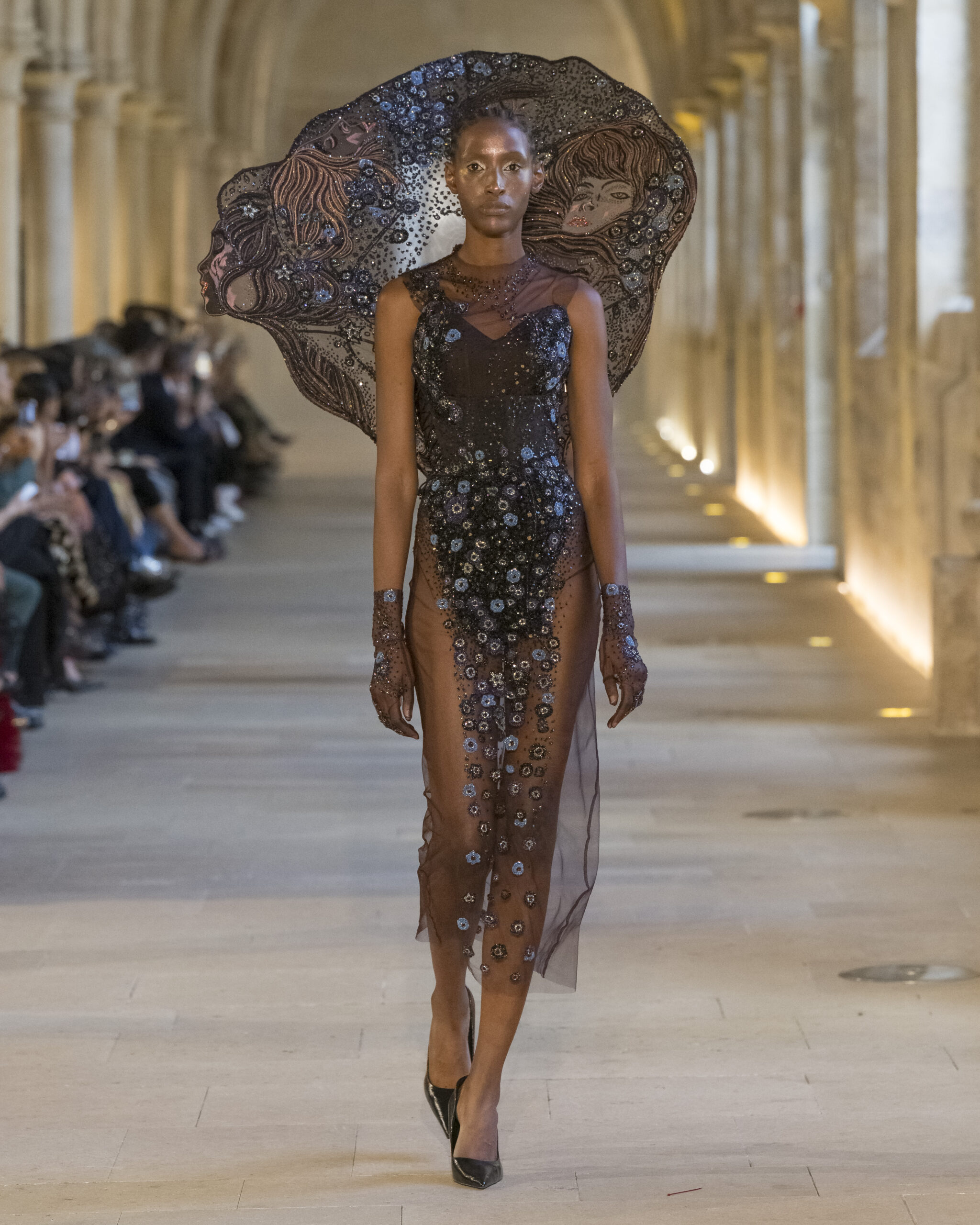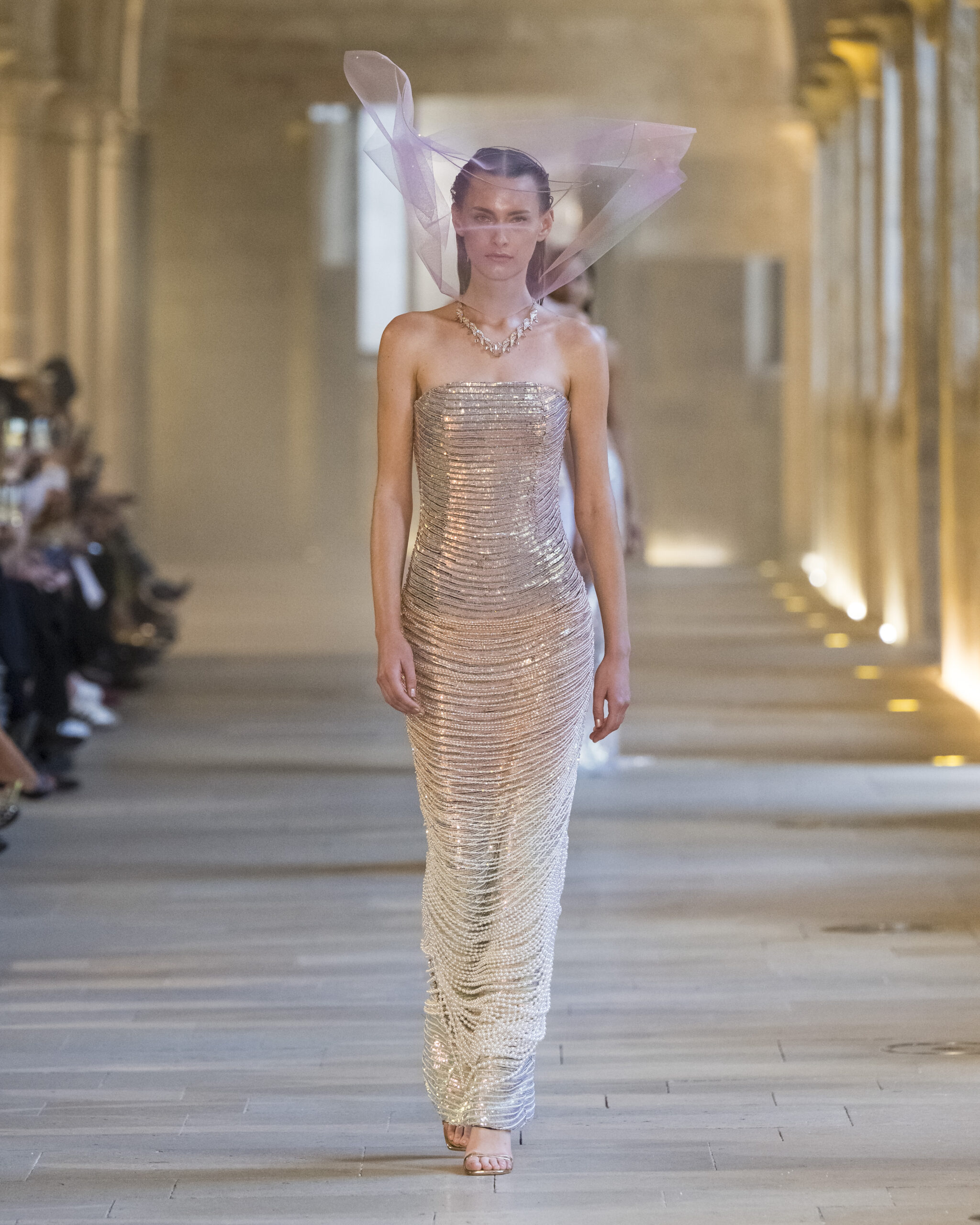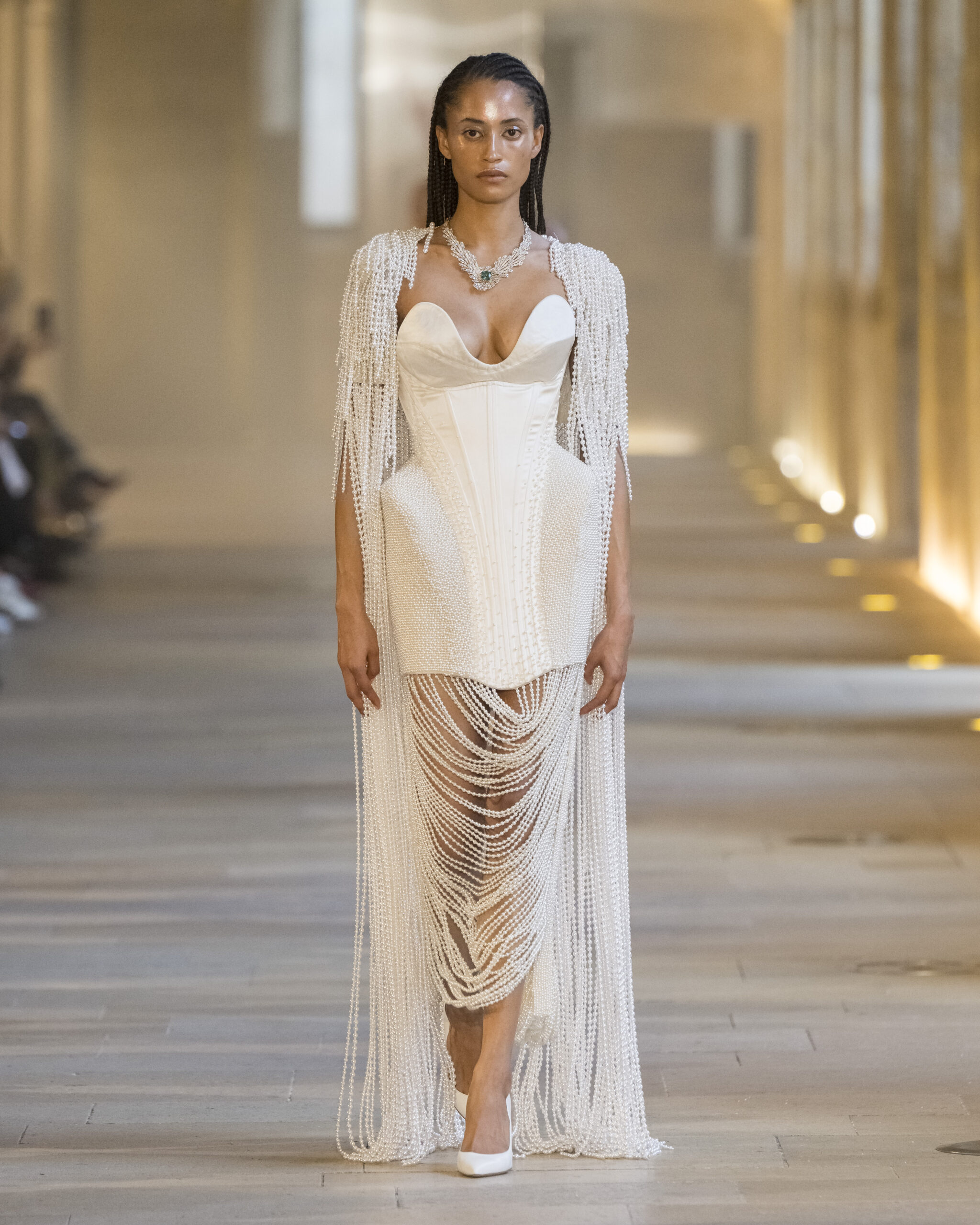 Le maître-modiste londonien orchestre voiles-nuages et tiares sculpturales à l’ampleur quasi baroque. Ses structures, légères comme un souhait, se fondent dans le récit jusqu’à devenir « dialogue silencieux » selon Mishra. Chaque pièce souligne la tension entre révélation et retrait : ce que la robe dévoile, le voile le ré-enfouit, poussant la collection vers une théâtralité méditative.