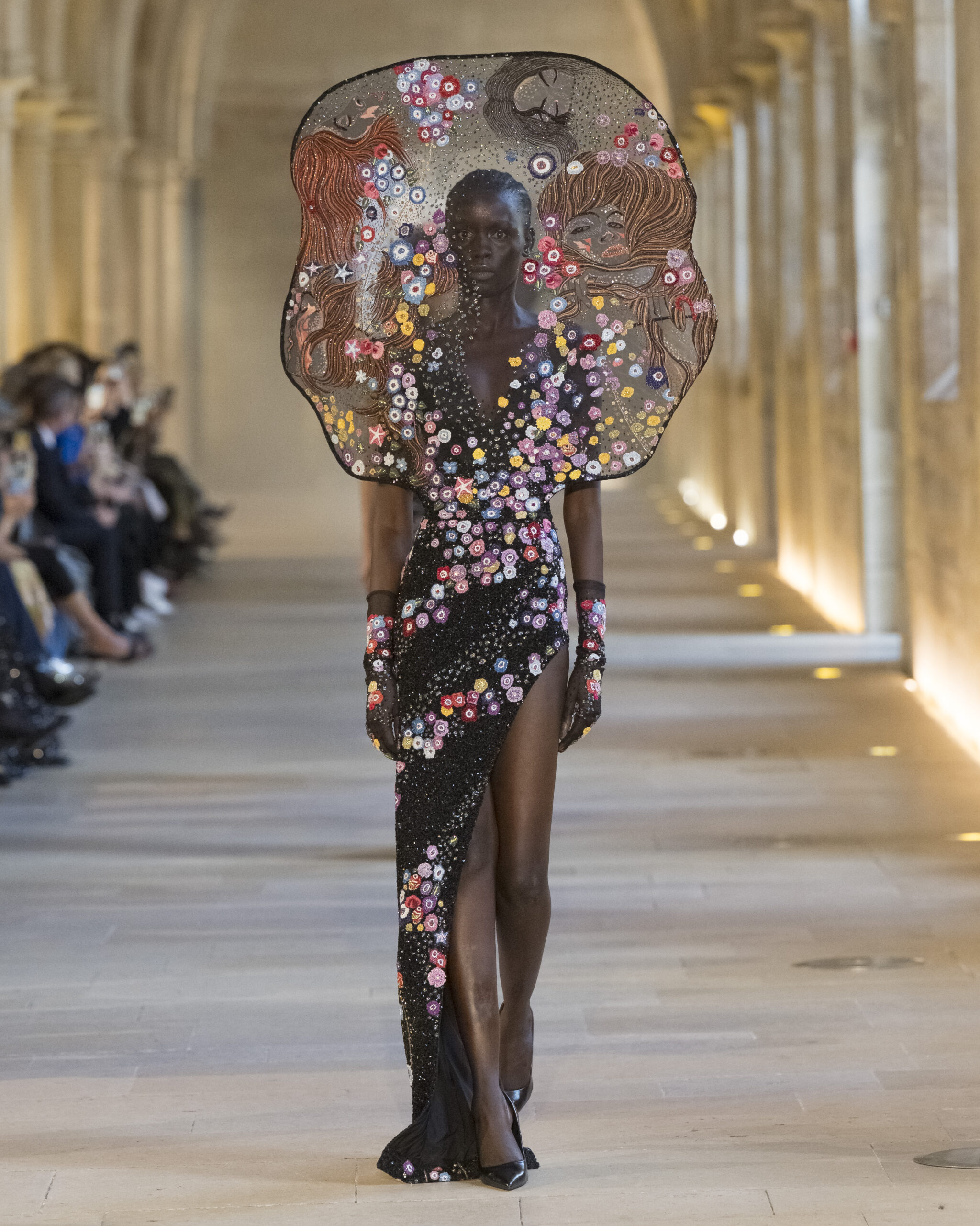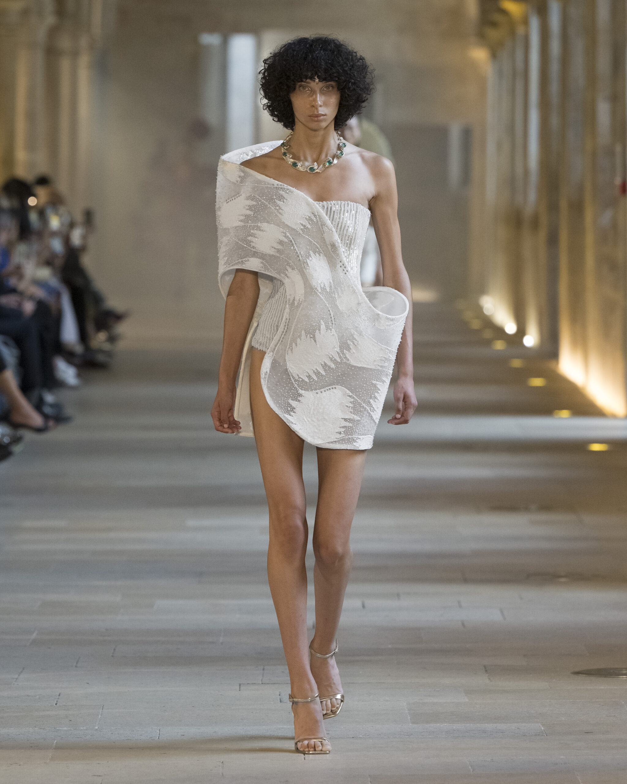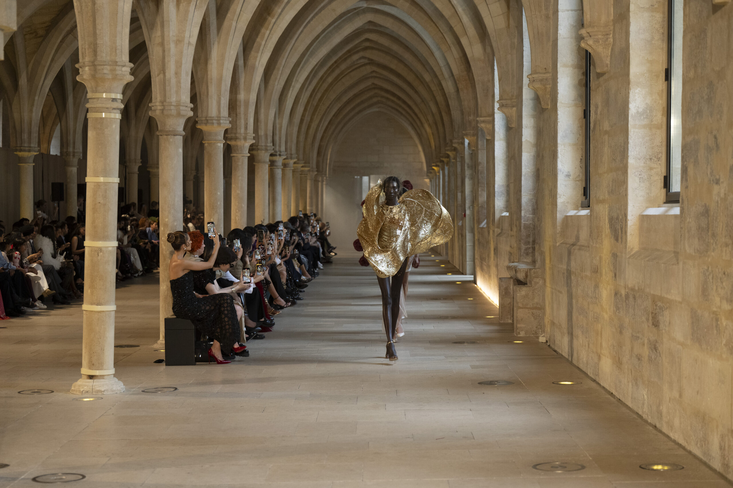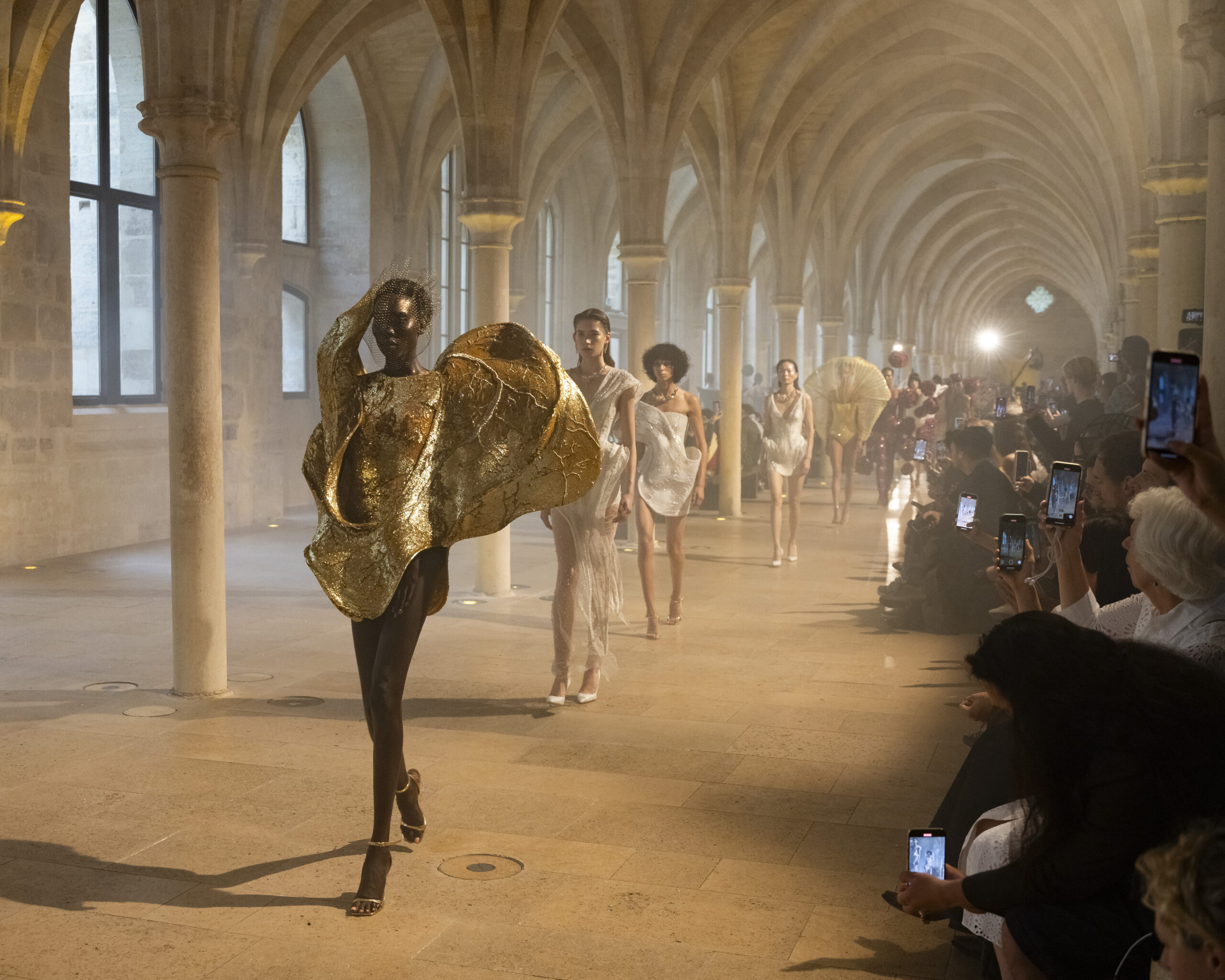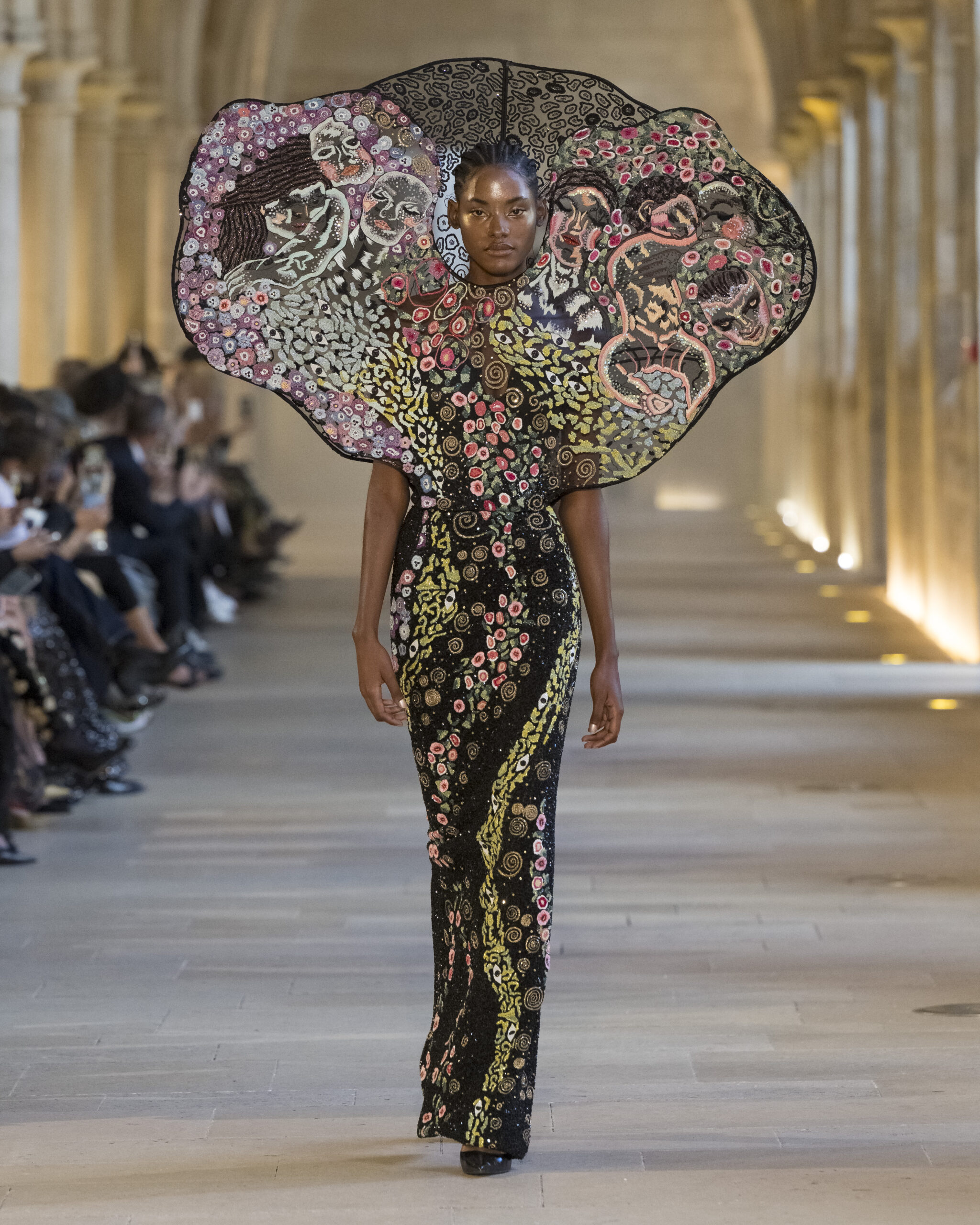 Le maître-modiste londonien orchestre voiles-nuages et tiares sculpturales à l’ampleur quasi baroque. Ses structures, légères comme un souhait, se fondent dans le récit jusqu’à devenir « dialogue silencieux » selon Mishra. Chaque pièce souligne la tension entre révélation et retrait : ce que la robe dévoile, le voile le ré-enfouit, poussant la collection vers une théâtralité méditative.