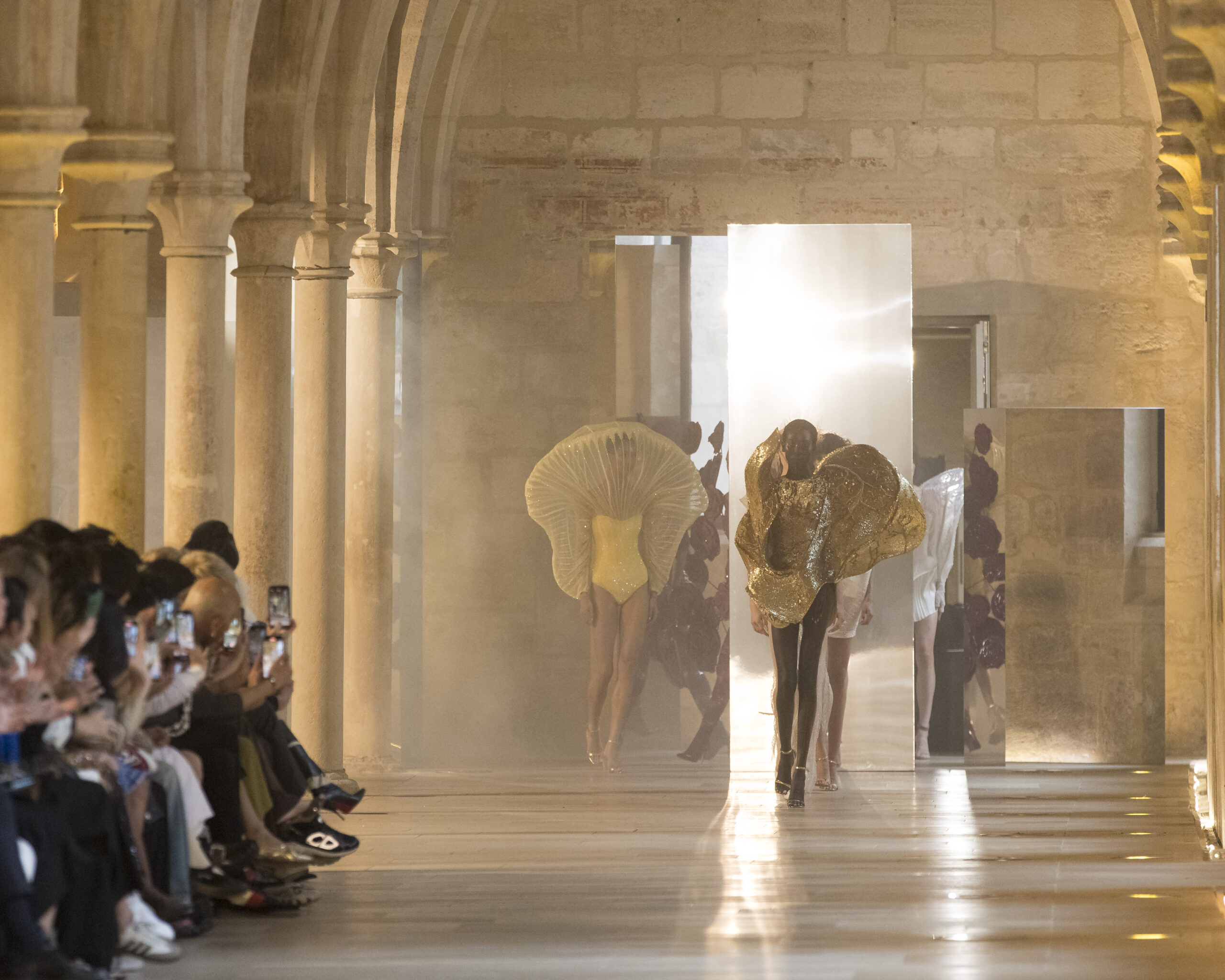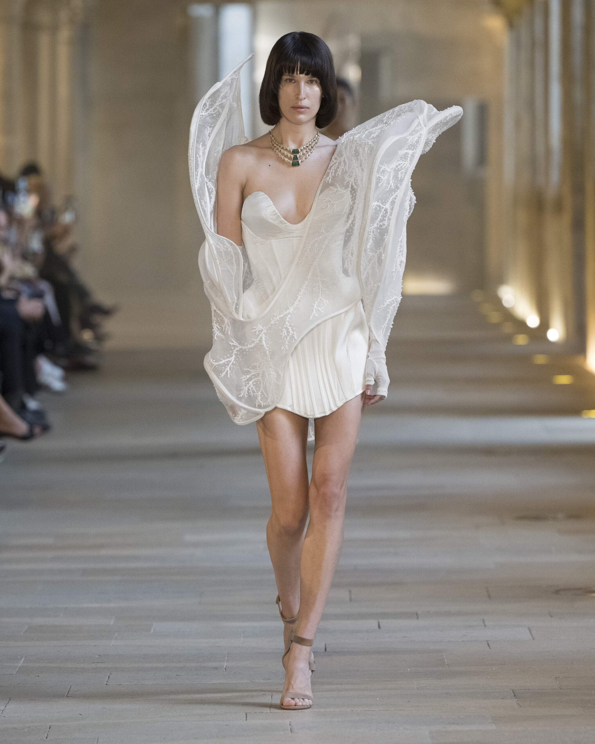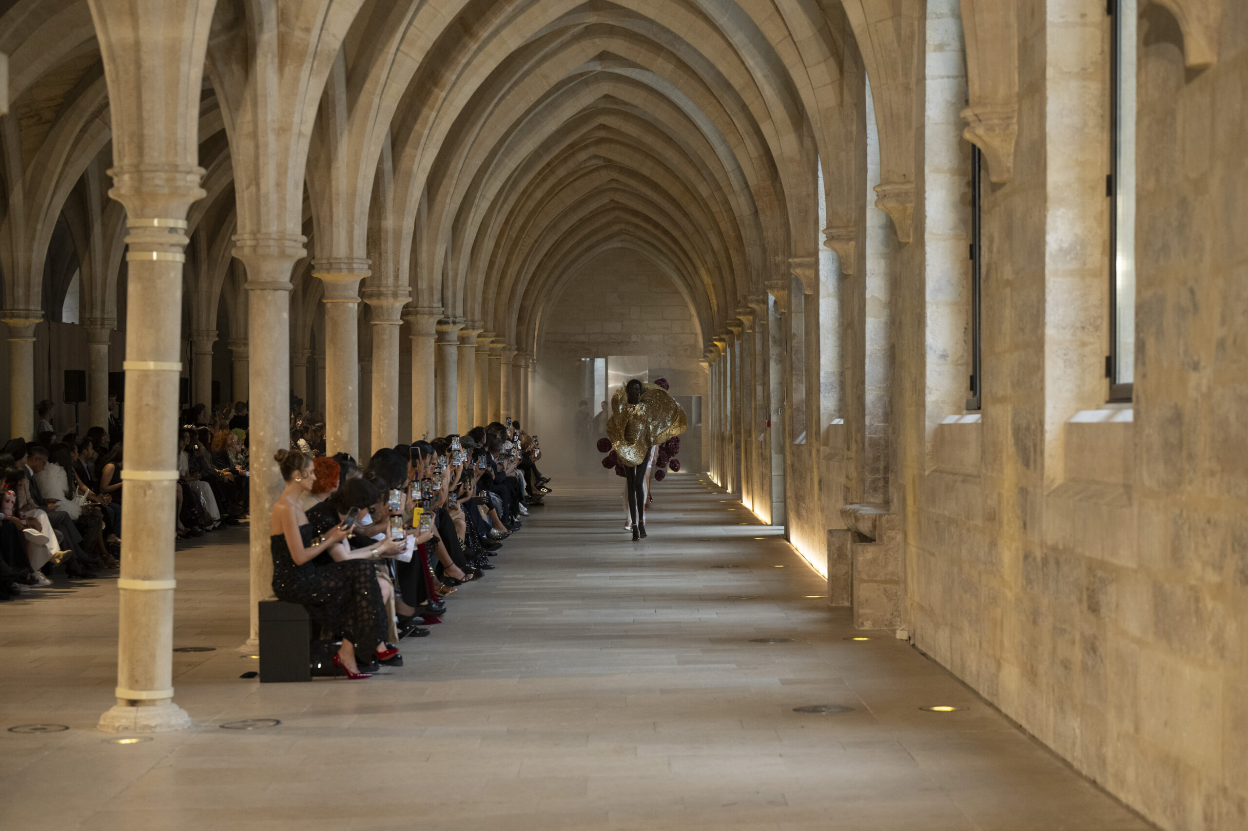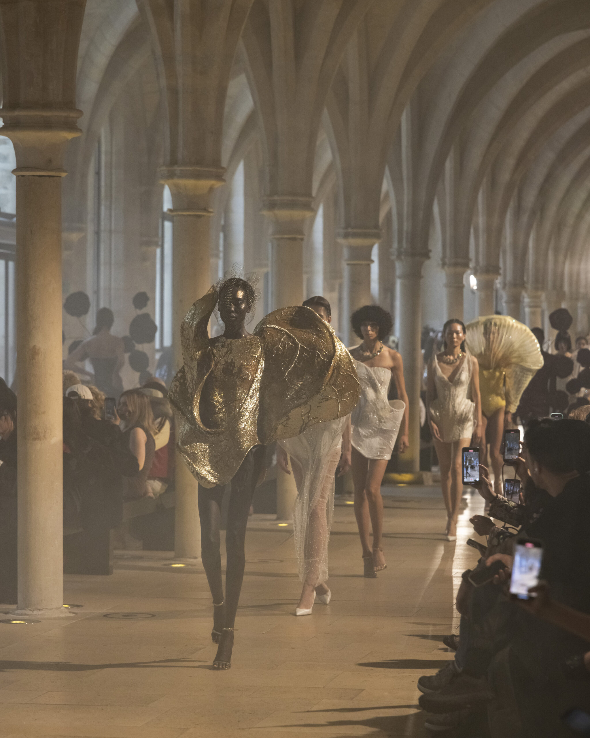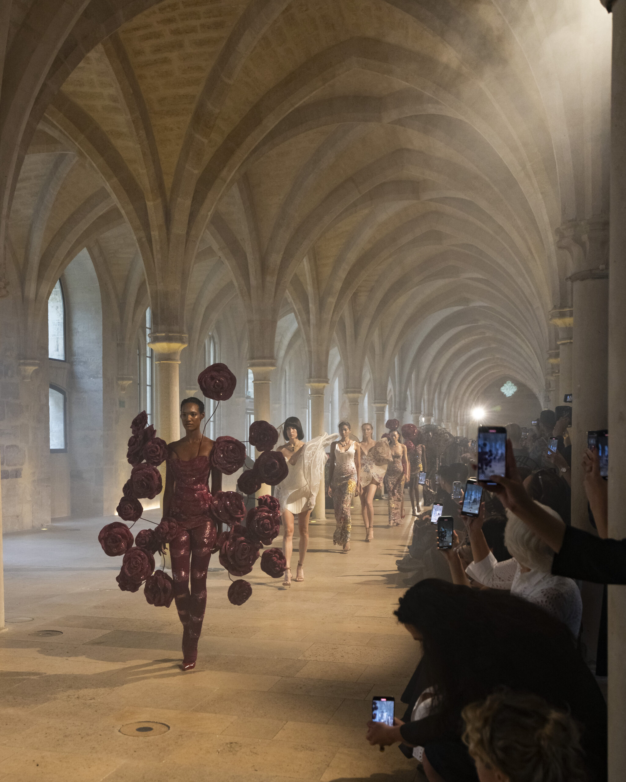 Le maître-modiste londonien orchestre voiles-nuages et tiares sculpturales à l’ampleur quasi baroque. Ses structures, légères comme un souhait, se fondent dans le récit jusqu’à devenir « dialogue silencieux » selon Mishra. Chaque pièce souligne la tension entre révélation et retrait : ce que la robe dévoile, le voile le ré-enfouit, poussant la collection vers une théâtralité méditative.