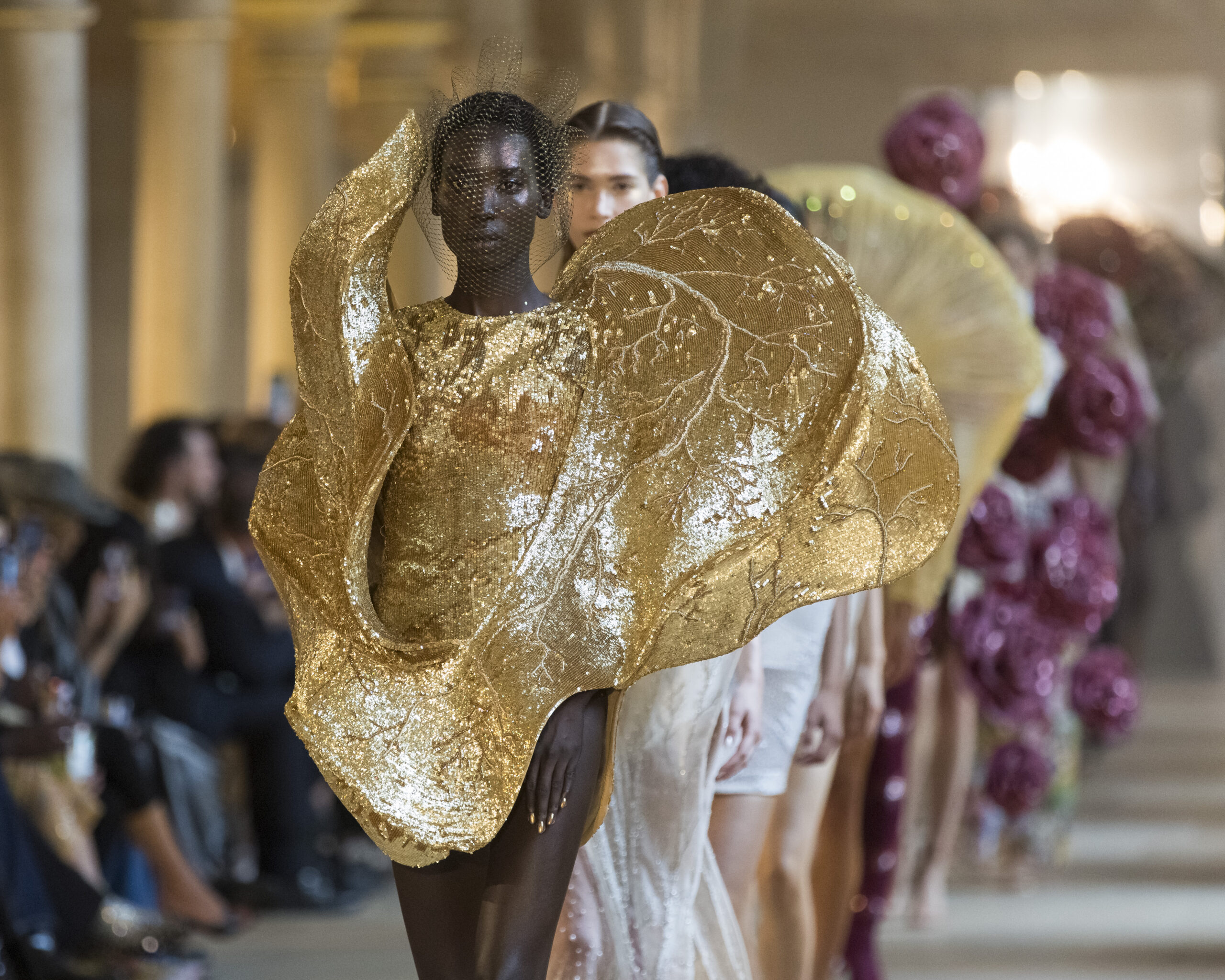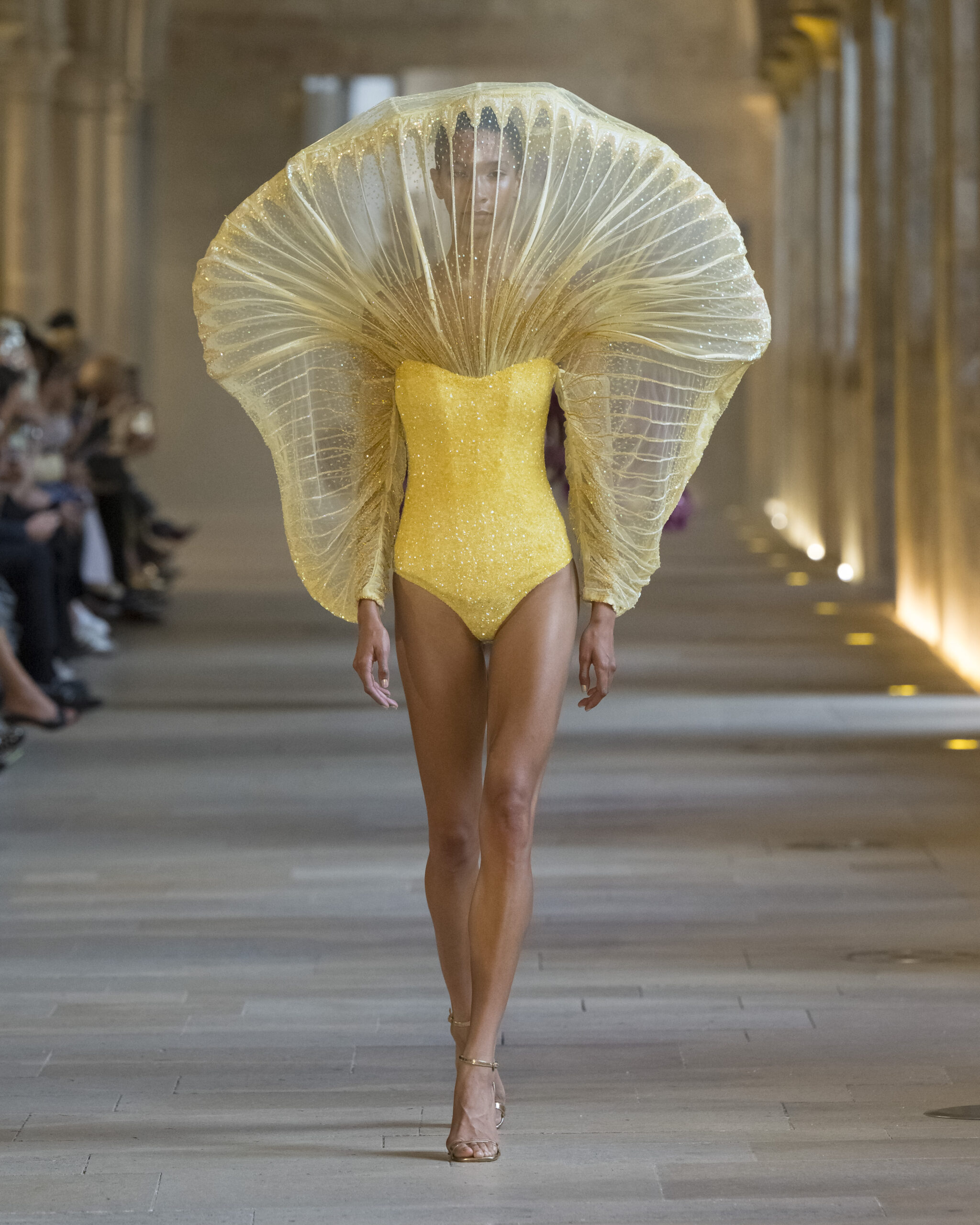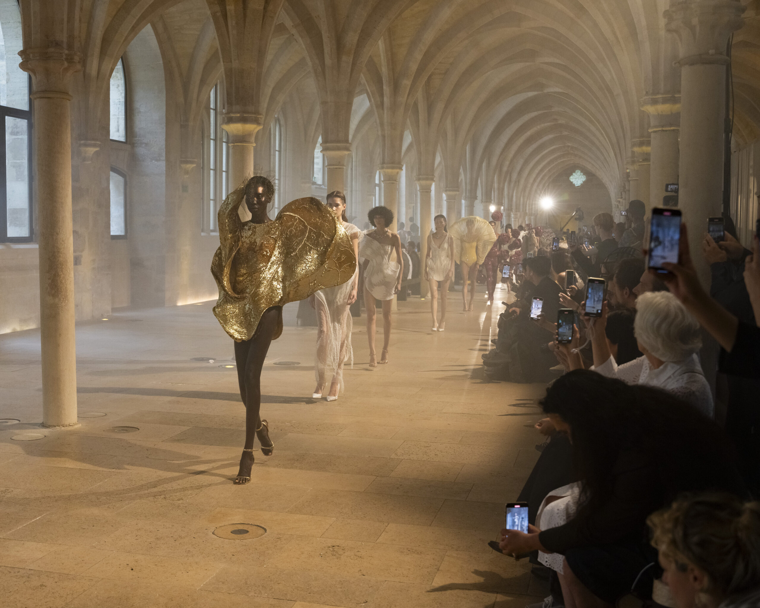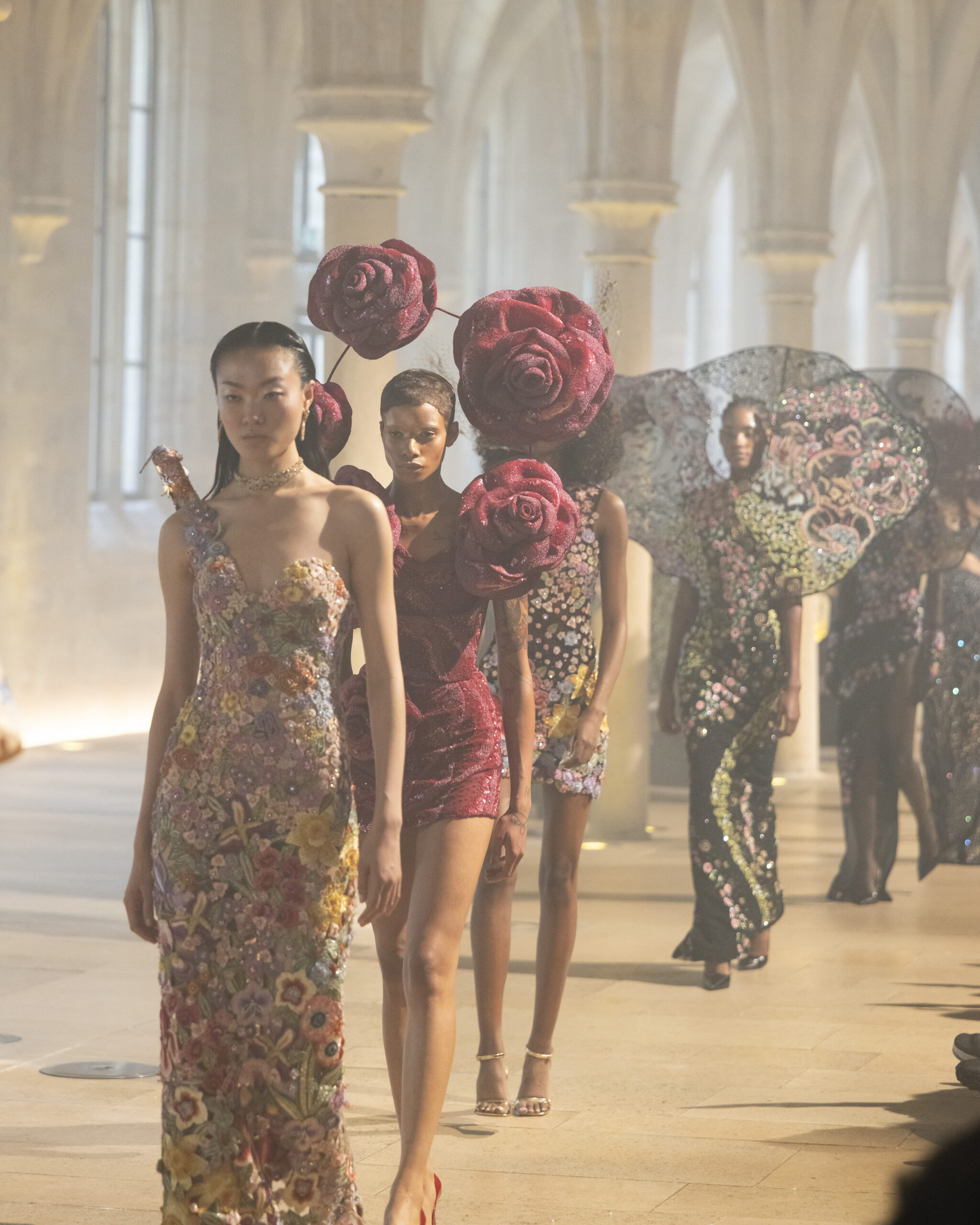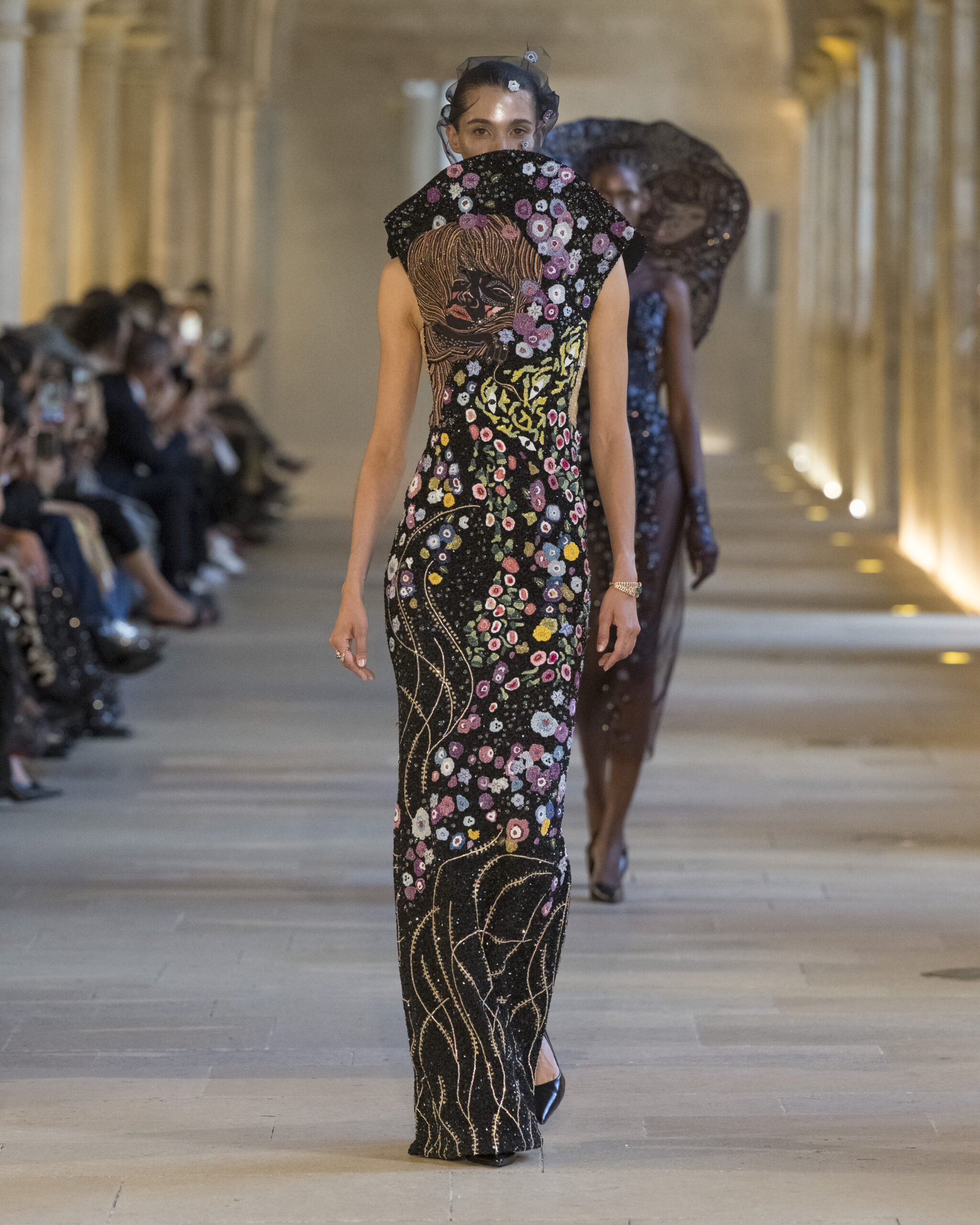Le maître-modiste londonien orchestre voiles-nuages et tiares sculpturales à l’ampleur quasi baroque. Ses structures, légères comme un souhait, se fondent dans le récit jusqu’à devenir « dialogue silencieux » selon Mishra. Chaque pièce souligne la tension entre révélation et retrait : ce que la robe dévoile, le voile le ré-enfouit, poussant la collection vers une théâtralité méditative.
