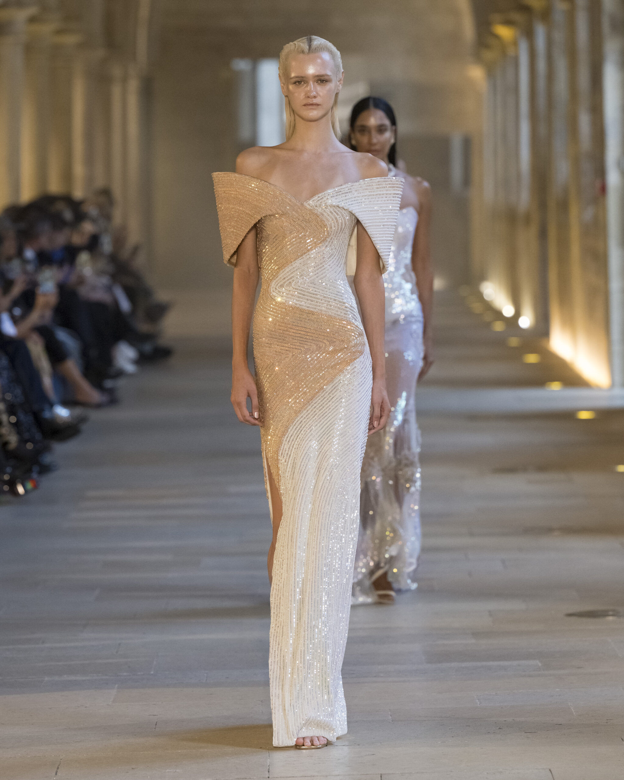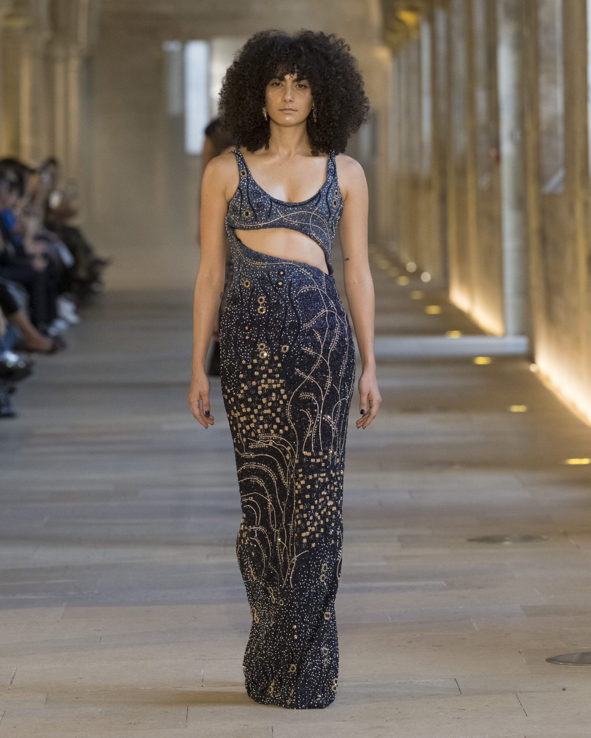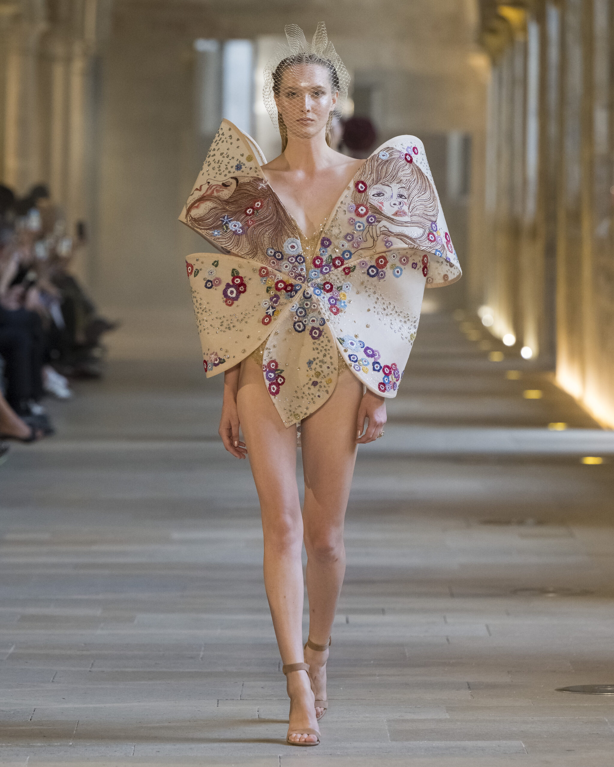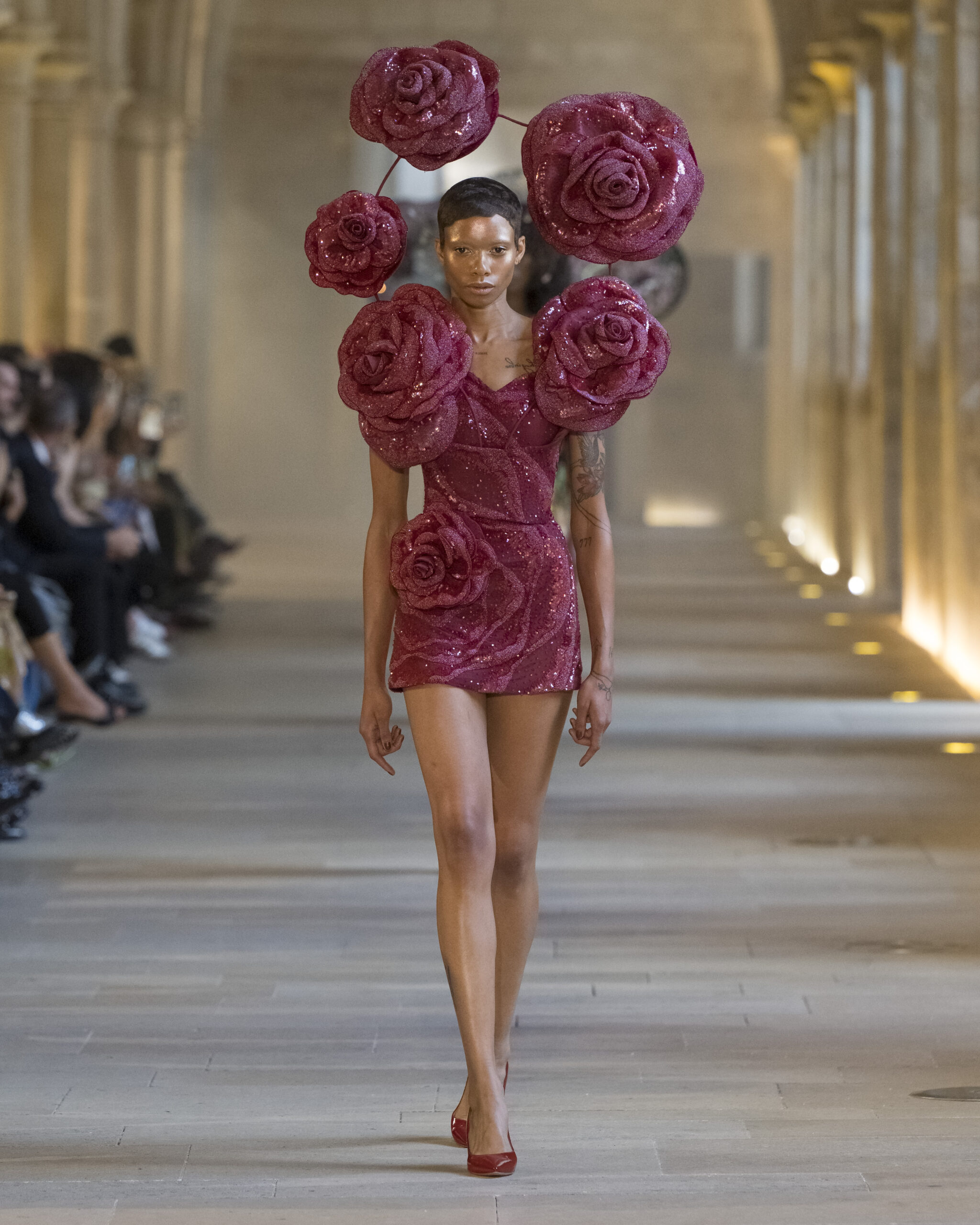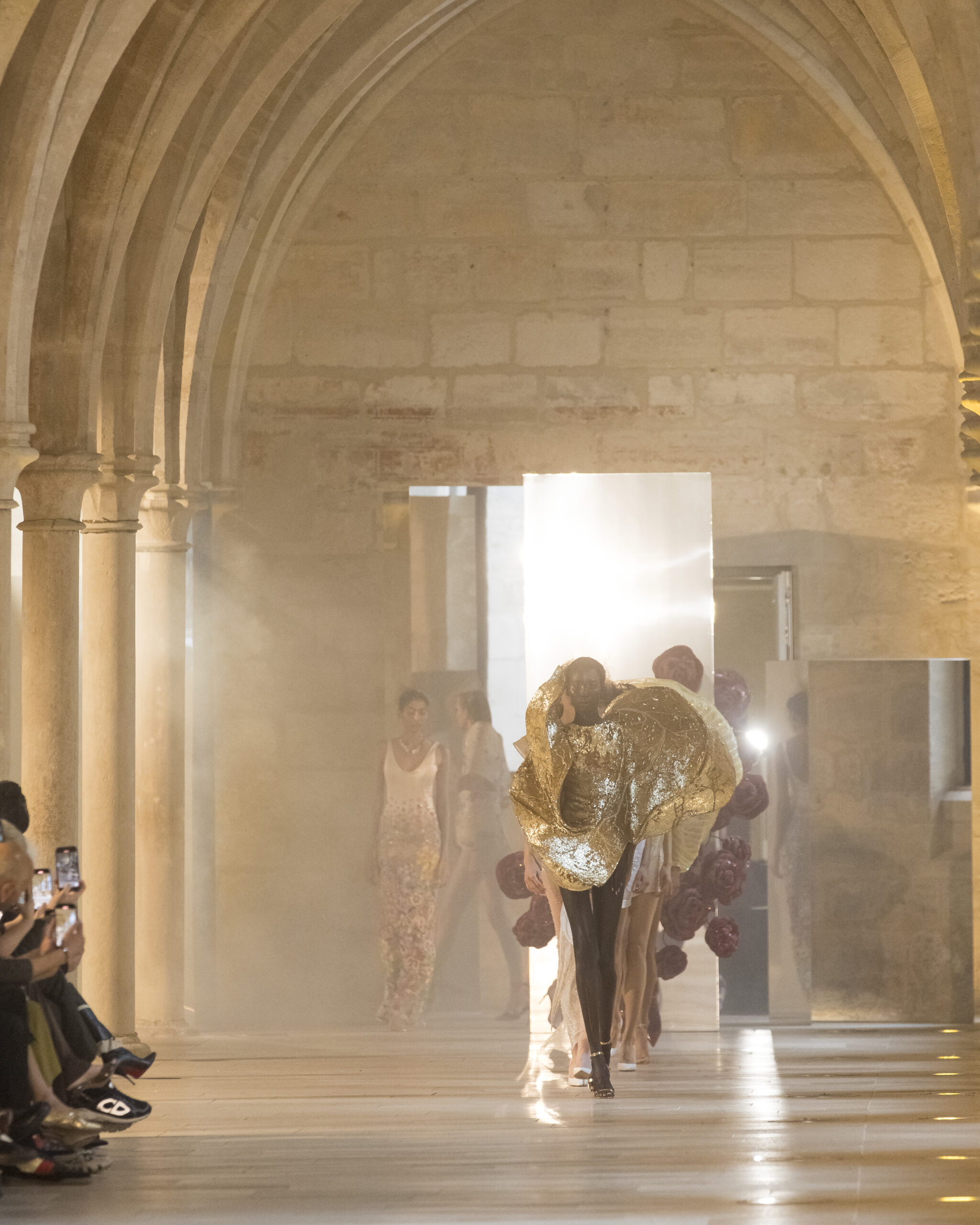 Le maître-modiste londonien orchestre voiles-nuages et tiares sculpturales à l’ampleur quasi baroque. Ses structures, légères comme un souhait, se fondent dans le récit jusqu’à devenir « dialogue silencieux » selon Mishra. Chaque pièce souligne la tension entre révélation et retrait : ce que la robe dévoile, le voile le ré-enfouit, poussant la collection vers une théâtralité méditative.