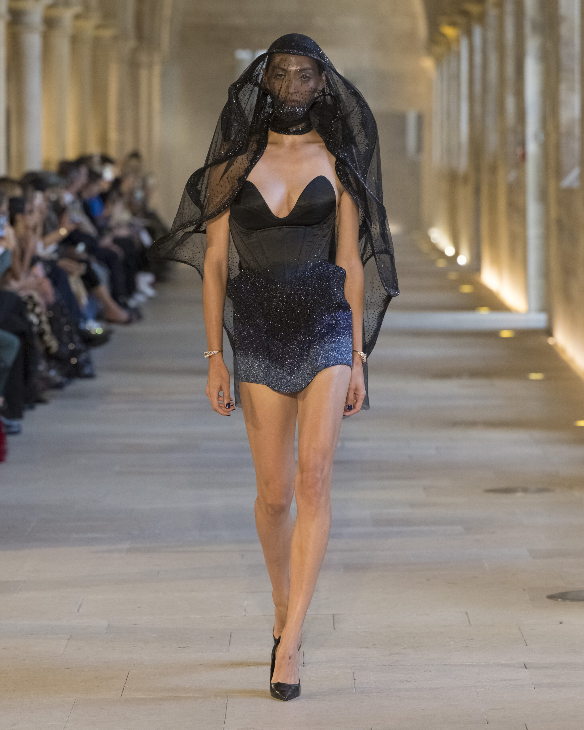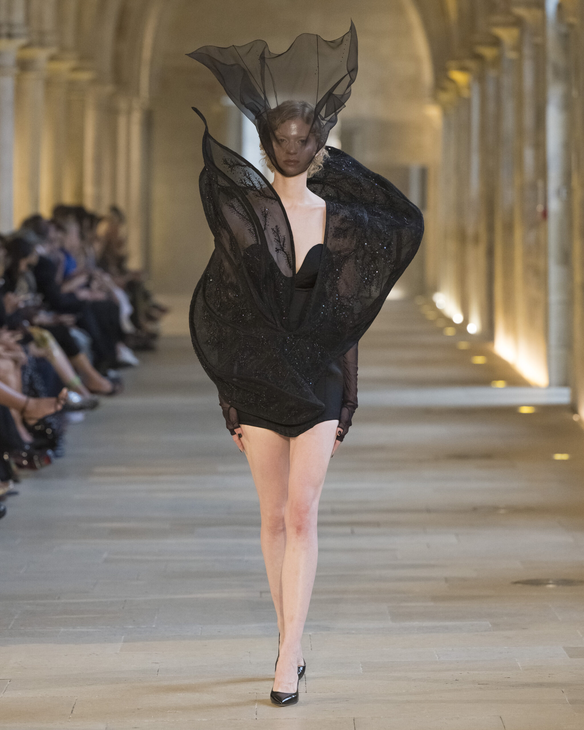 Chapitre Mort : rideau noir absolu, silhouette gommée, seul subsiste un voile opaque de Stephen Jones qui dissout visage, genre, ego.