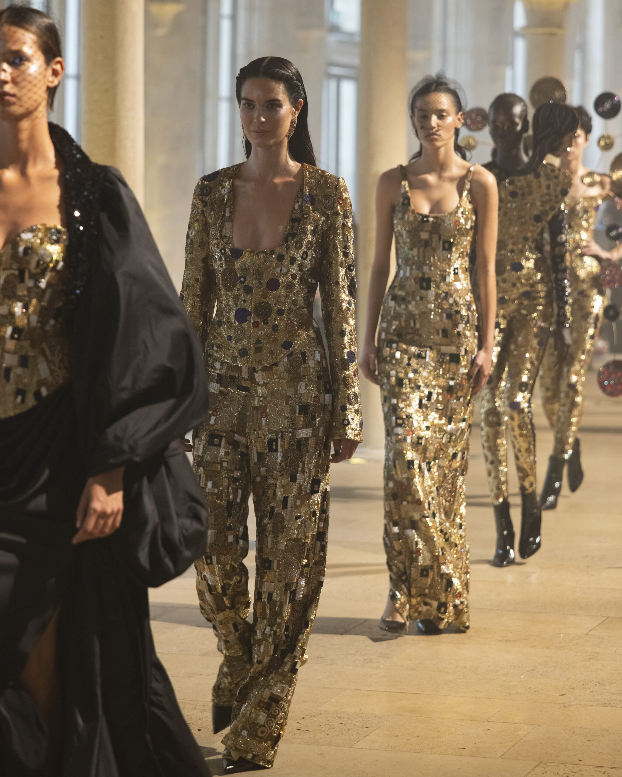 À mesure que la bande sonore psalmodie des vers persans, les silhouettes s’irisent de l’or vibrant de Gustav Klimt, clin d’œil assumé au « Baiser » que Mishra garde sur sa table de dessins. Les robes « Heart of Gold » et « Wild Rose » — corset éclaté, leggings 2D — transposent les aplats du peintre en mosaïques de paillettes kundan et de perles d’eau douce, posées au crochet aari jusque dans les recoins les plus secrets du tulle.