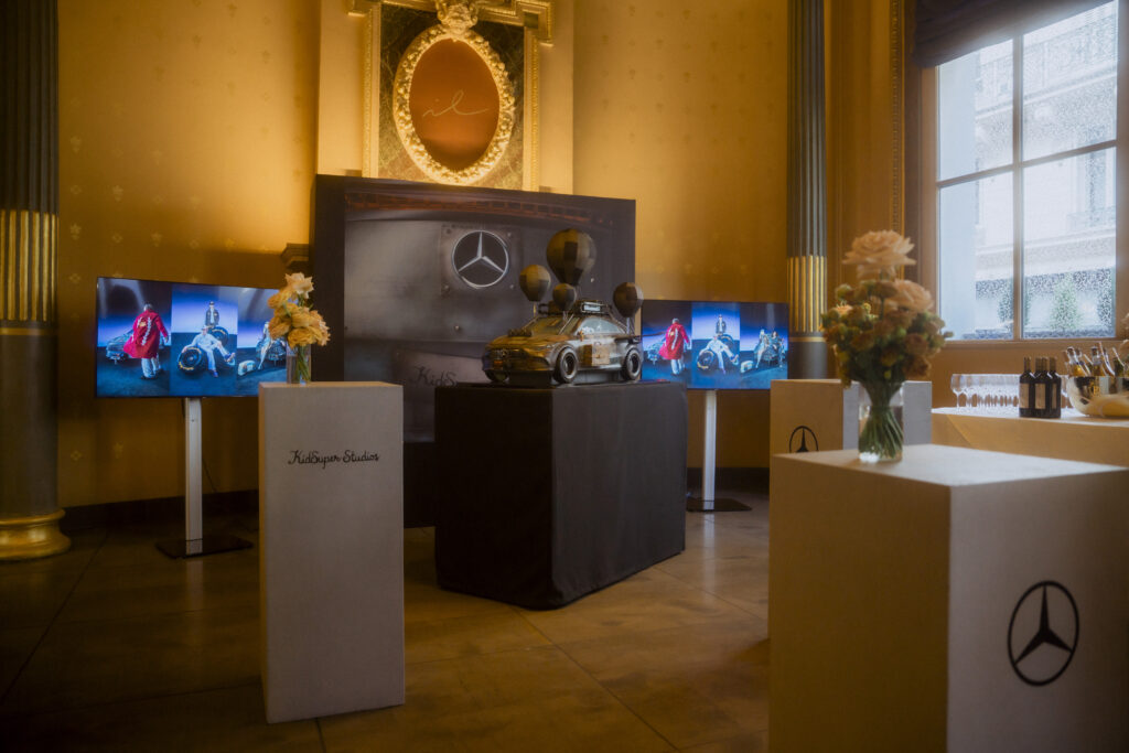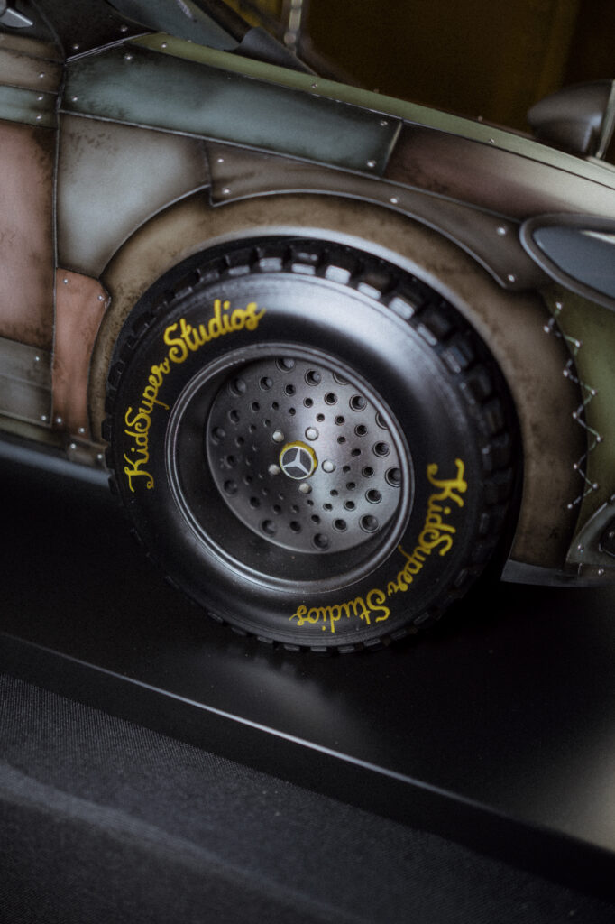 Dévoilé dans le prestigieux cadre du Musée des Arts Décoratifs, le CLA revisité par KidSuper ressemble à une voiture de bande dessinée : ailes turbines, détails de ballons, treuil frontal, galerie de toit de rallye, et même un lance-pierre nostalgique en clin d’œil à l’enfance. Le tout ponctué par le motif emblématique de KidSuper : le “Kissing Face”.
