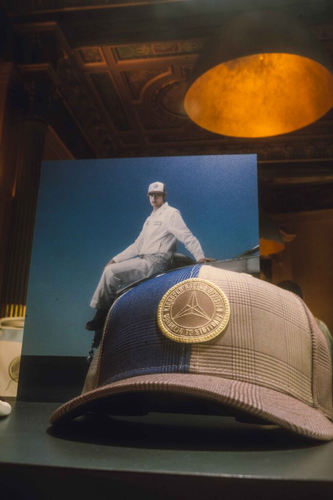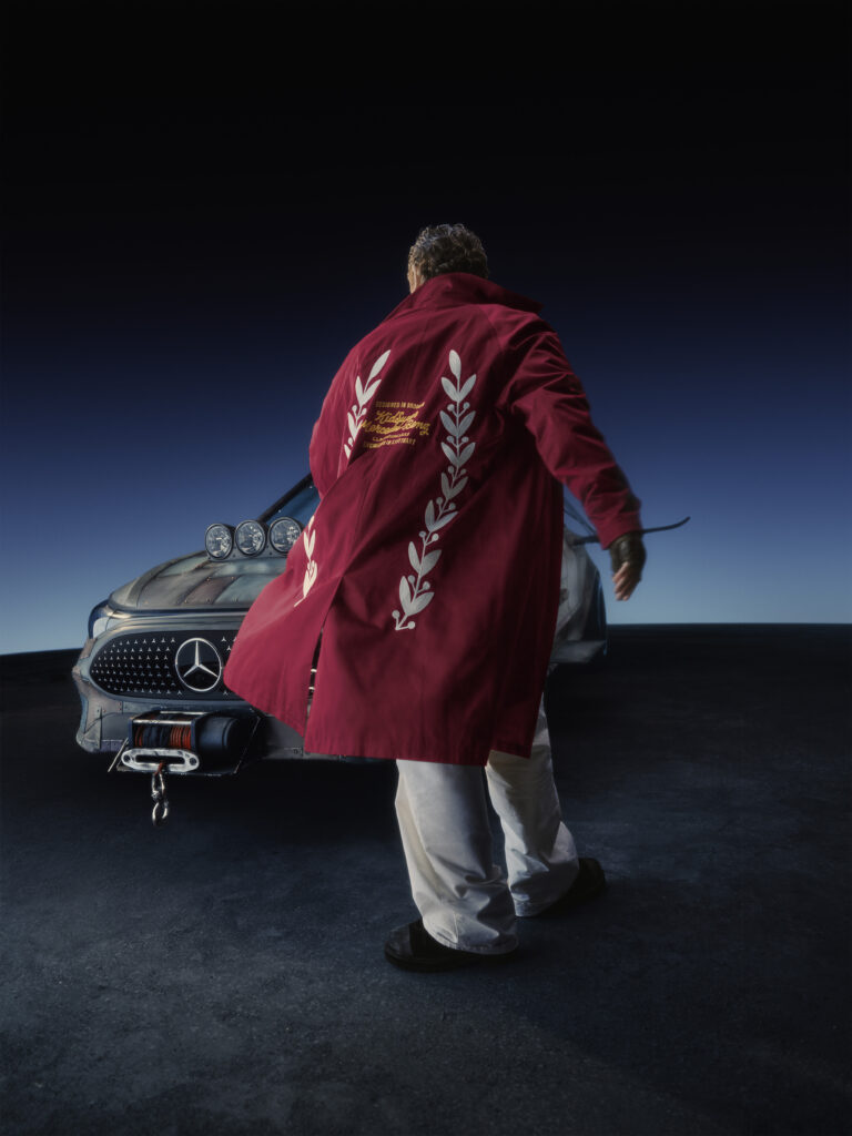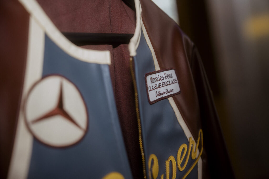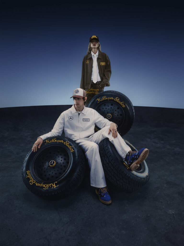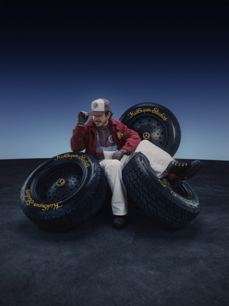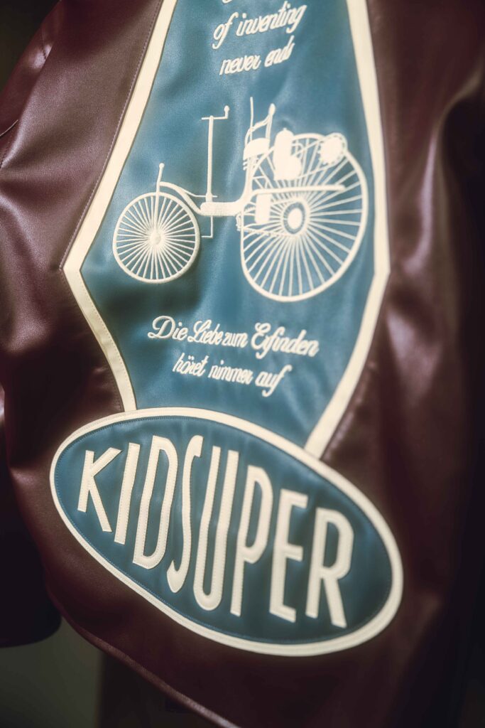 KidSuper ne s’arrête pas à l’automobile. Il prolonge l’expérience avec une capsule de 13 pièces, fusion de tailoring, de vêtements d’atelier, et de vibes rétro américaines. Matériaux nobles (jersey, coton, laine, cuir vegan), silhouettes utilitaires et logos vintage de Mercedes-Benz forment une grammaire stylistique unique. Mention spéciale à un T-shirt rendant hommage à la “Patent Motorwagen”, premier véhicule automobile de l’histoire.