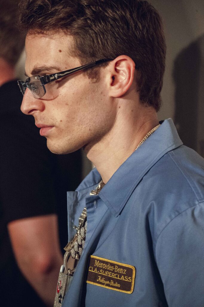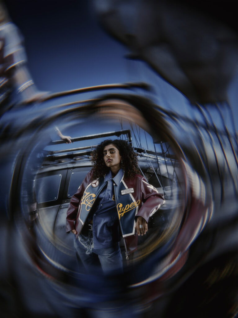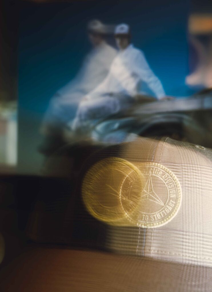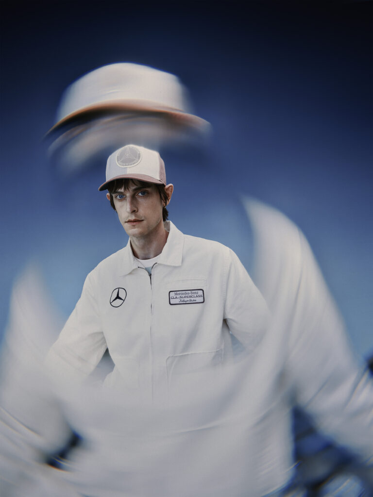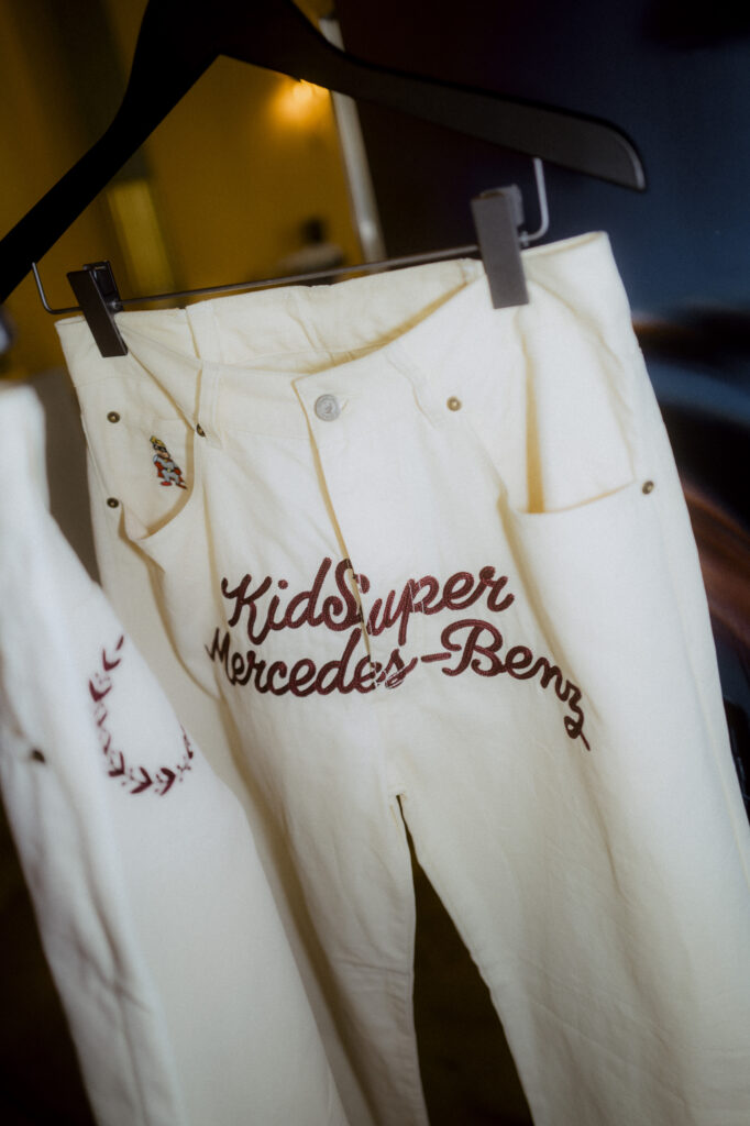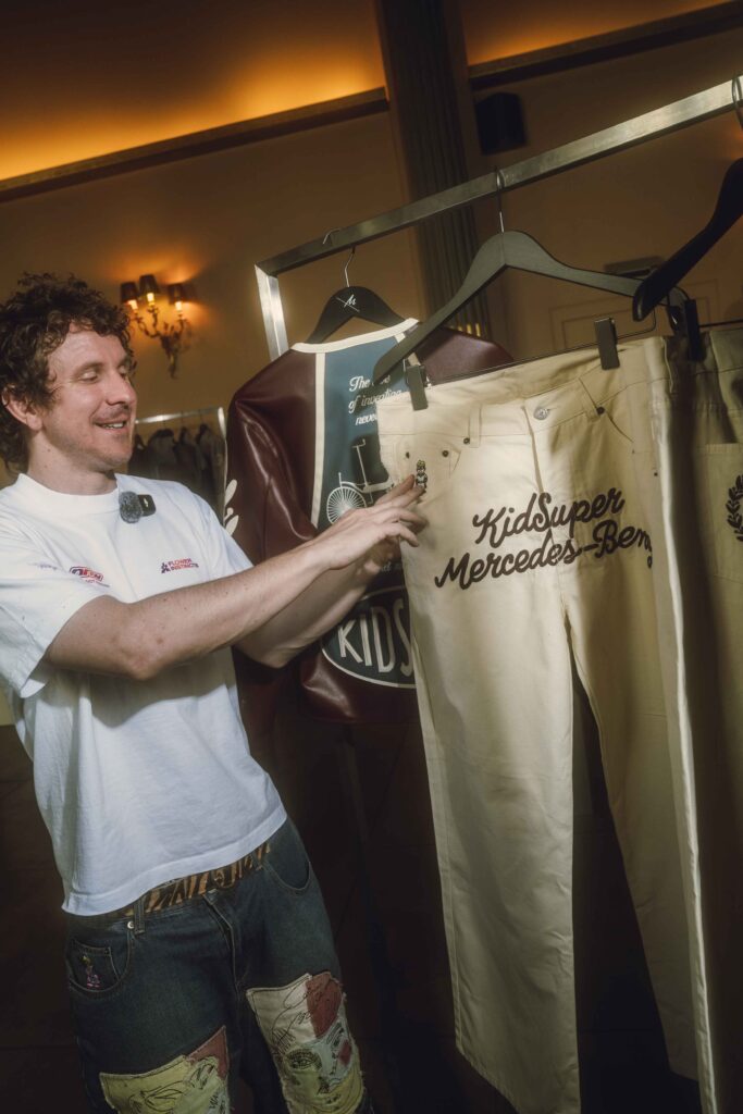 KidSuper ne s’arrête pas à l’automobile. Il prolonge l’expérience avec une capsule de 13 pièces, fusion de tailoring, de vêtements d’atelier, et de vibes rétro américaines. Matériaux nobles (jersey, coton, laine, cuir vegan), silhouettes utilitaires et logos vintage de Mercedes-Benz forment une grammaire stylistique unique. Mention spéciale à un T-shirt rendant hommage à la “Patent Motorwagen”, premier véhicule automobile de l’histoire.