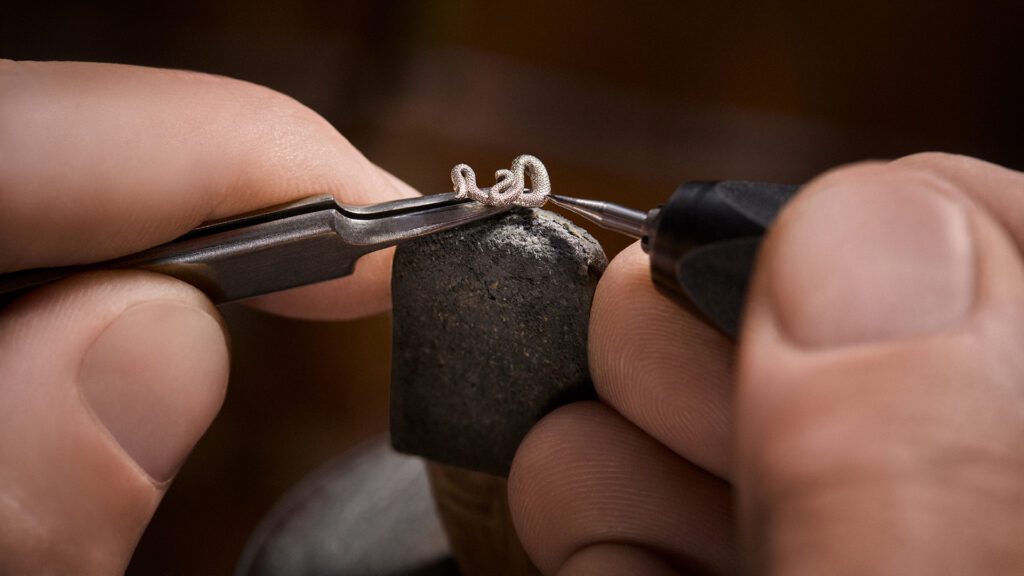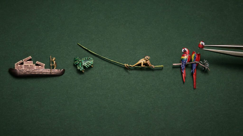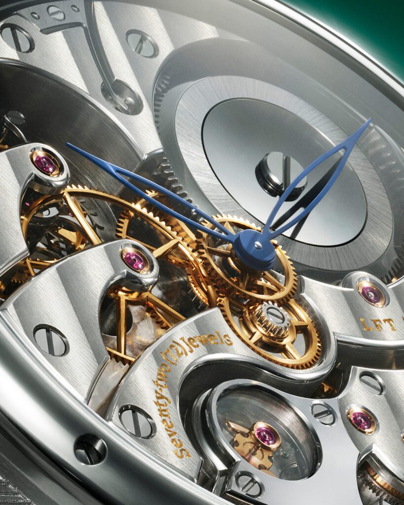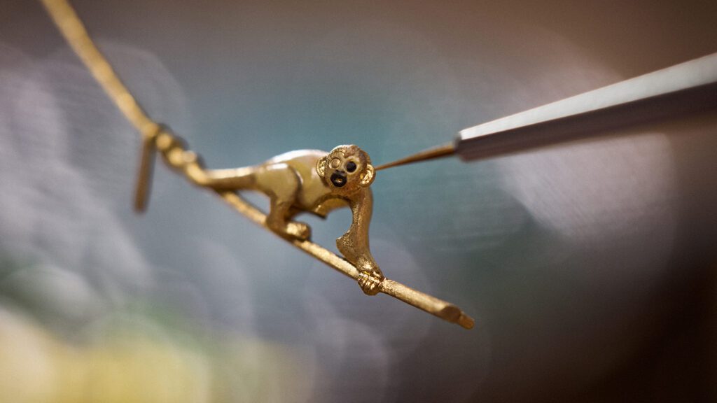 Sur le cadran, un théâtre miniature se déploie : une pirogue glisse entre les feuillages d’or sculptés à la main, sous le regard espiègle d’un singe, de deux perroquets articulés, d’un serpent ondulant et d’une boussole en or rose tournoyant. Sept automates, quinze éléments animés, tous mus par un calibre mécanique à remontage manuel LFT AU14.03, le plus complexe jamais conçu par la Maison. Ajoutez-y une répétition minute, un tourbillon et un affichage des heures et minutes au dos du boîtier : l’art du voyage rencontre ici l’horlogerie de complication.