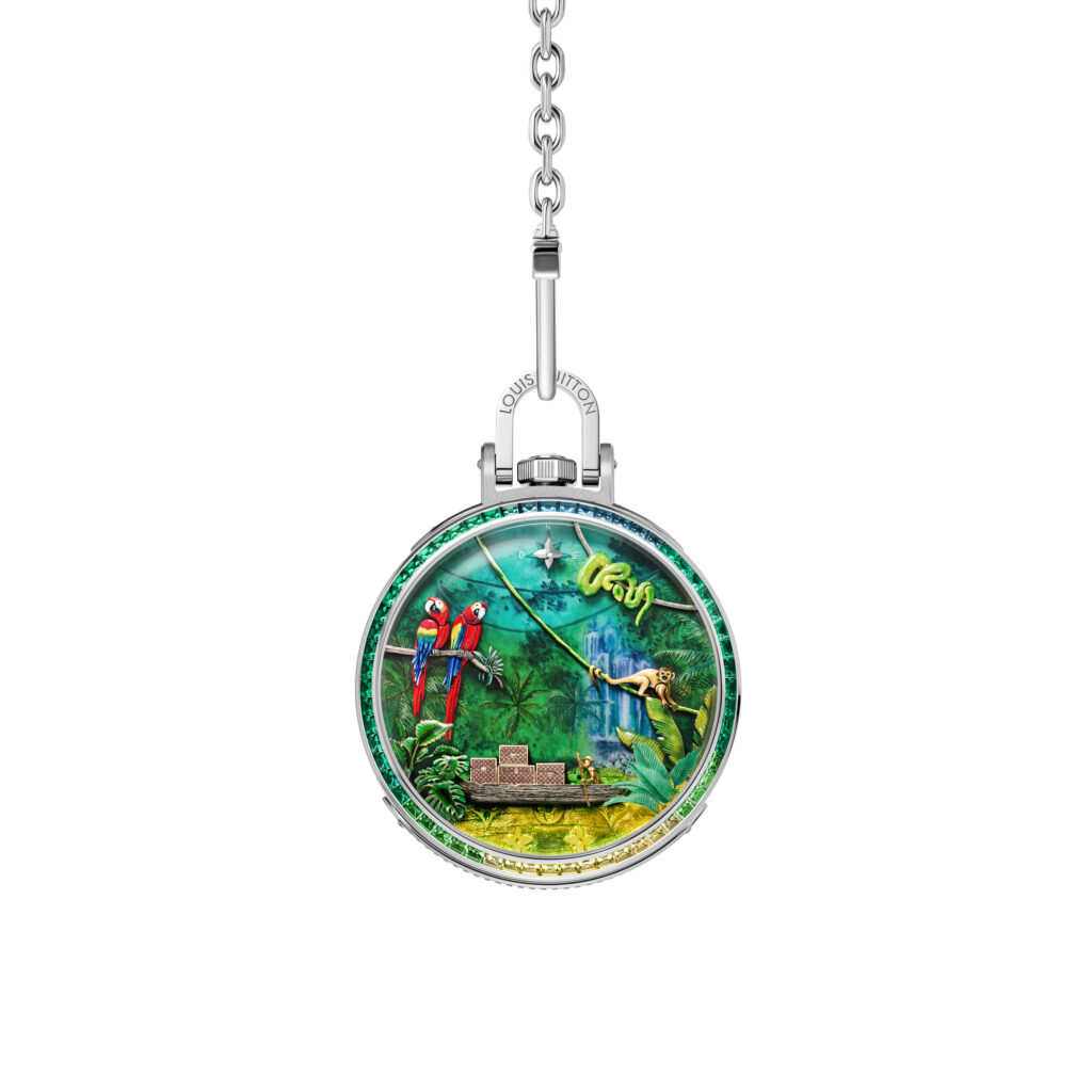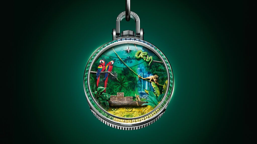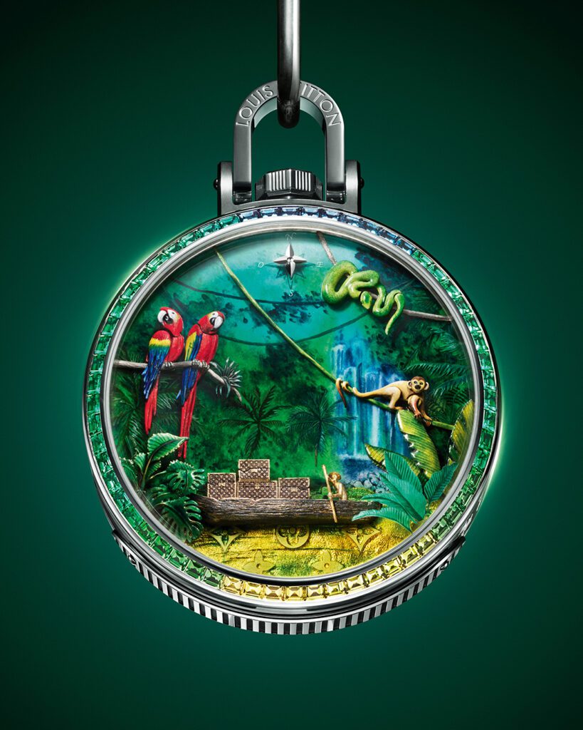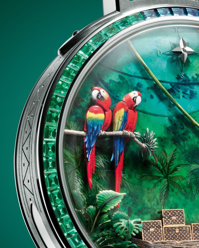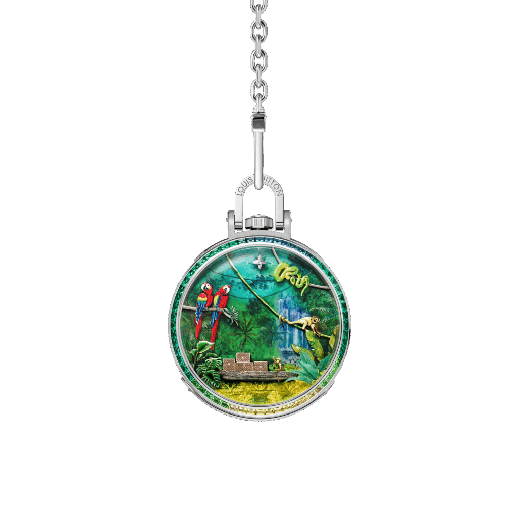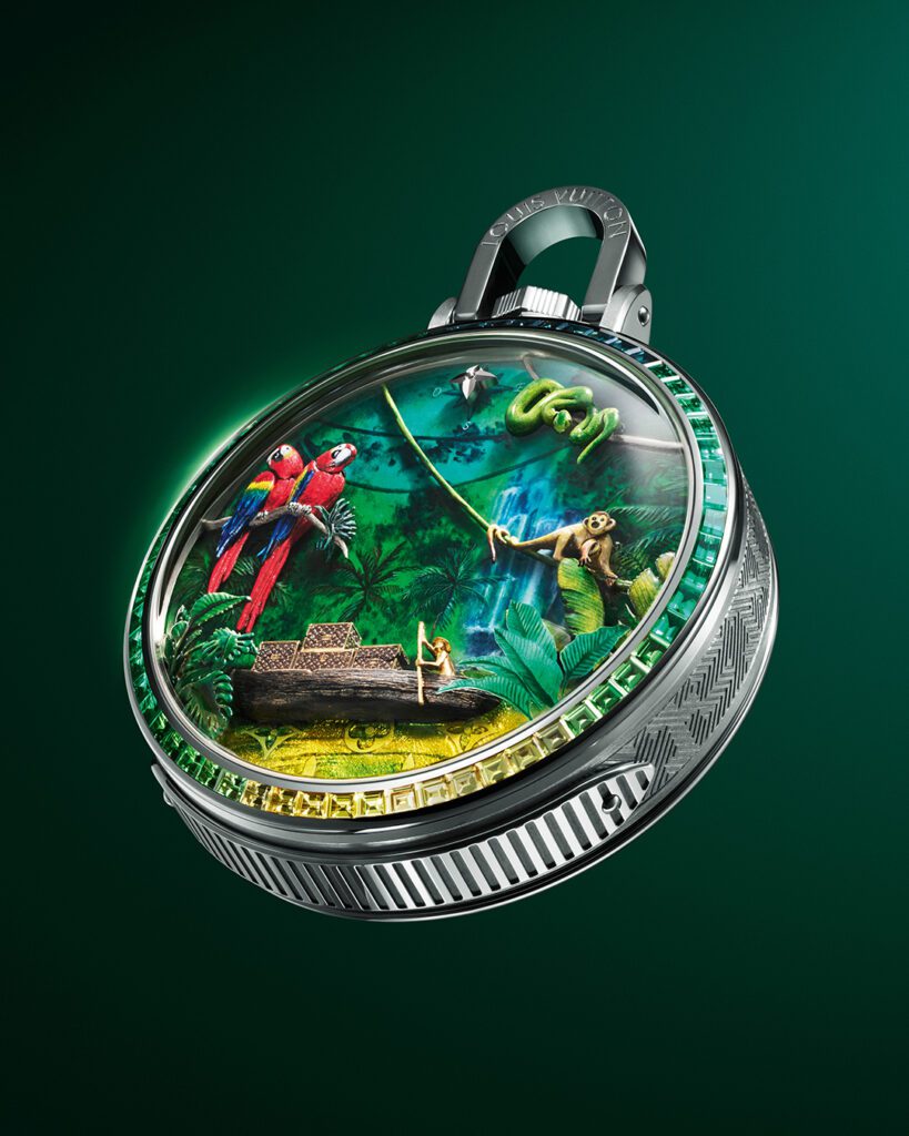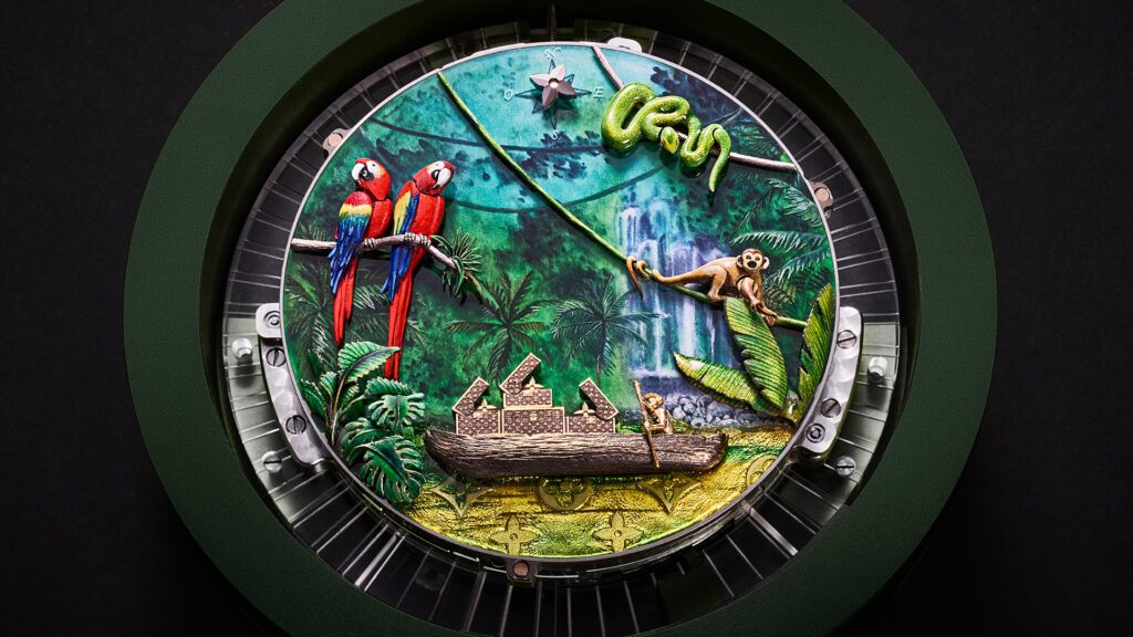 Chaque détail rend hommage à l’héritage du malletier visionnaire : les malles Louis Vuitton miniatures qui s’ouvrent, les reflets cristallins du fleuve obtenus par émail paillonné, les motifs amazonien gravés sur la carrure. Le boîtier de 50 mm en or blanc, serti de 60 pierres précieuses aux teintes tropicales (émeraudes, tsavorites, tourmalines, saphirs jaunes), évoque une jungle luxuriante en mouvement. Un exploit d’orfèvrerie où même la glace saphir bombée se pare d’émail miniature.