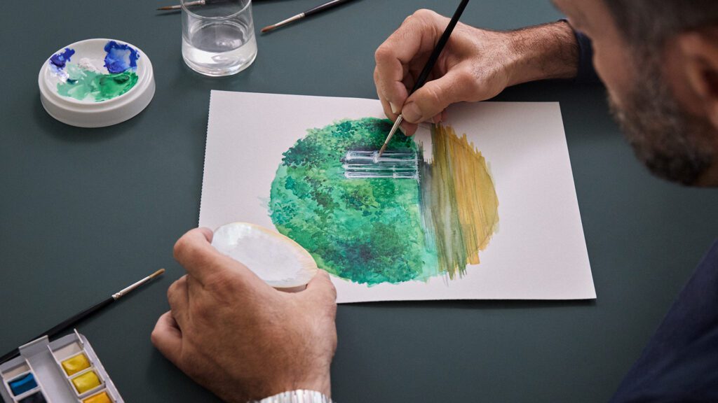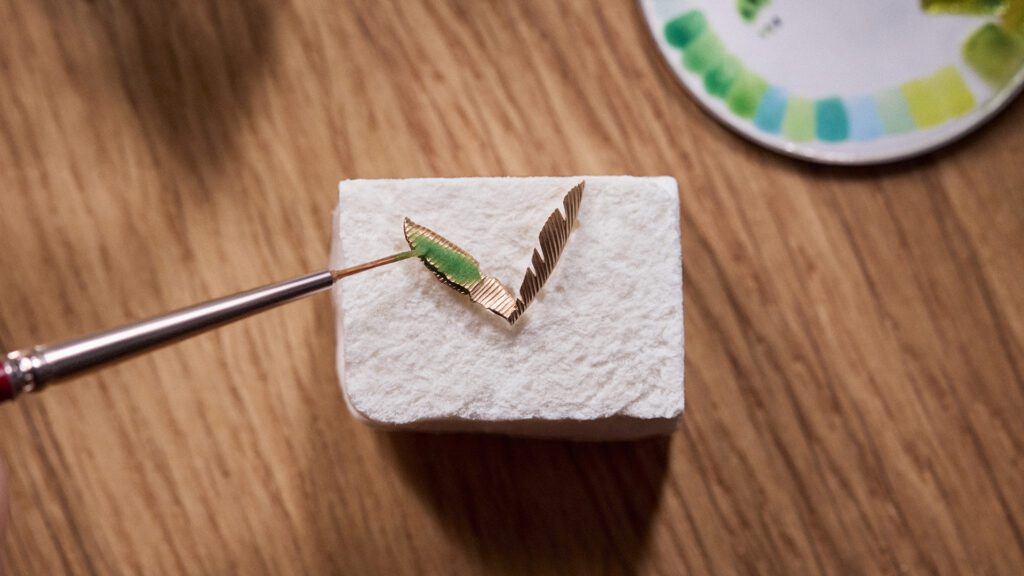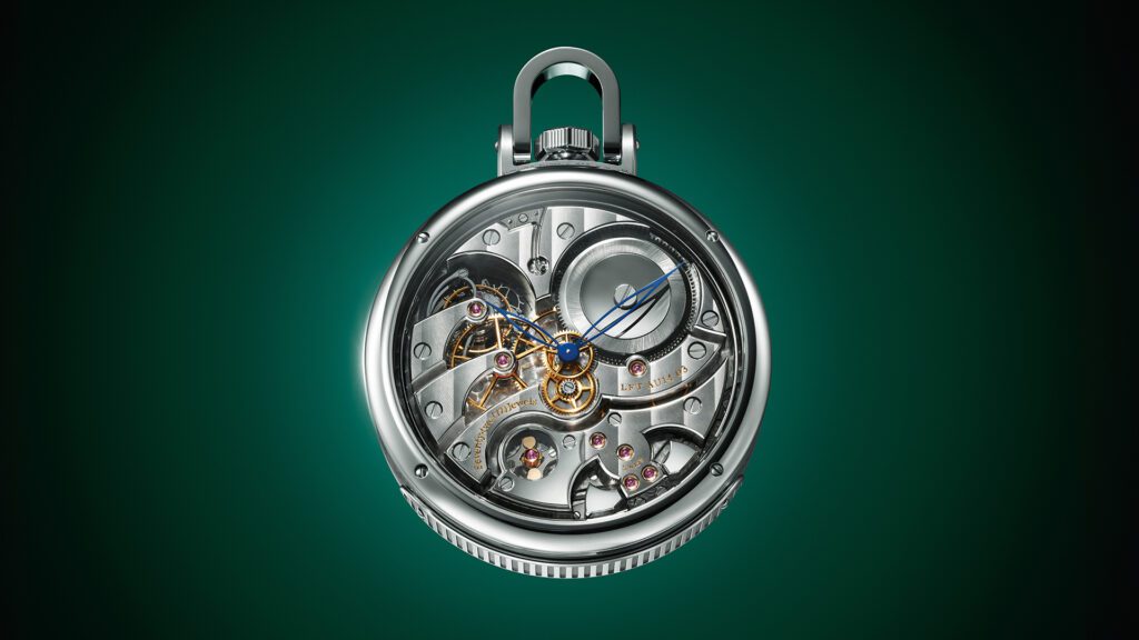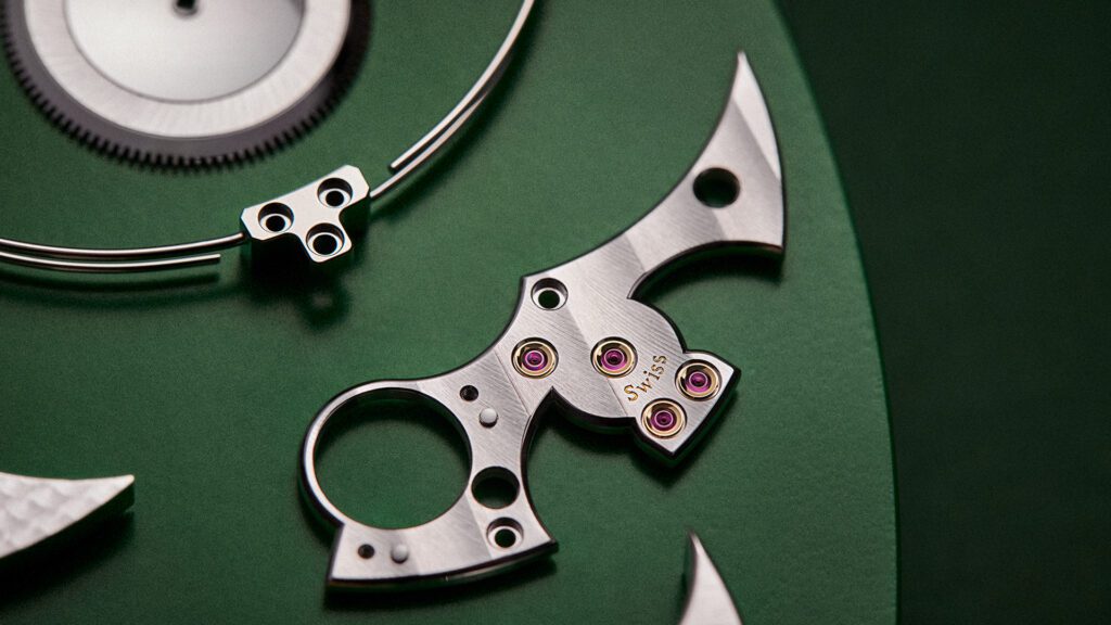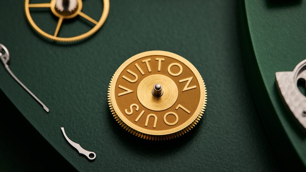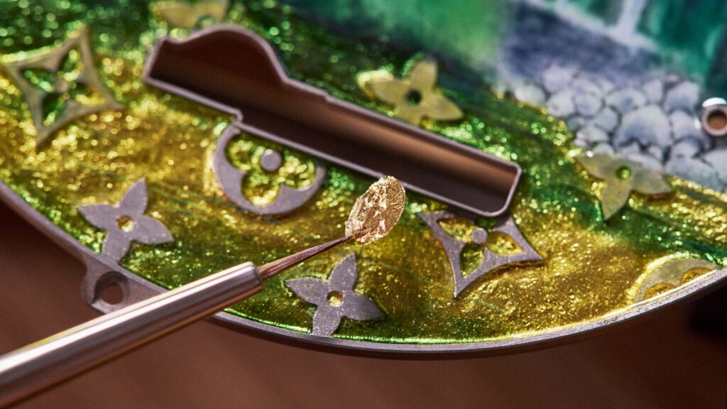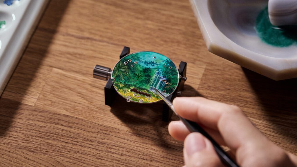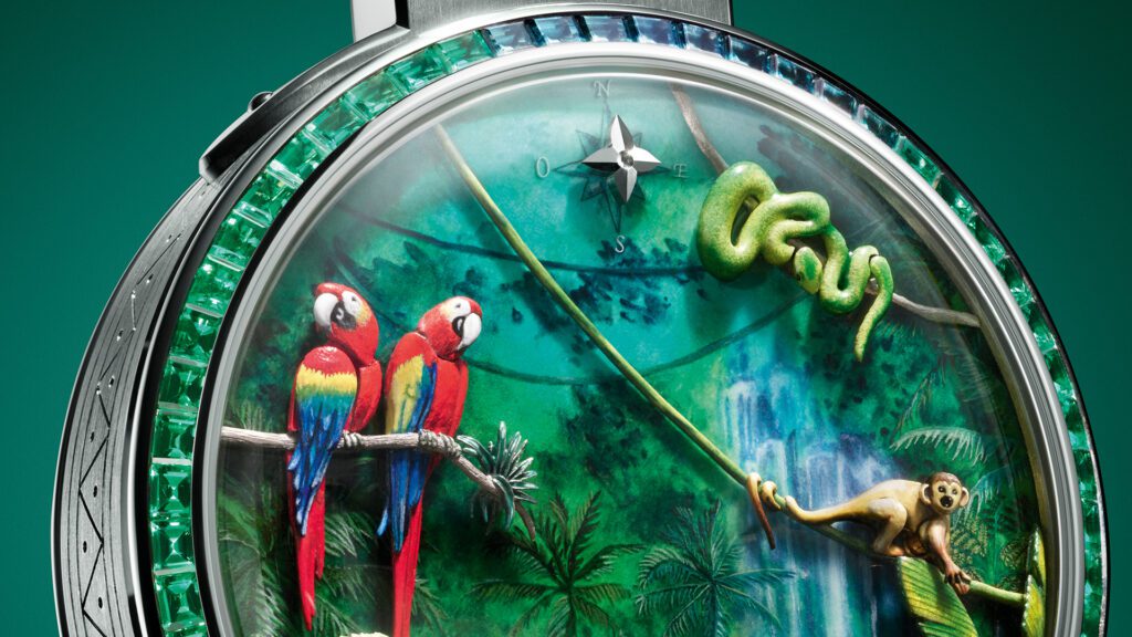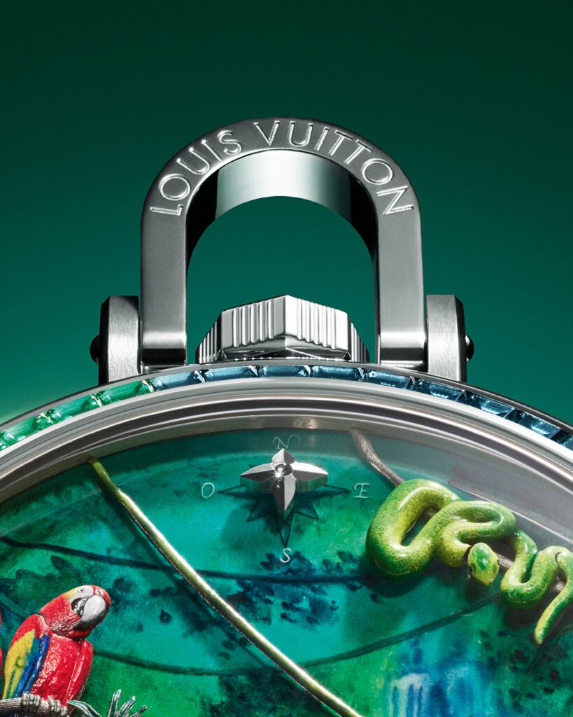 Chaque détail rend hommage à l’héritage du malletier visionnaire : les malles Louis Vuitton miniatures qui s’ouvrent, les reflets cristallins du fleuve obtenus par émail paillonné, les motifs amazonien gravés sur la carrure. Le boîtier de 50 mm en or blanc, serti de 60 pierres précieuses aux teintes tropicales (émeraudes, tsavorites, tourmalines, saphirs jaunes), évoque une jungle luxuriante en mouvement. Un exploit d’orfèvrerie où même la glace saphir bombée se pare d’émail miniature.