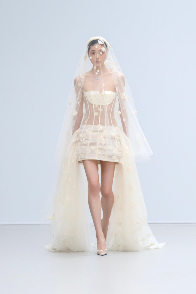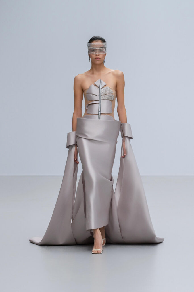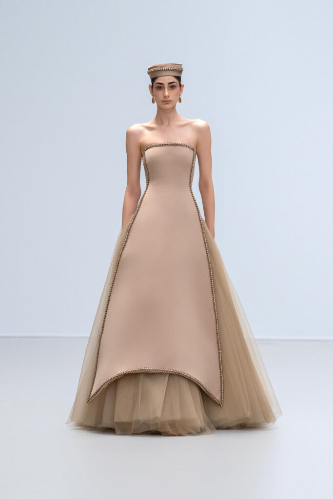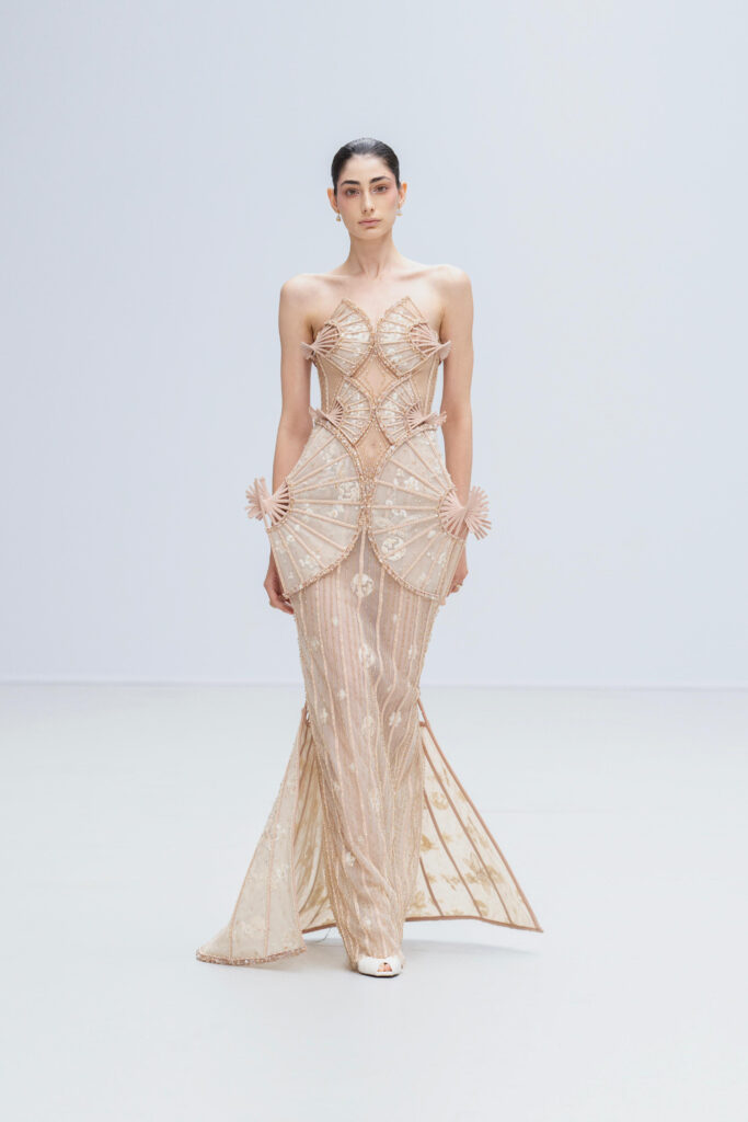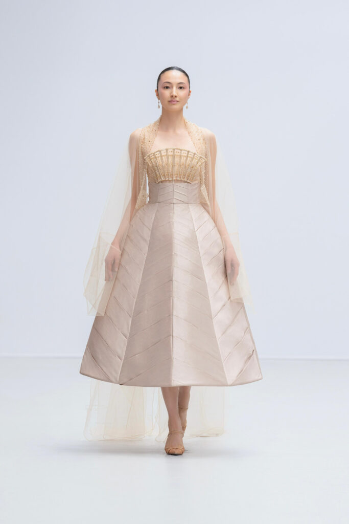 Une ** feuille de bananier ** se déploie en crinoline d’organza ciselée ; un papier-vent reparaît en éventail brodé de cristal greffé à la taille ; le nón lá se métaphorise en corset tressé de cordes soyeuses, incrusté d’éclats stardust. Rien de folklorique : Phan Huy effleure le souvenir plutôt qu’il ne l’illustre, dosant la précision du motif et la légèreté du geste.