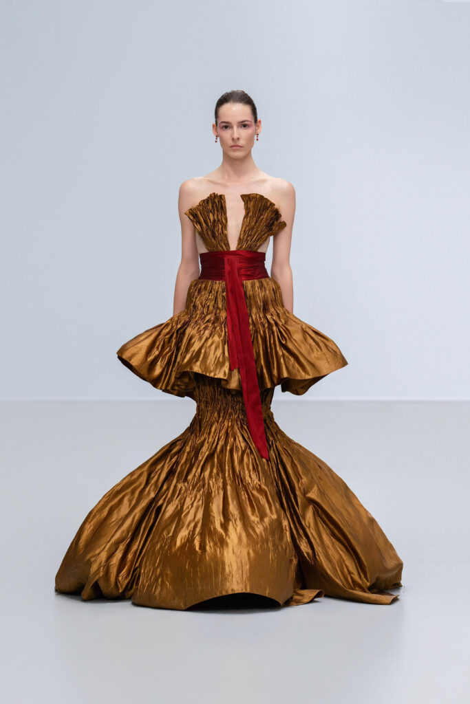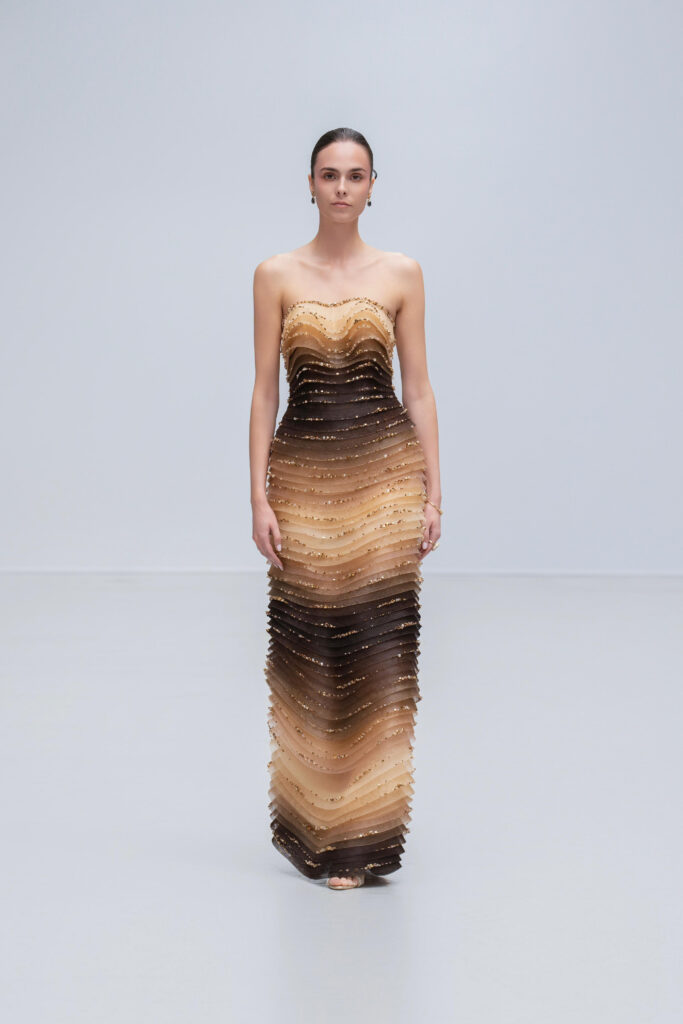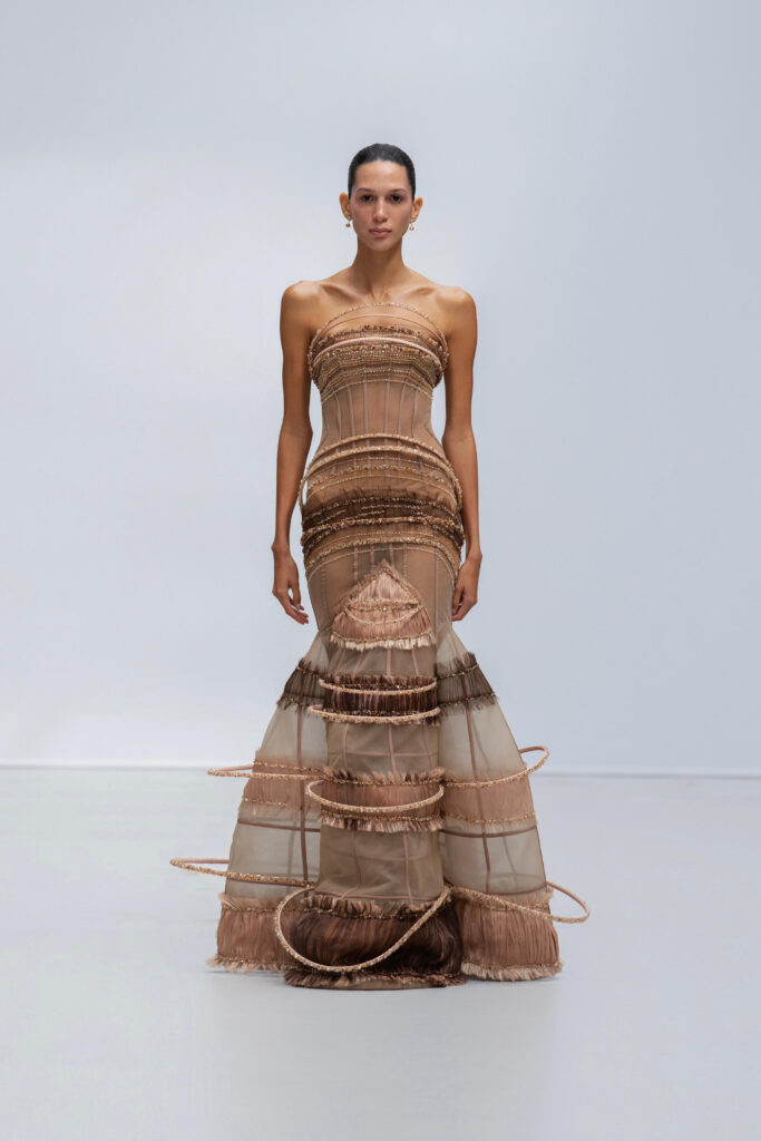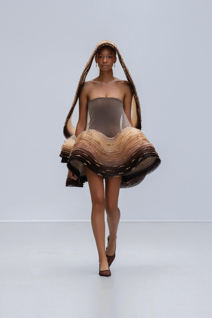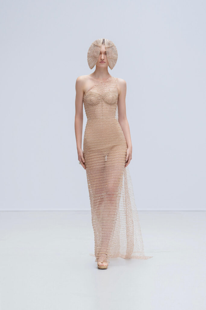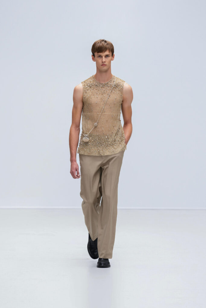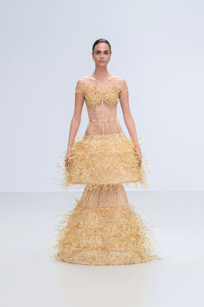 Le créateur pousse plus loin sa maille élastique irisée : un voile polymorphe qui capte la lumière et épouse la gestuelle telle l’onde d’un ruisseau. Sur d’autres looks, un tressage à la manière des paniers de pêche devient basque architecturale ; le techno-plissé évoque les sillons d’une rizière à flanc de colline. La palette terreuse — jaune “gras de poulet”, brun argile, rouge brique, poussière de chaux, reflets d’argent — renvoie à la mosaïque de couleurs d’un village au couchant.